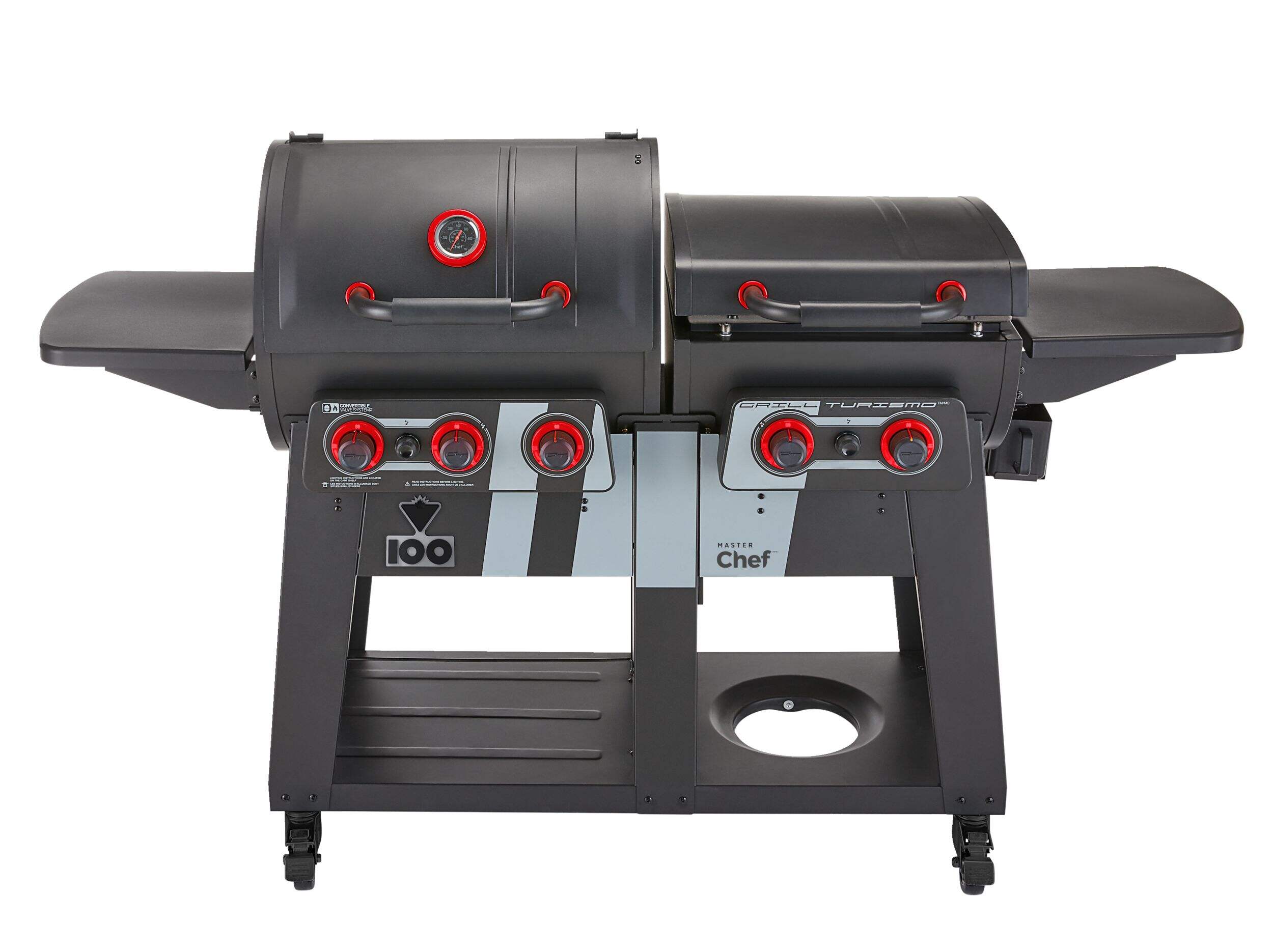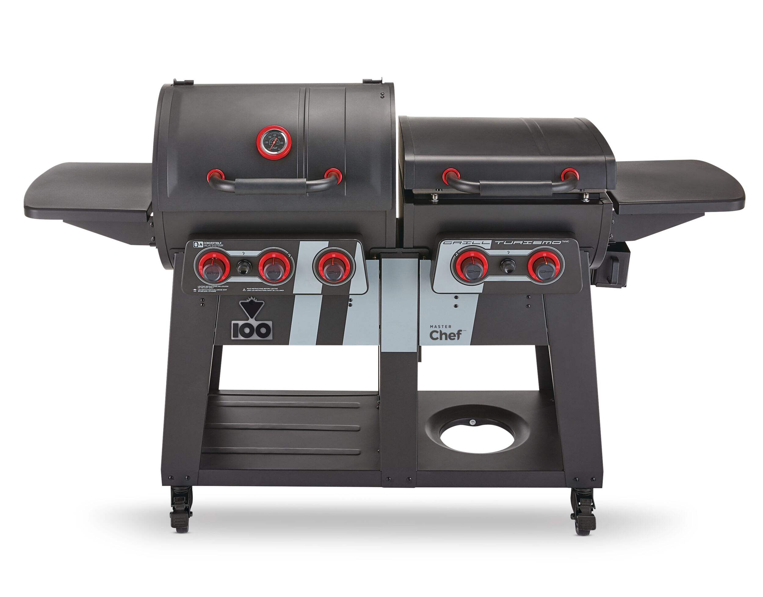 This Grill Turismo Grill and Griddle Combo from MASTER Chef makes cooking for a crowd easier. The convenient combo features 900 sq. in of total cooking area, with a total of five burners producing up to 58,000 BTUs. The grill comes equipped with BBQ side featuring 400 sq. in of primary cooking space, and heavy gauge porcelain steel cooking grates. The griddle side features a hot-rolled steel 340 sq. in griddle that comes with a hinged lid for cooking and storing. An electronic ignition system offers fast and even heating with five large control knobs. The two foldable side shelves make a great prep/storage area for food and grilling utensils. A side access grease cup allows for a quick and easy cleanup after cooking. This combo sits on four lockable casters that allow for easy mobility and transport as needed. Perfect for cooking all kinds of meals outdoors, this BBQ grill and griddle combo is sure to become a family favourite. Burners are made with a sturdy stainless steel construction that ensures long-term use, this grill and griddle combo will keep things cooking for many seasons to come.