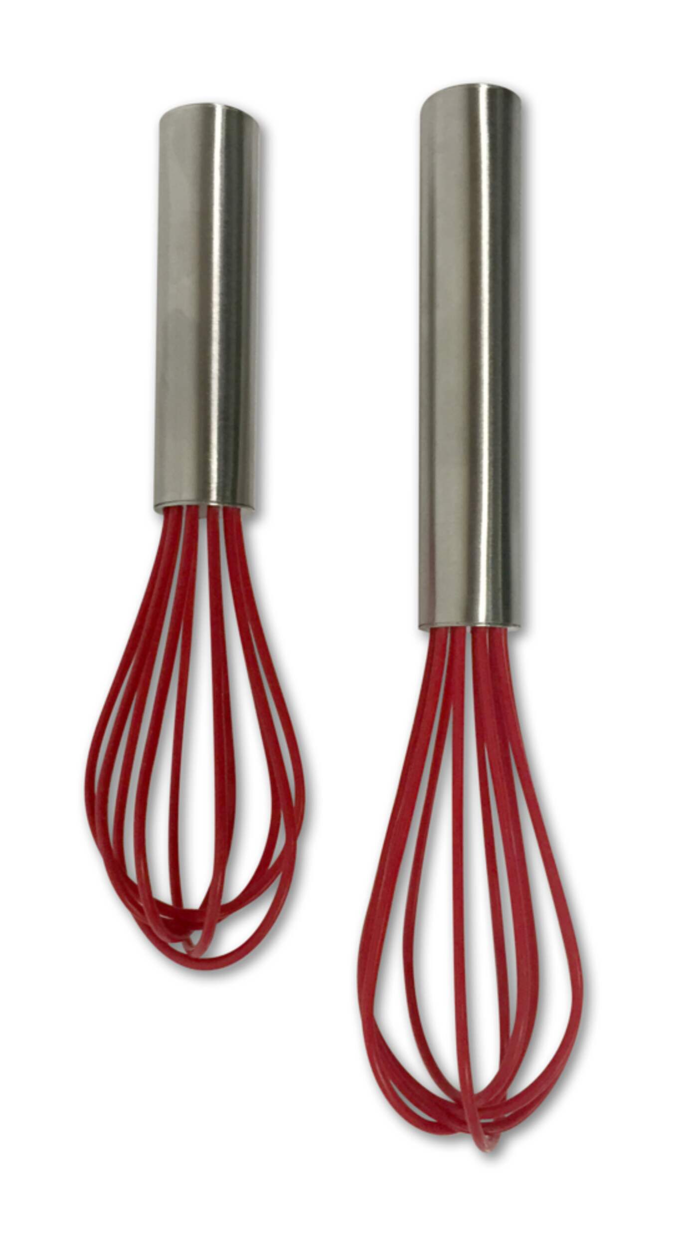 Mix ingredients professionally with this MASTER Chef Mini Silicone Whisk Set. These chef whisks are ideal for blending sauces, whipping cream, and more. The red whisks are durable and feature a silicone head that is safe to use on non-stick cookware. The mini whisk set is heat resistant up to 500 °F and cleans easily in the dishwasher. These whisks for cooking come in a set of two: one 6.5" and one 8" whisk.