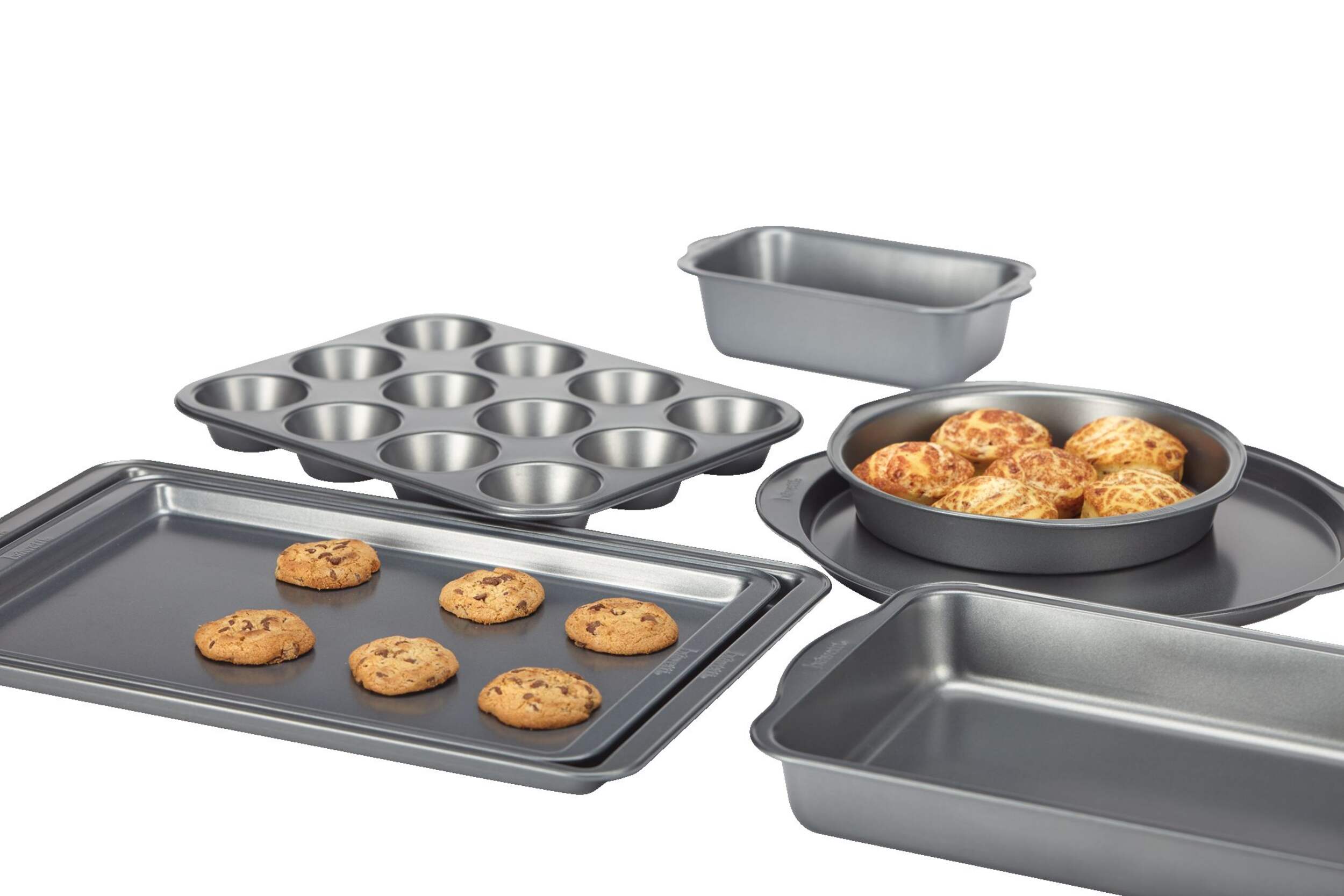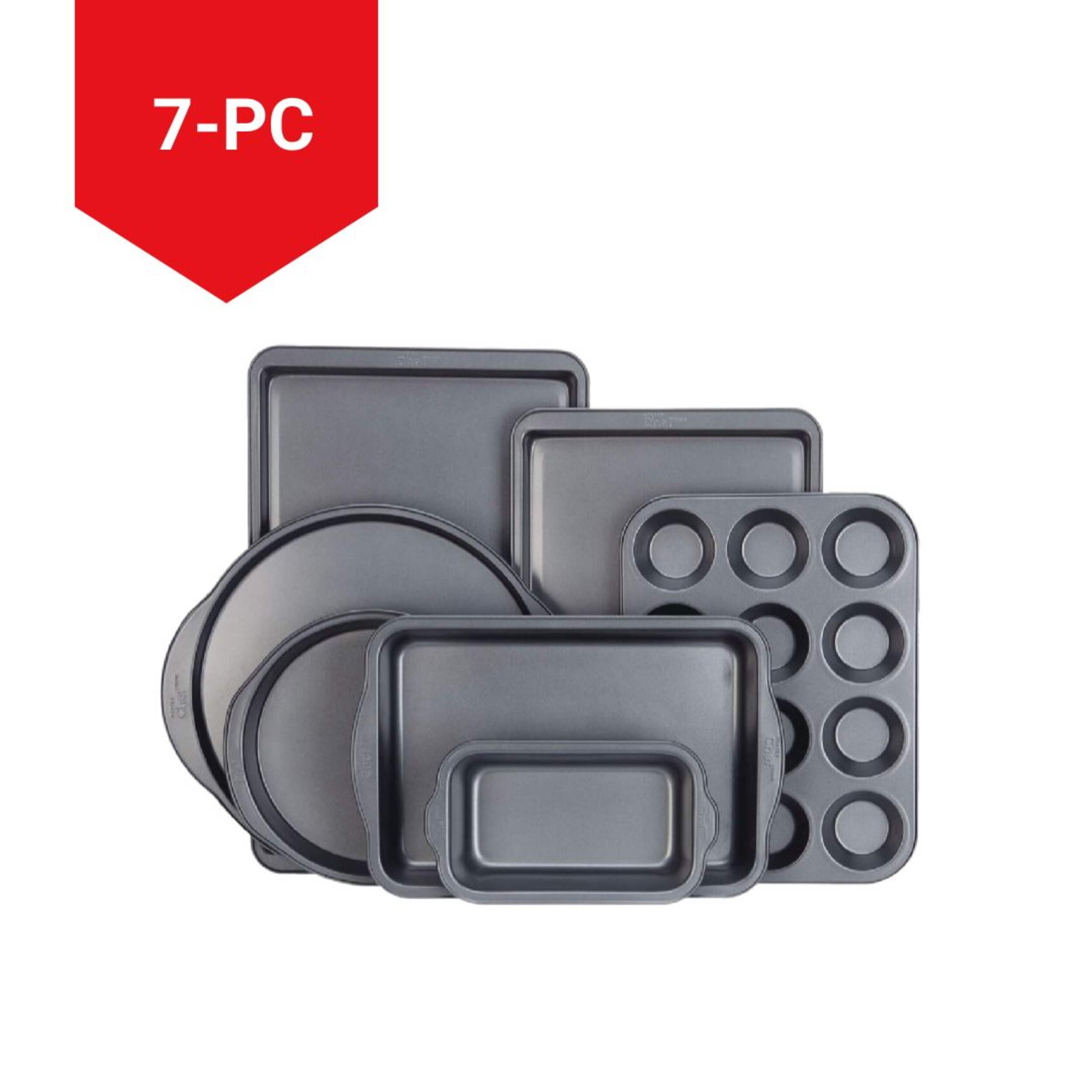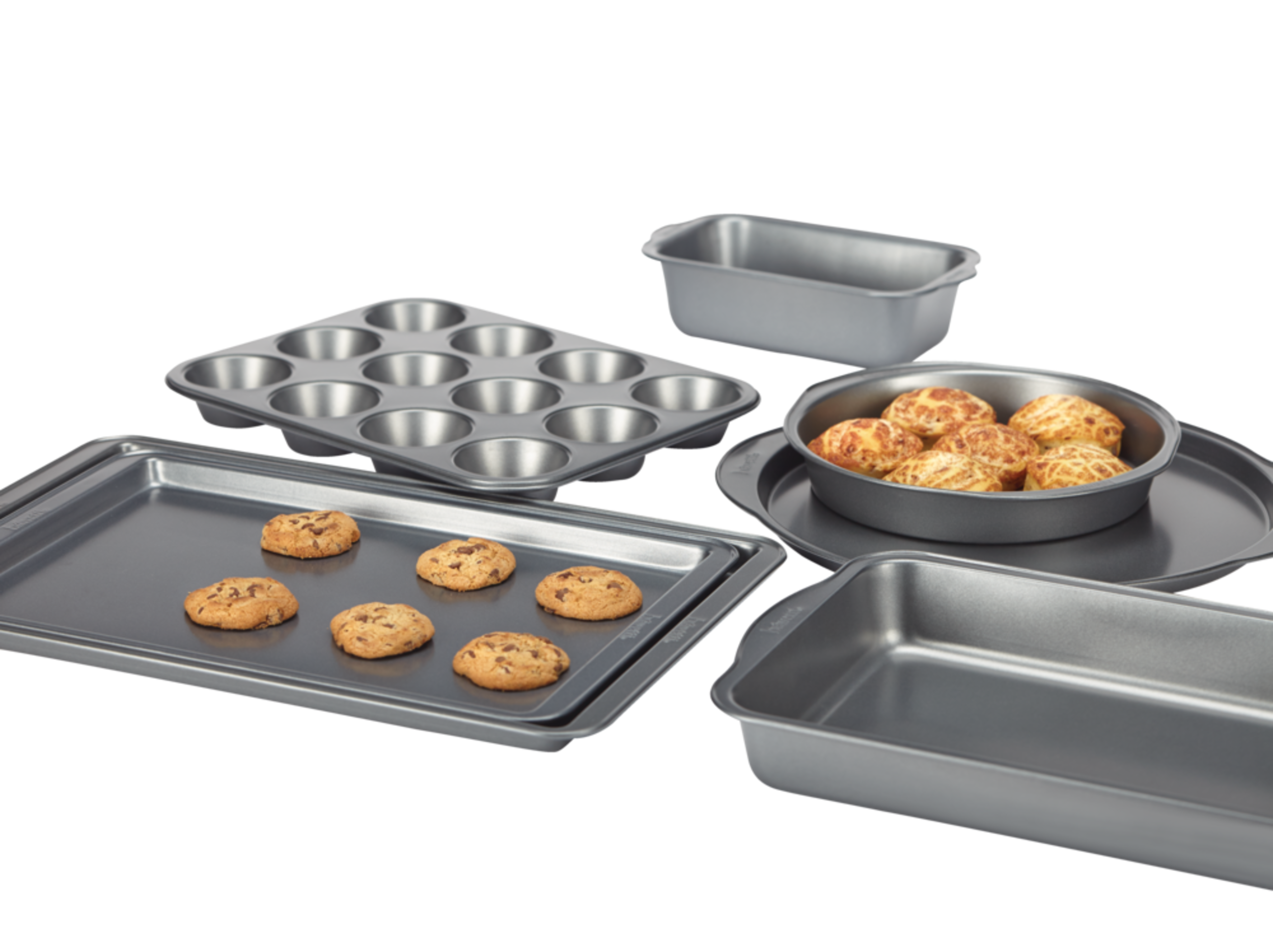 Includes 17" Cookie Sheet, 15" Cookie Sheet, 13" Oblong Cake Pan, 8" Loaf Pan, 12 Cup Muffin Pan, 9" Round Cake Pan, and 13" Pizza Pan