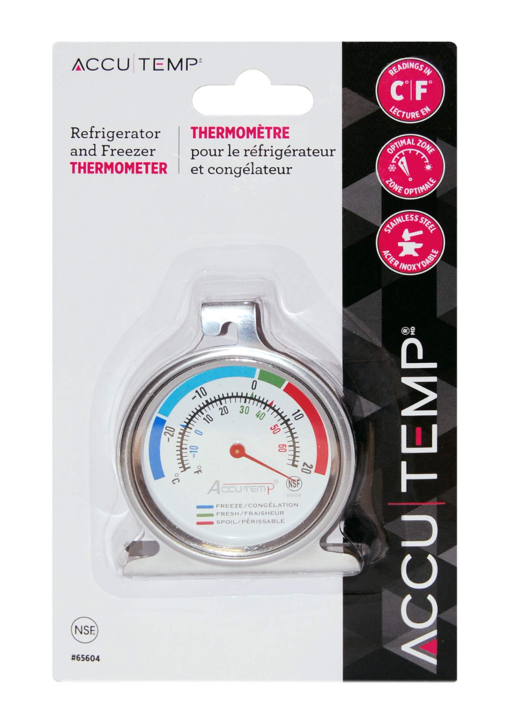 This handy thermometer from Accu-Temp helps keep an eye on refrigerator and freezer temperatures to ensure food safety. Whether checking the fridge to make sure perishables stay at the right cold temperatures, or monitoring the deep freeze so frozen items stay frozen proper, this thermometer can be placed anywhere needed to provide accurate readings. The thermometer face is large and easy to read, so a quick glance will tell if temperatures are in the safe zone. This simple but useful tool helps avoid spoilage from improper refrigerator or freezer temperatures.
