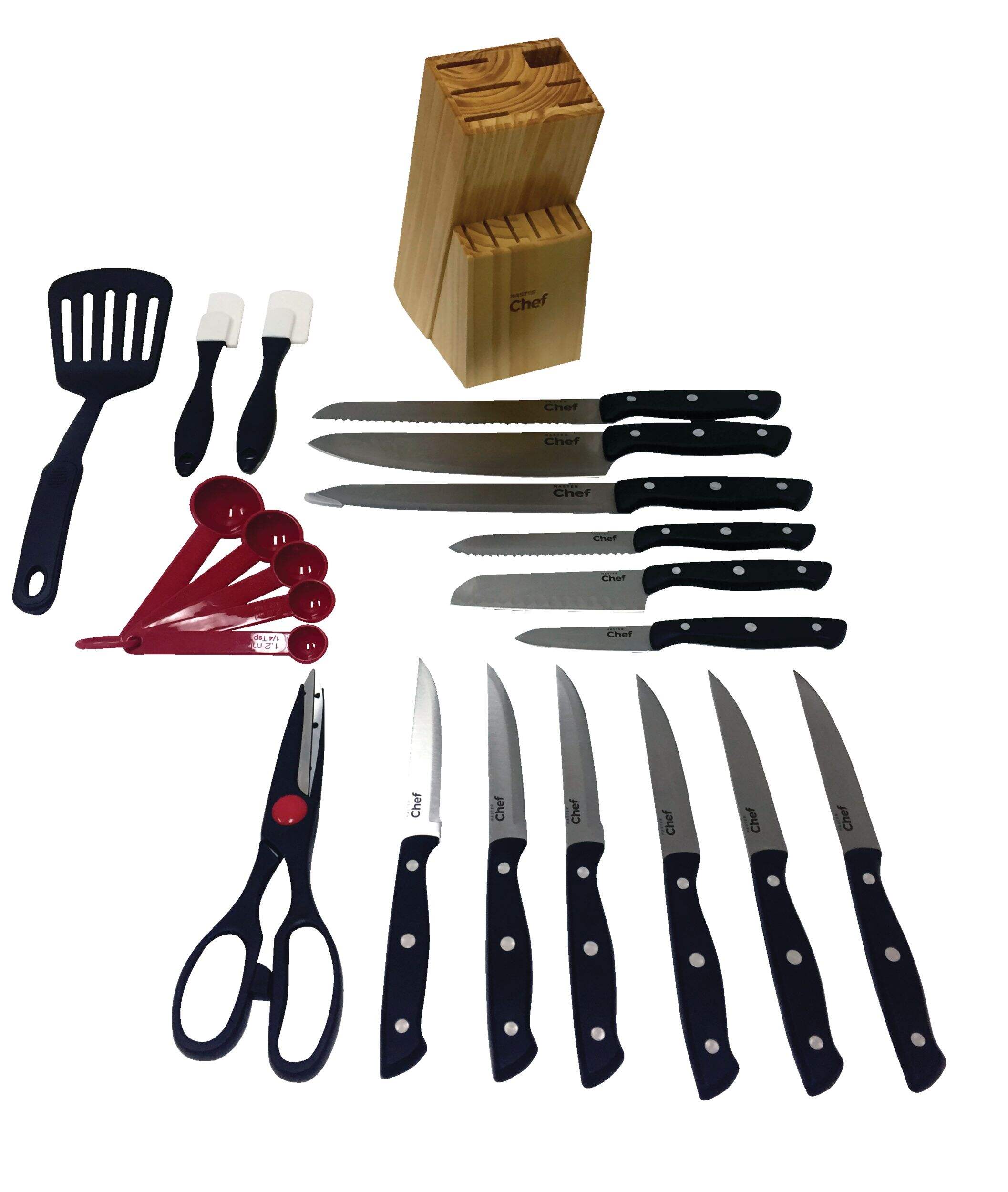 The MASTER Chef Stainless Steel Knife Block and Kitchen Starter Kit provides everything a home chef needs to prepare meals with precision and ease. This 22-piece set includes high-quality stainless steel knives that are ergonomically designed for comfort, ensuring a secure grip even when wet. The natural wood block provides convenient storage while keeping the knives organized and accessible. This comprehensive set is perfect for new cooks or those looking to upgrade their kitchen tools.