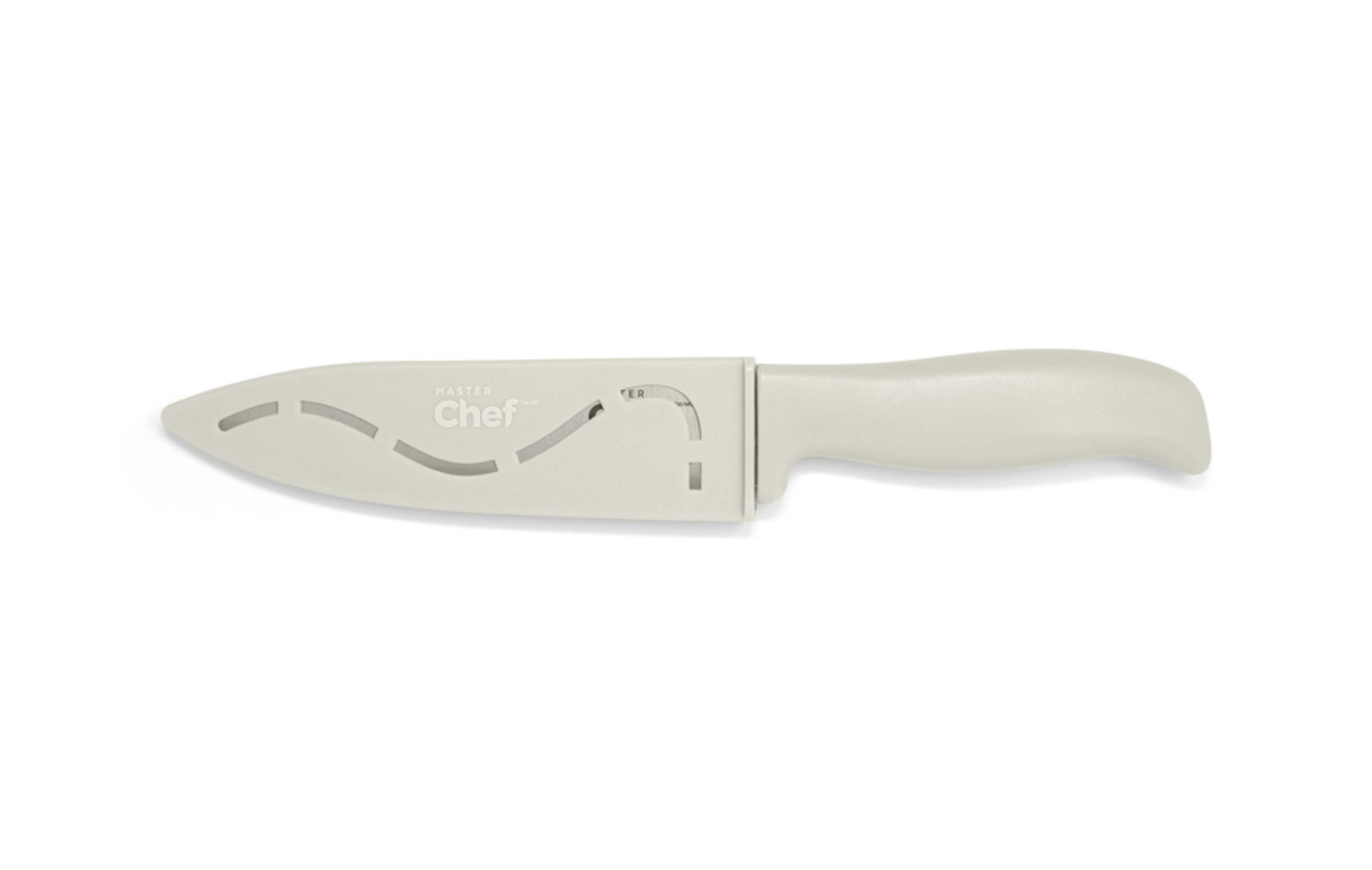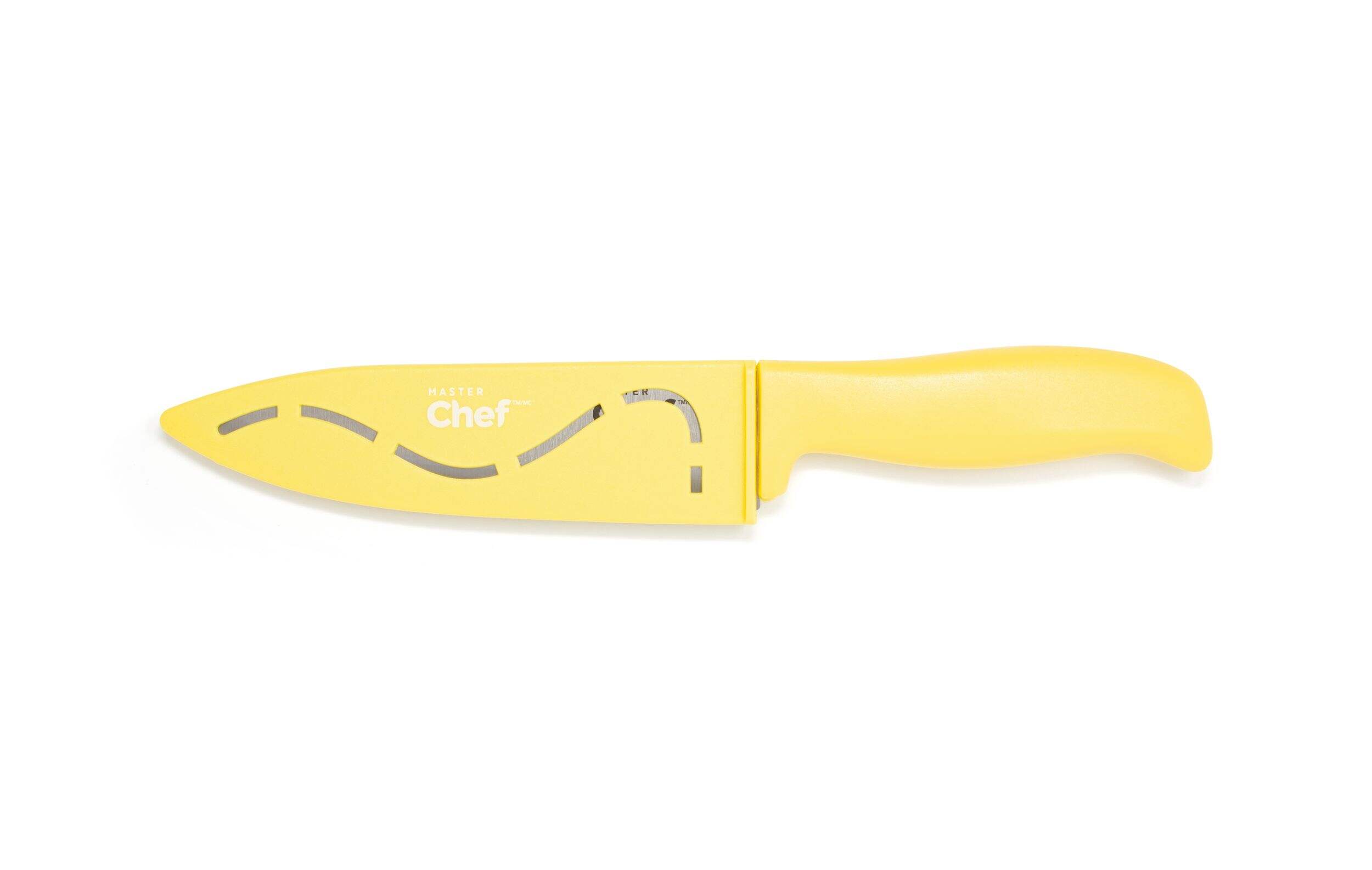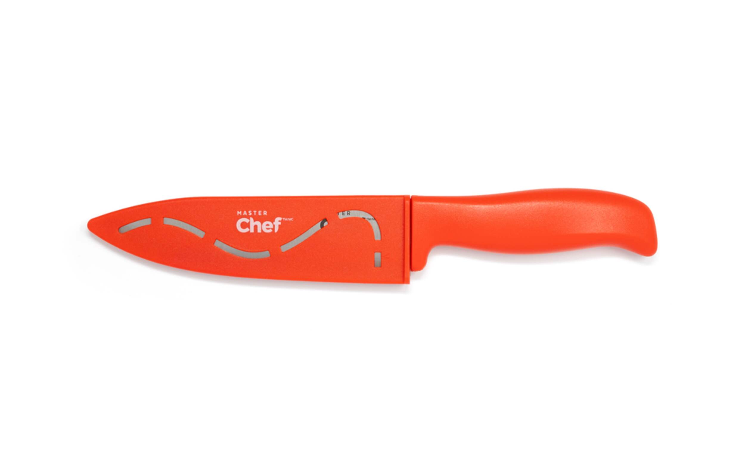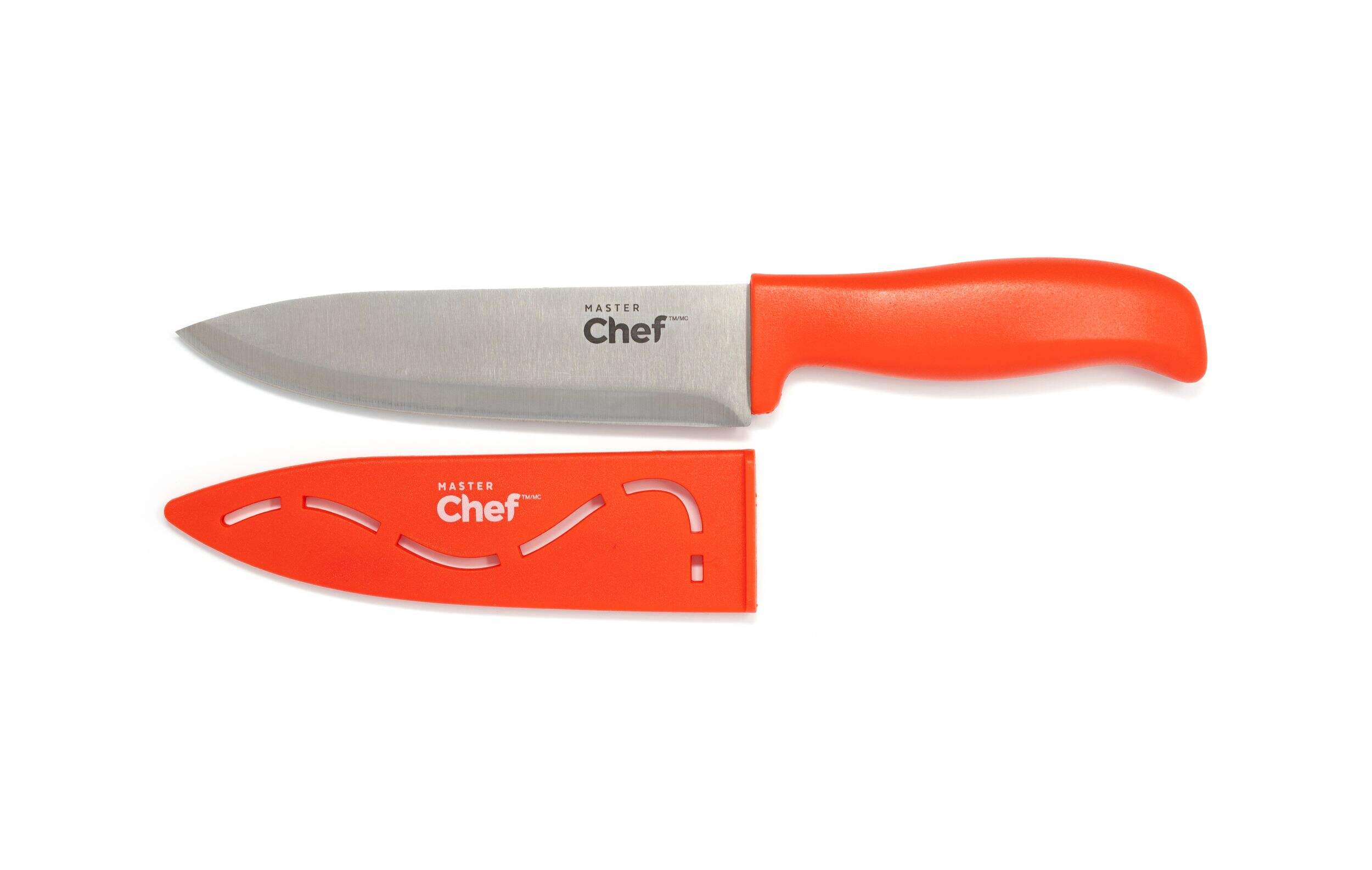 Cook like a pro with this MASTER Chef Stainless Steel Knife. A must for every kitchen, this kitchen knife is a versatile tool for chopping, deboning or as a steak knife. This multi-coloured knife with sheath stays protected when the knife is not in use and has a comfortable soft-touch ergonomic handle. The blade of the stainless steel knife provides a sharp edge that stays sharp longer. Available in assorted colours, the knife measures 6".
