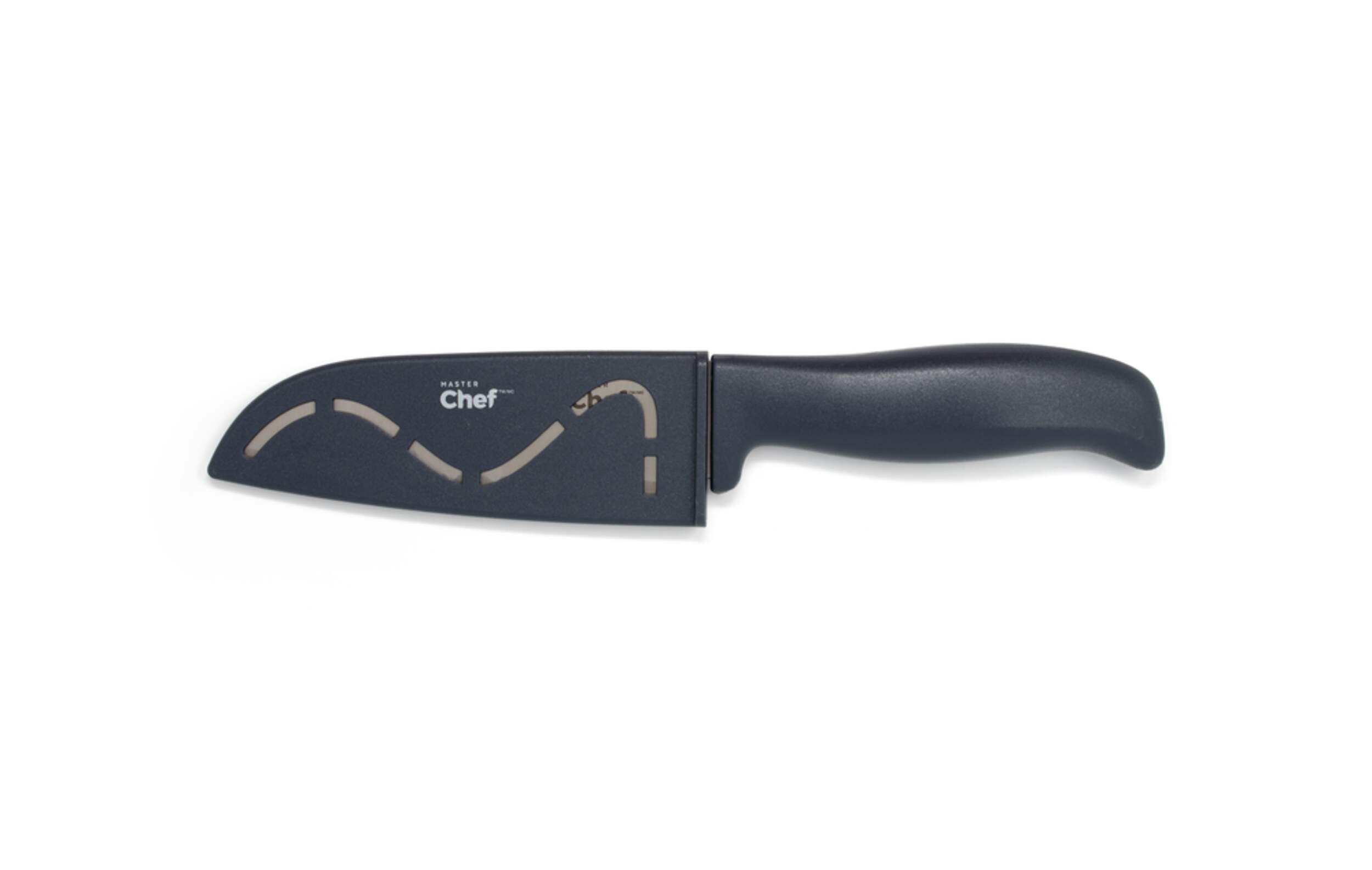 Cook like a pro with this MASTER Chef Santoku Knife. A must for every kitchen and similar to a chef knife, a Santoku knife is a versatile tool for chopping, dicing and slicing. This multi-coloured knife includes a protective sheath for when the knife is not in use and a comfortable soft-touch ergonomic handle. The blade of the carbon steel Santoku knife provides a sharp edge that stays sharper longer. Available in assorted colours, the knife measures 5".
