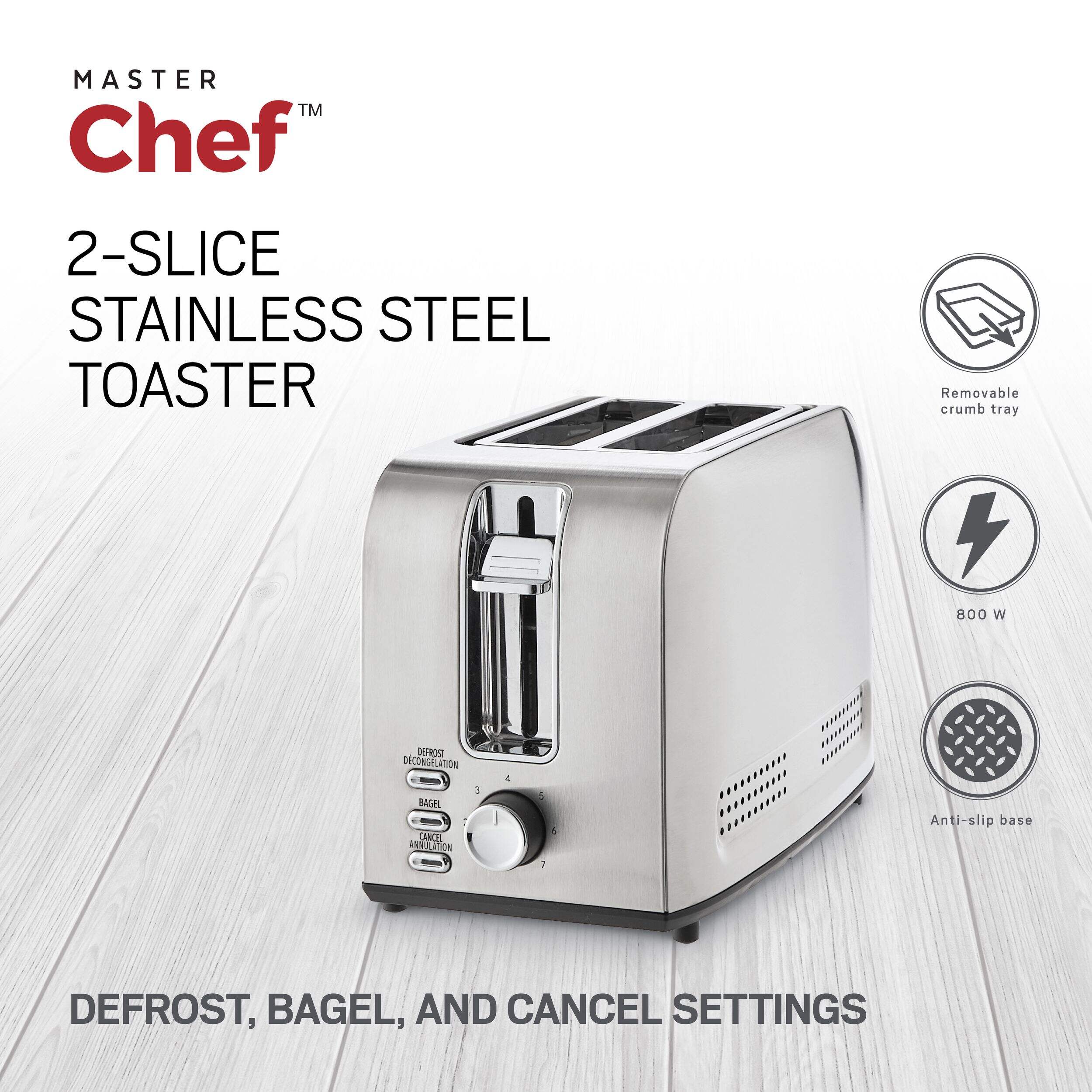 The MASTER Chef Stainless Steel Toaster delivers perfectly toasted bread every time. Featuring two wide, self-centering slots, this sleek toaster includes useful functions like defrost, cancel, and bagel modes. The removable crumb tray allows for easy cleanup. With an upright-only design for safety, this toaster should not be used on its side or with non-bread items like rice cakes or pastries. Simply insert your bread into the slots, select your desired setting, and enjoy delicious toasted bread and bagels in no time.