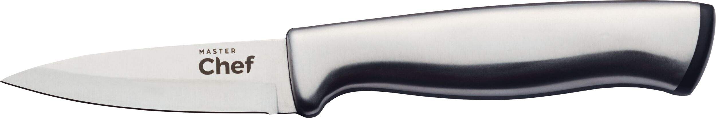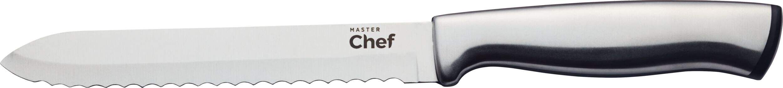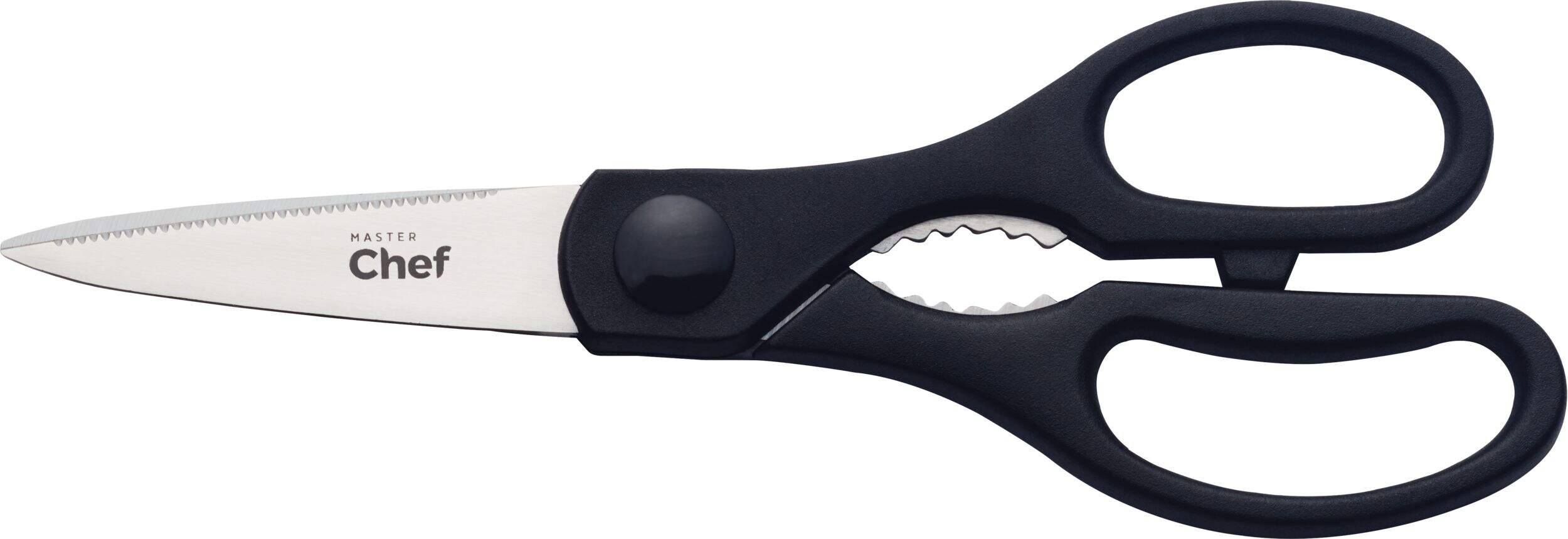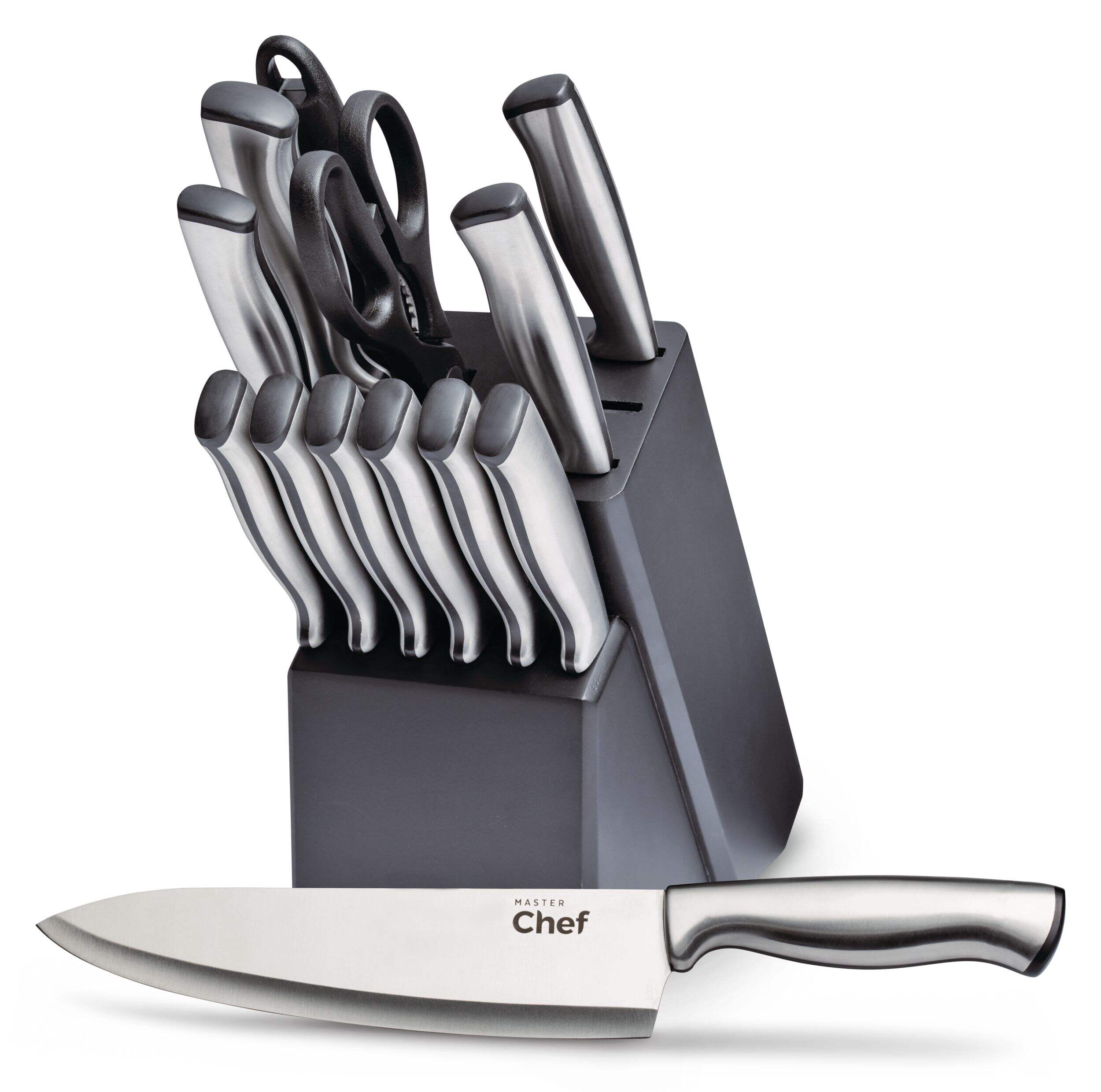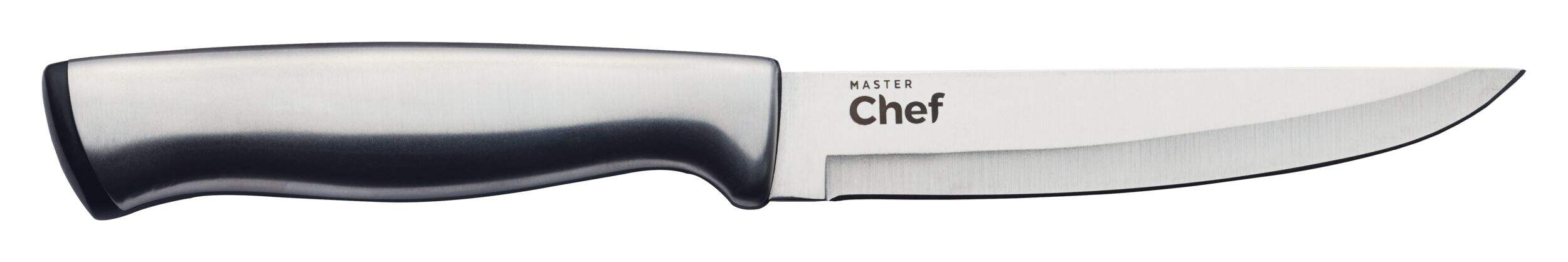 The MASTER Chef Stamp Cutlery Set includes an impressive array of knives and accessories to elevate cooking in your kitchen. Featuring six steak knives, all-purpose household shears, a serrated utility knife, a paring knife and more, this essential set comes complete with a sturdy knife block to keep everything safe and secure. Each polymer knife features a durable forged high-carbon, stainless steel blade, and the included sharpening tool helps keep your new knives up to any task in the kitchen.