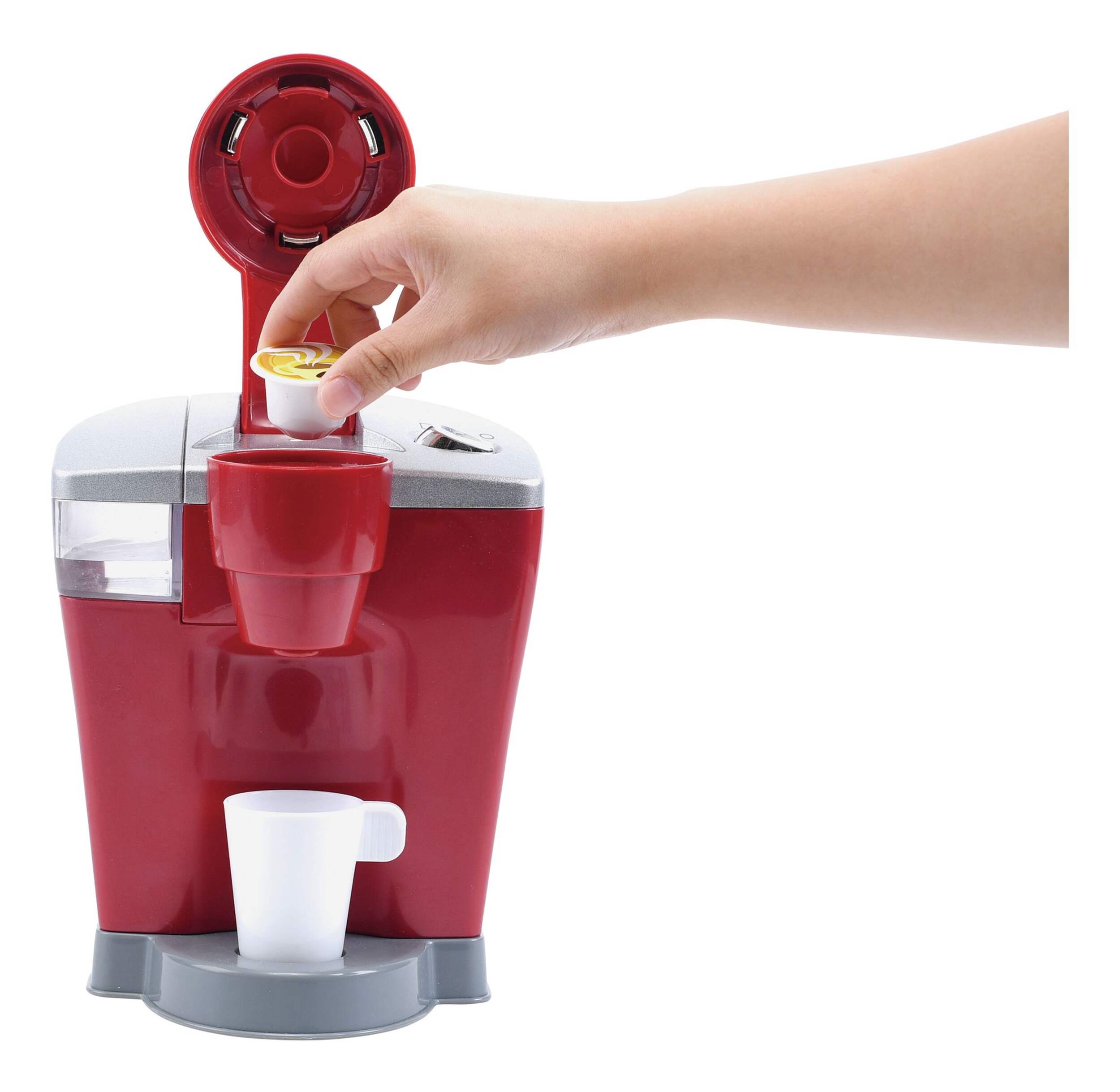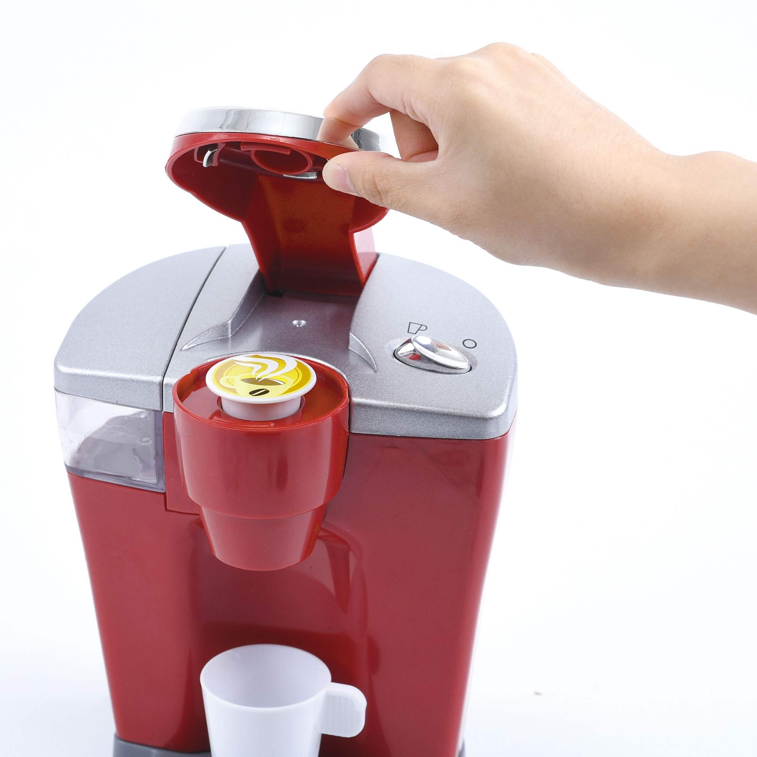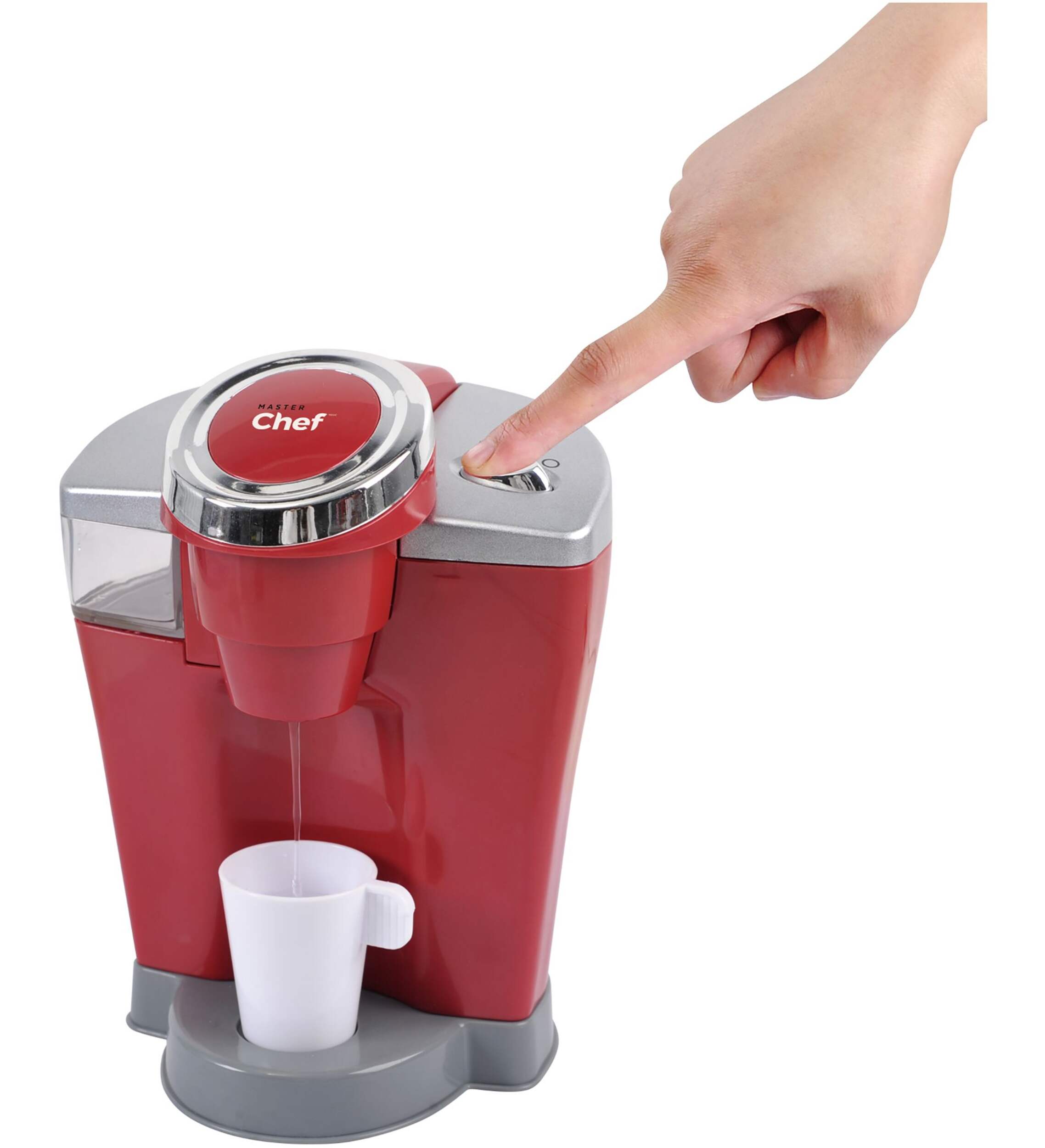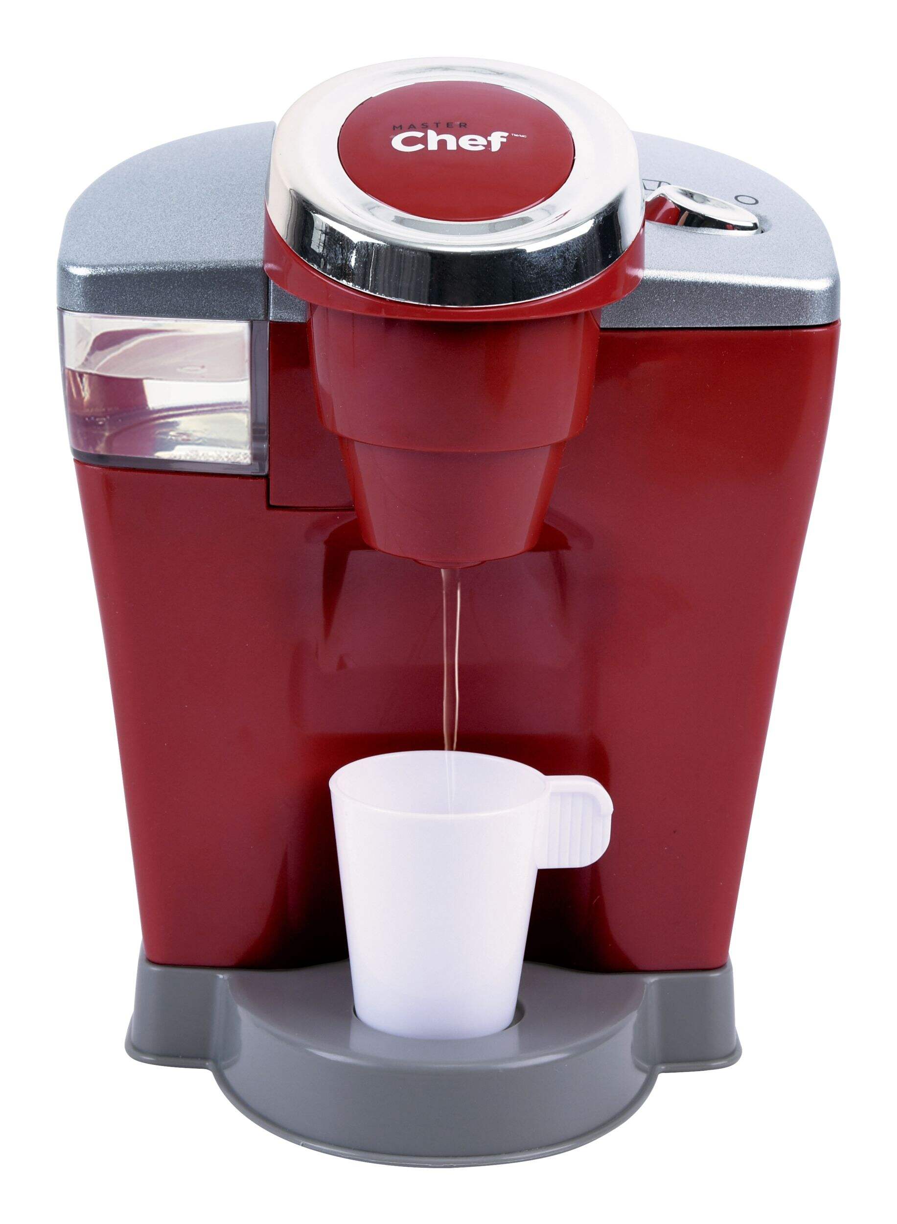 Coffee maker dispenses water along with realistic coffee sounds