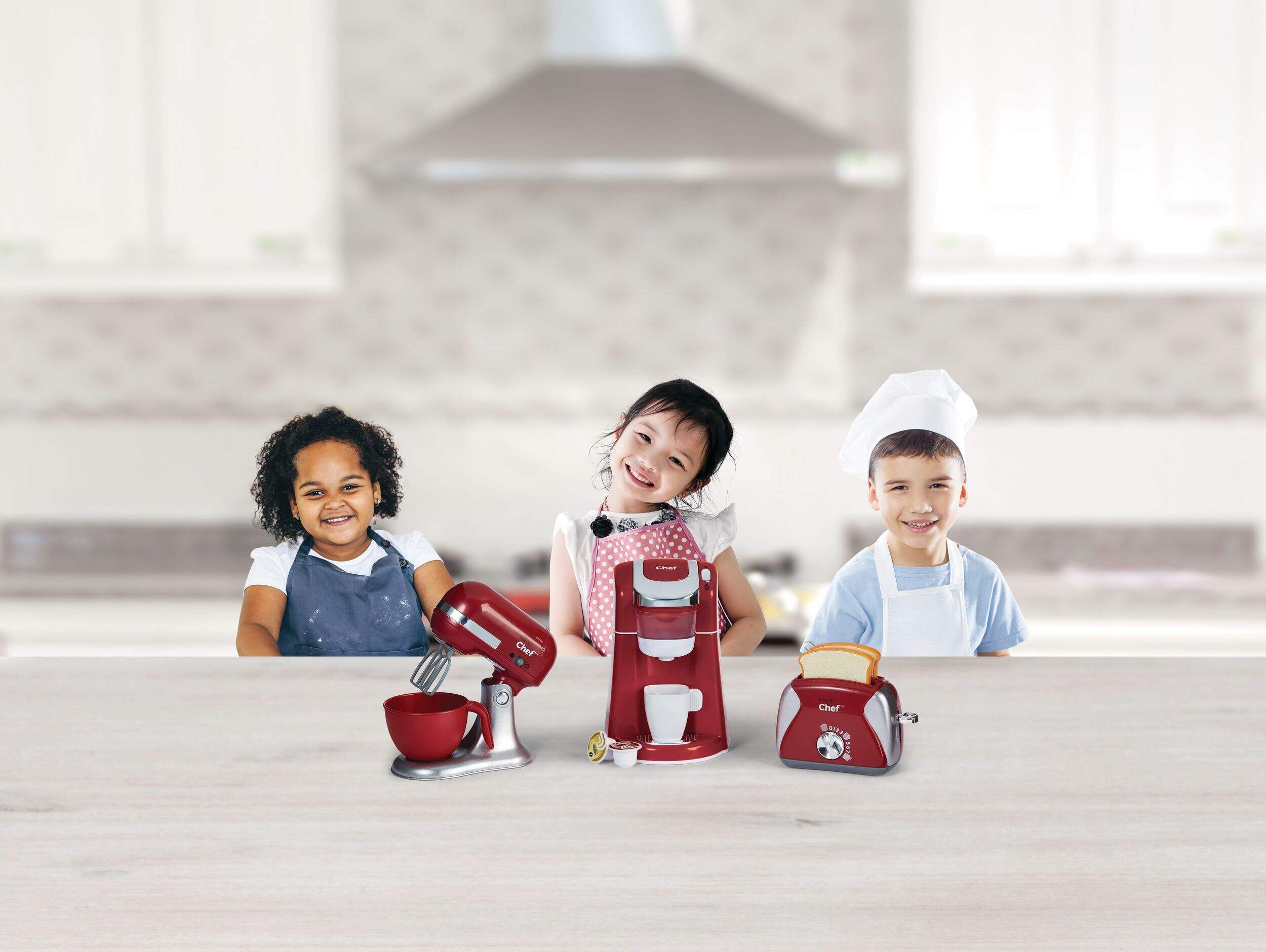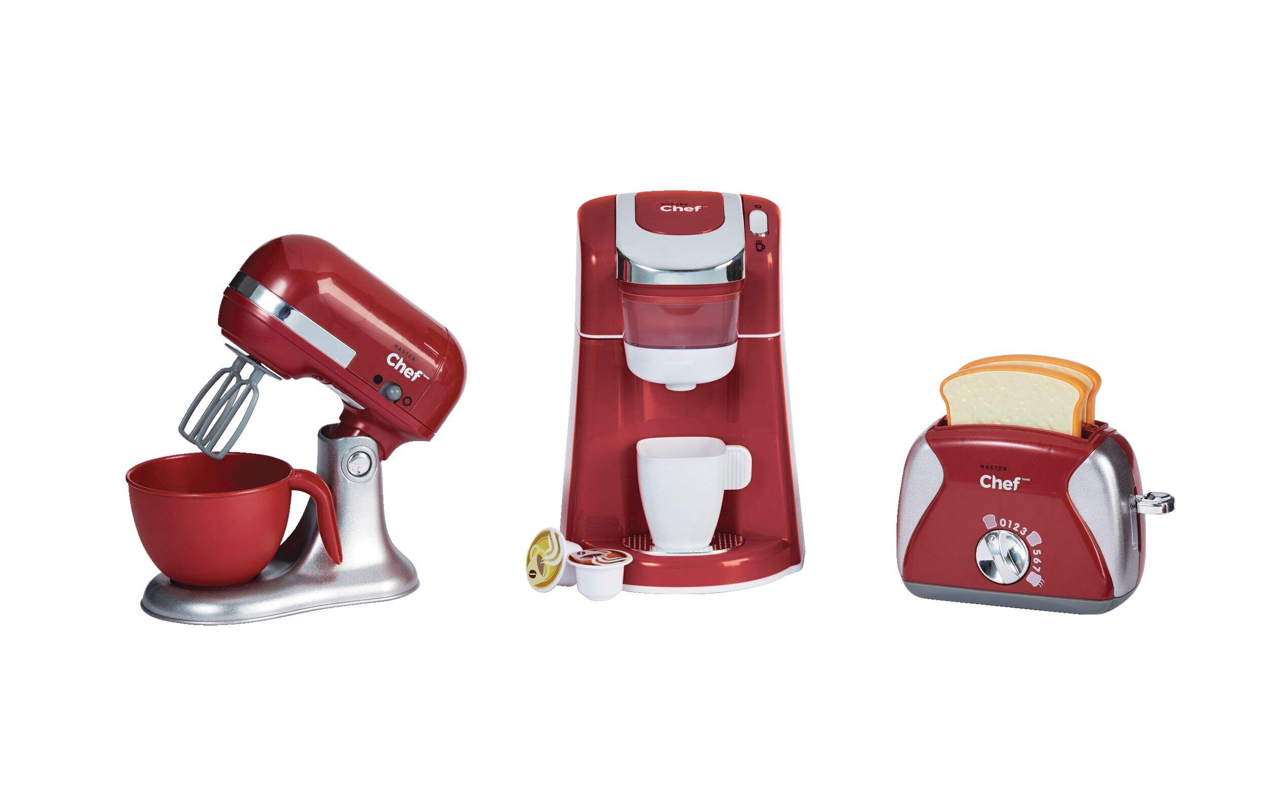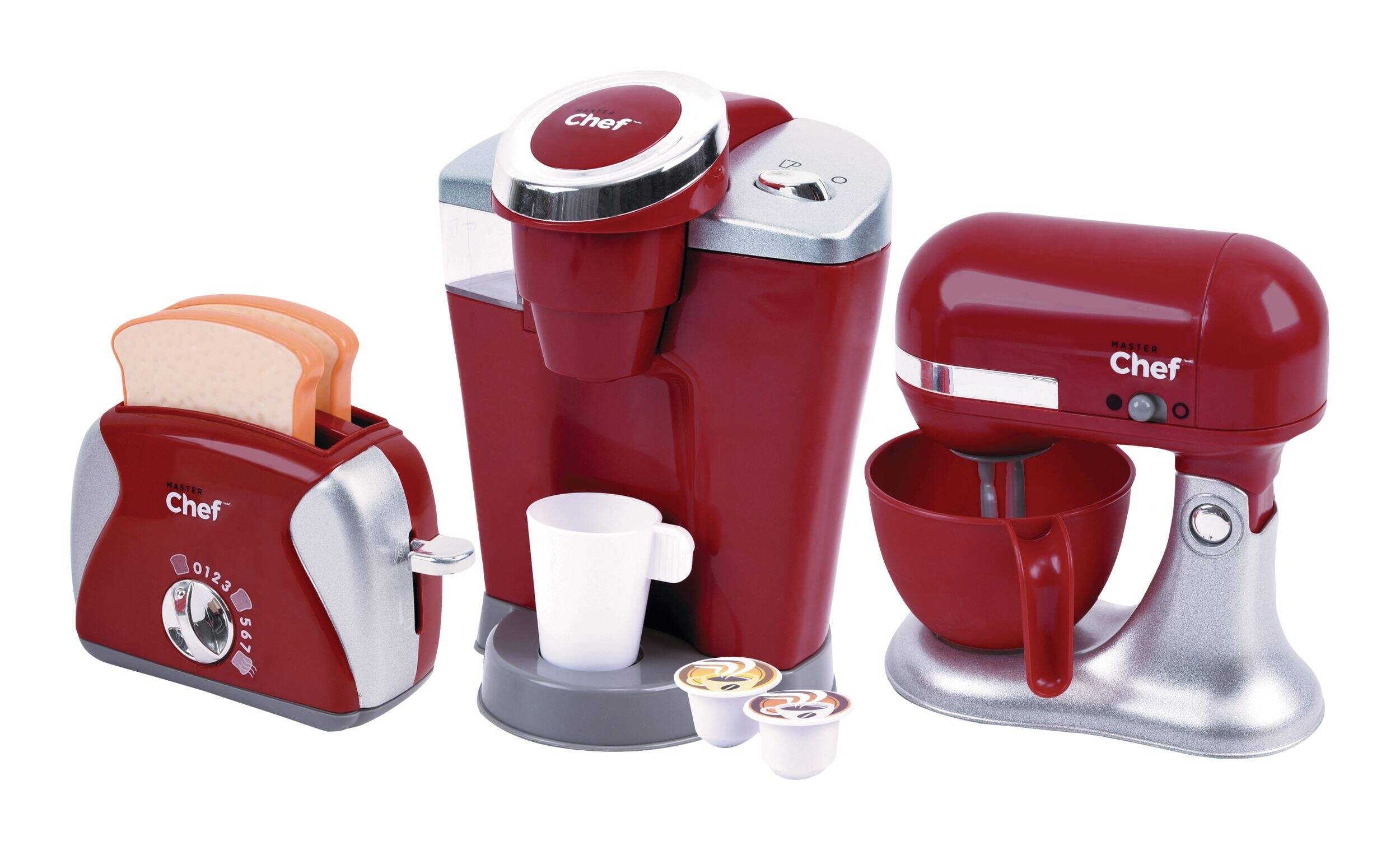 Designed for kids who want to help their parents in the kitchen and learn the ins-and-outs of cooking, the MASTER Chef Gourmet Play Toy Kitchen Appliance Set comes with three toy kitchen appliances including a coffee maker, mixer, and toaster. For added realism, this kitchen toy kit includes a coffee cup, two coffee capsules, a mixing bowl, beaters, and two slices of toast. The mixer and coffee maker each require two AAA batteries.