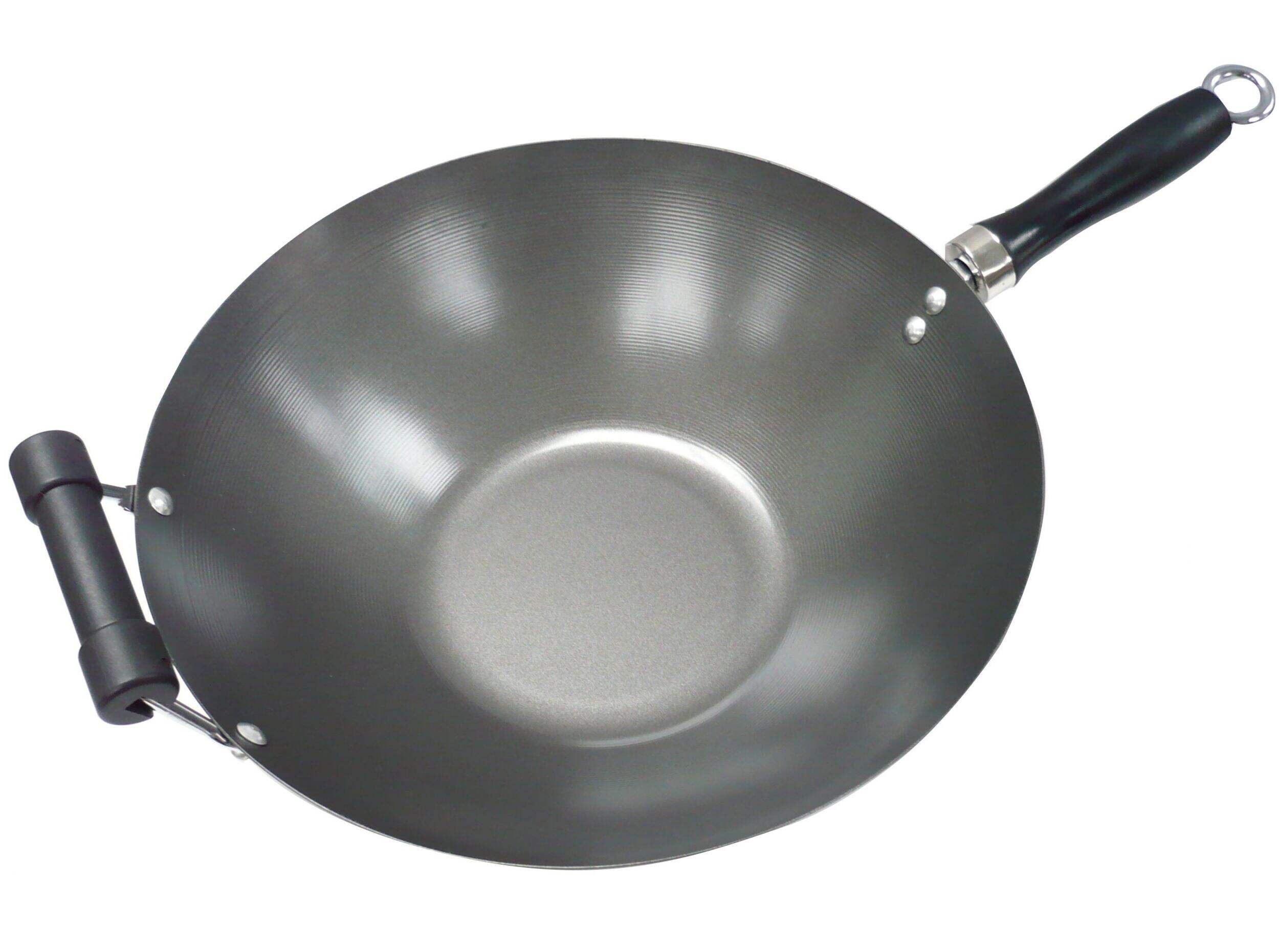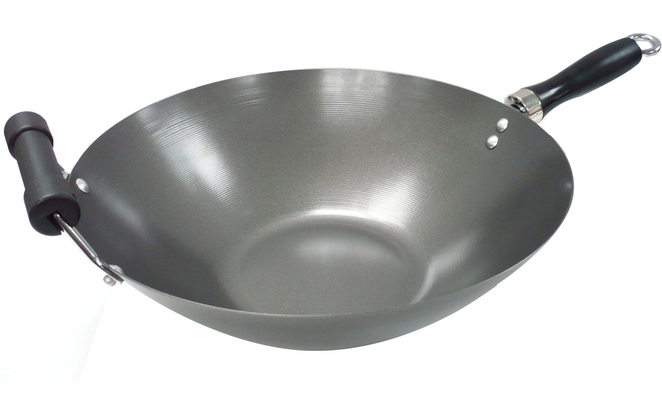 Expand your culinary horizons with this MASTER Chef Wok Stir Fry Pan. This durable carbon steel cooking pan measures 14" (35.5 cm) in diameter with a 3 L capacity that can comfortably accommodate all your favourite meats, vegetables, and hearty soups or stews, all without the mess of pans that don’t have the same generous depth. That means less risk of spillage. Two riveted handles of different sizes allow you to operate this fry pan on any element with ease, then transport it from your stovetop to your countertops, tables, or plates. This carbon steel fry pan heats and cools quickly, all while cooking evenly, making for a smooth, efficient culinary experience even when there’s no oil added to the surface.
