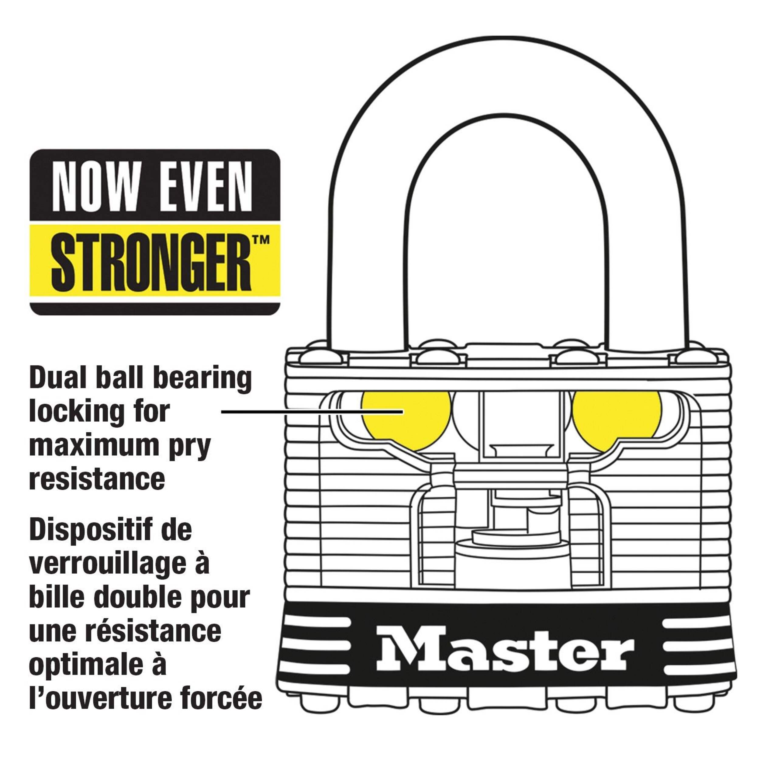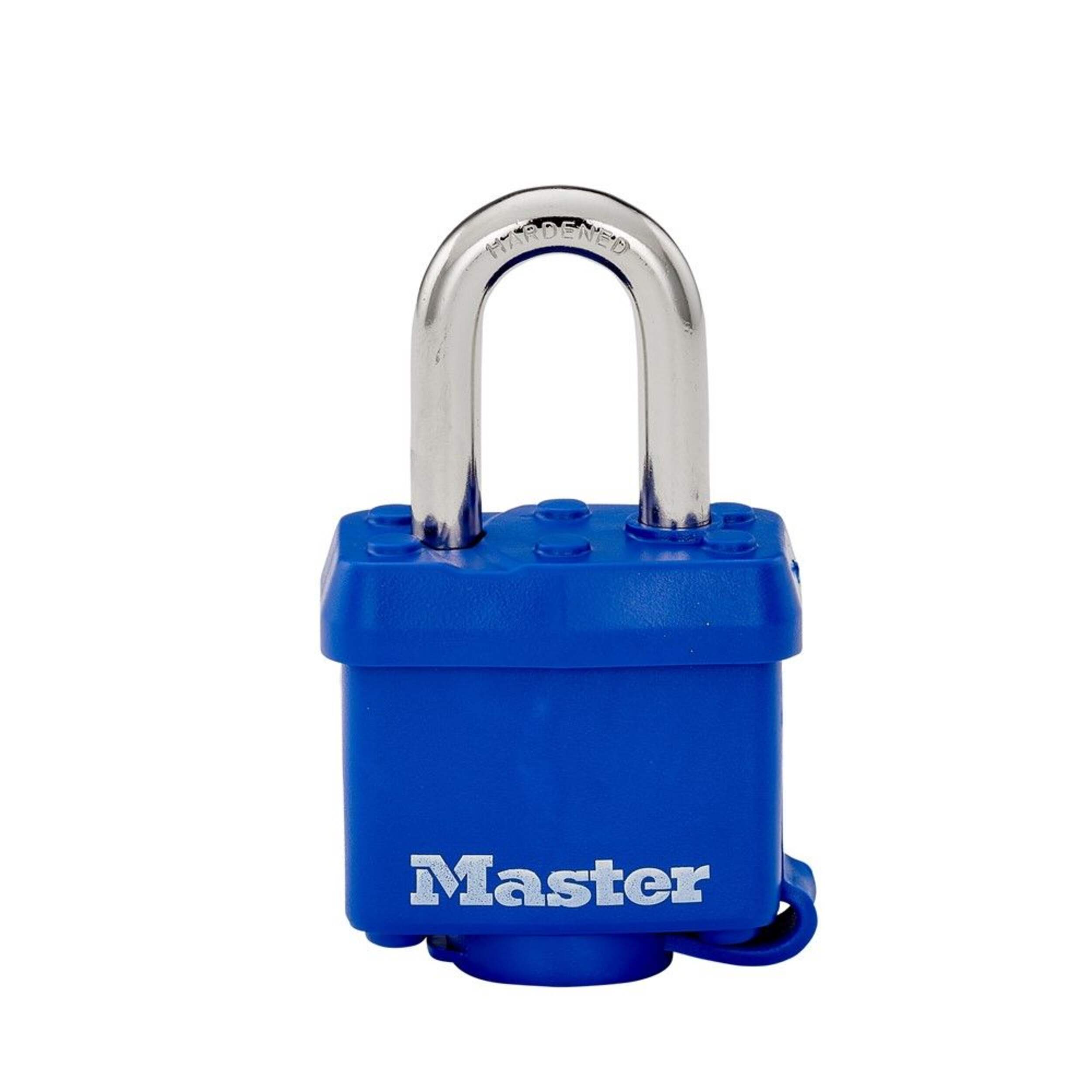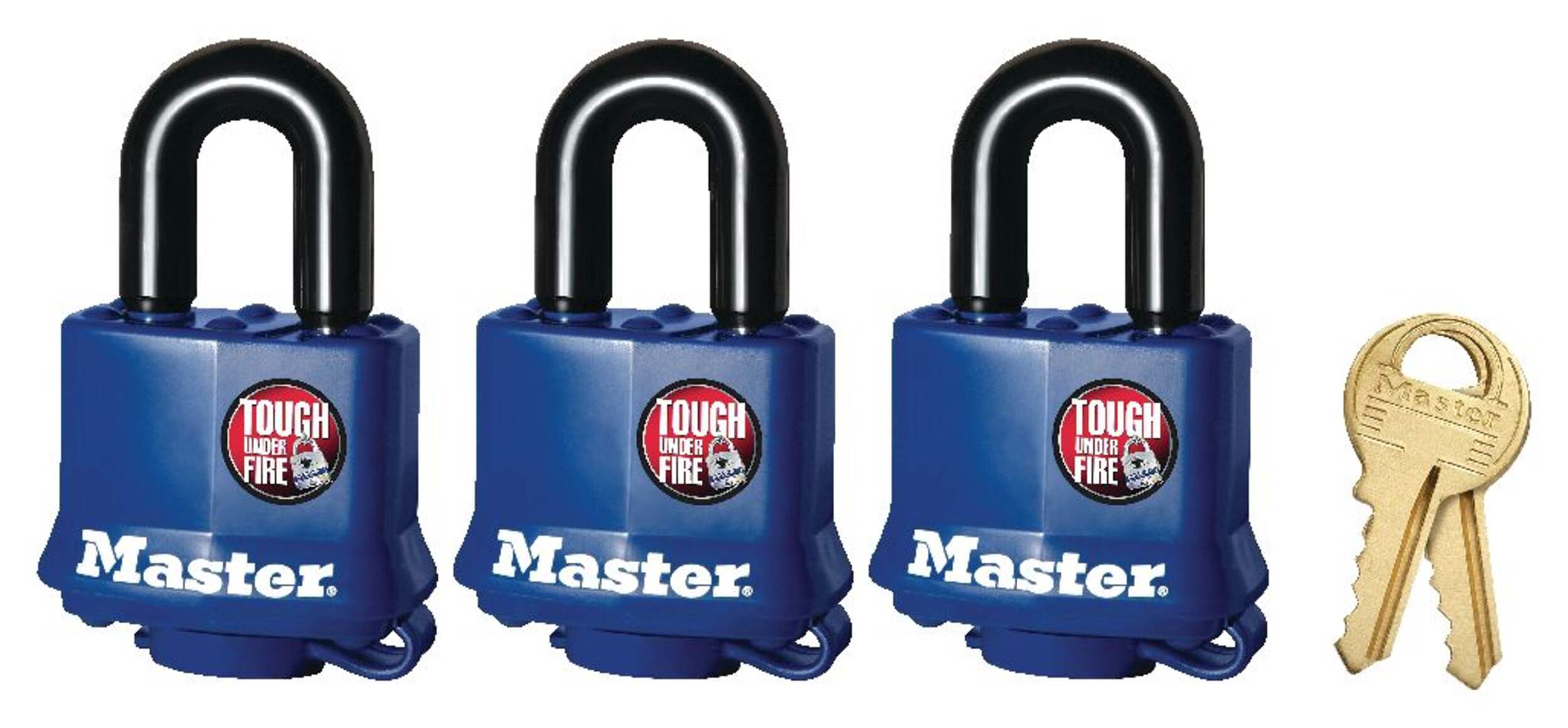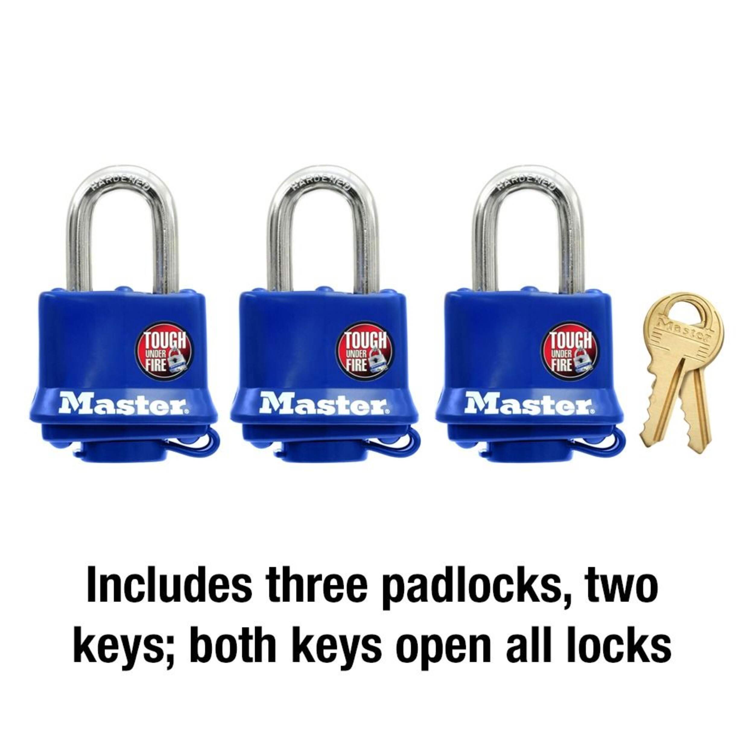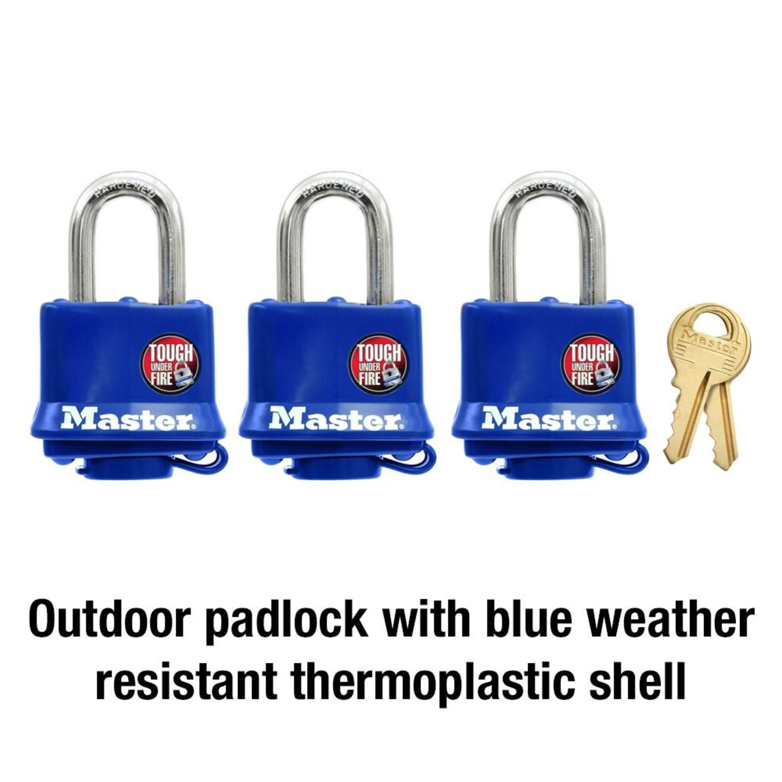 The Master Lock 40mm Wide Covered Laminated Steel Keyed Padlocks offer reliable security for indoor and outdoor use. Featuring a 1-9/16-in (40mm) laminated steel body, these padlocks provide superior strength and durability. The hardened steel shackle with a 1-1/16-in (27mm) clearance resists cutting and sawing, while the thermoplastic cover adds weather resistance. Each pack includes three keyed-alike padlocks for added convenience.