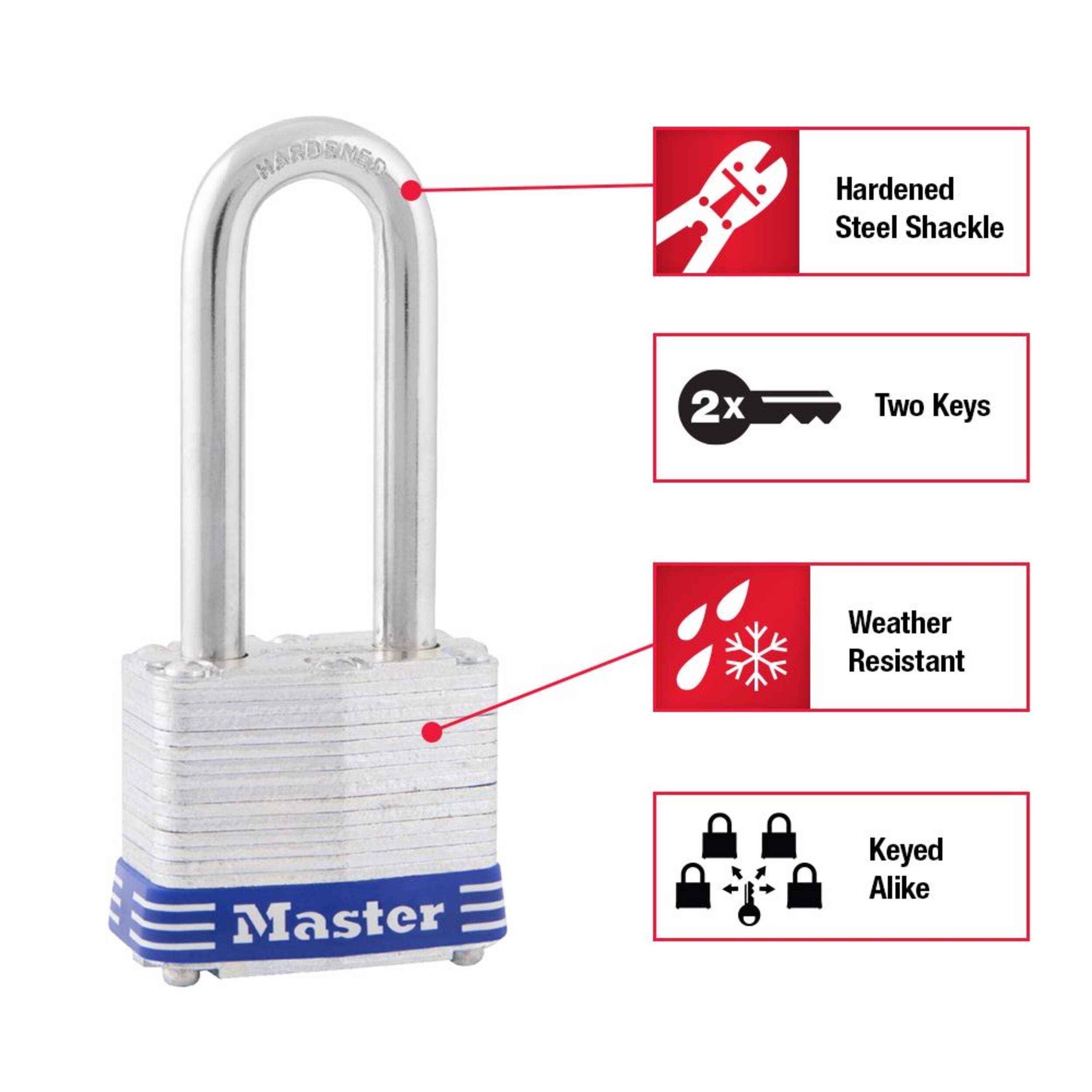 The Master Lock 40mm Wide Laminated Steel Keyed Padlocks provide reliable security for various applications. Each padlock features a 1-9/16-in (40mm) wide laminated steel body, delivering exceptional strength and durability. The 1-1/2-in (38mm) long hardened steel shackle resists cutting and sawing, while the dual locking ball bearings prevent prying. Designed with a 4-pin cylinder for pick resistance, this set of four keyed-alike padlocks allows one key to open all locks for convenience.
