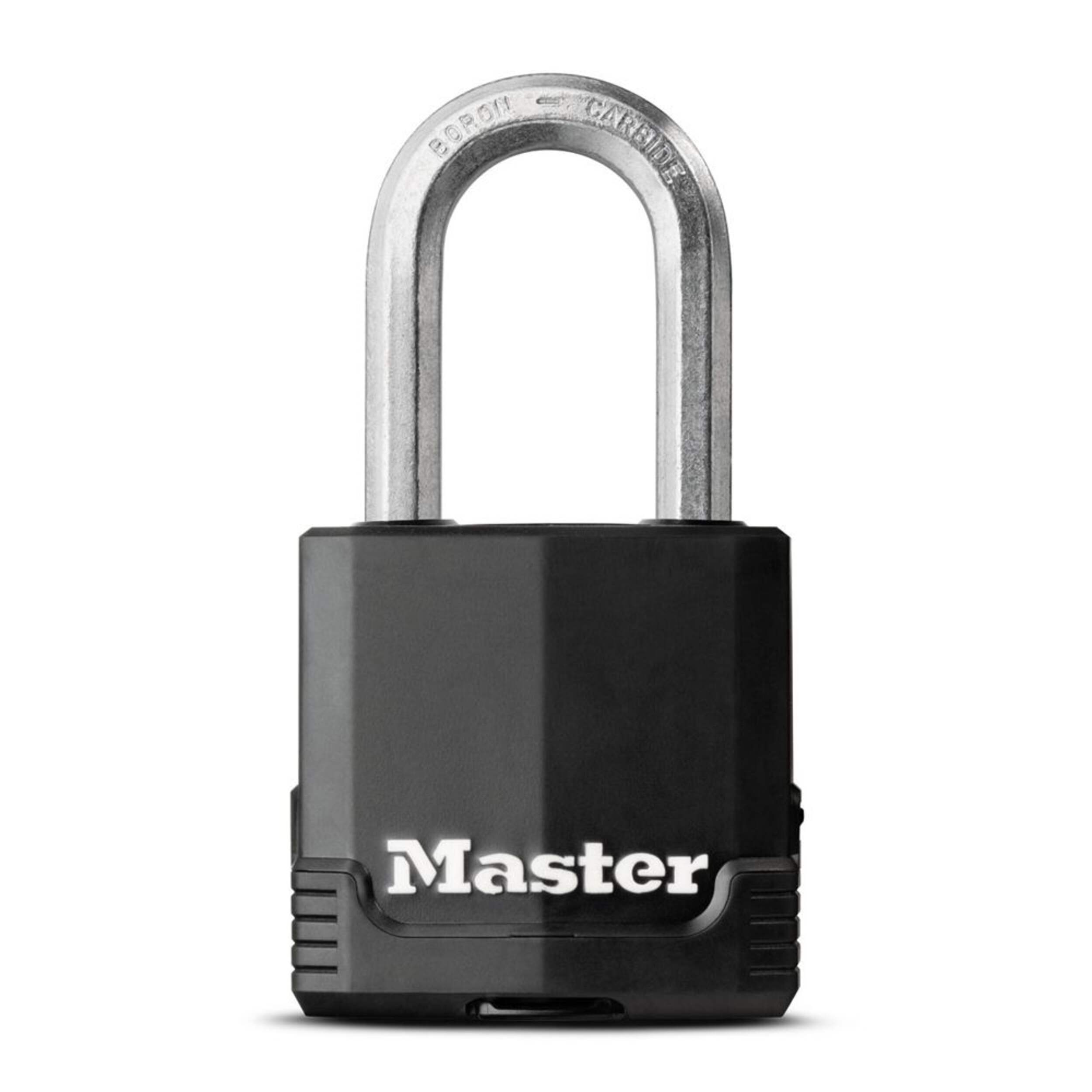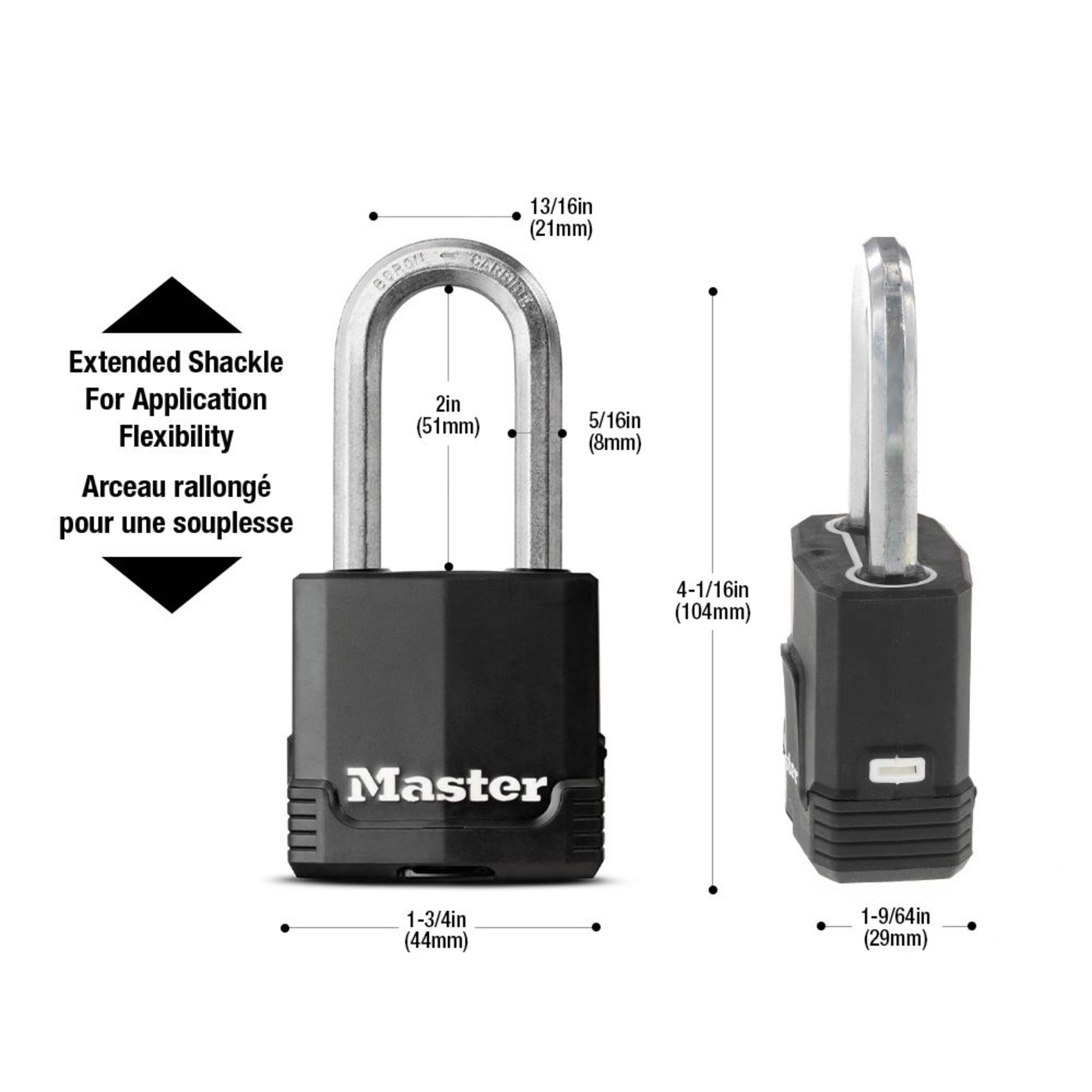 The Master Lock 48mm Wide Laminated Magnum Steel Keyed Padlock offers robust security and durability for outdoor and indoor use. Featuring a 1-7/8-in (48mm) laminated steel body, it provides strength and reliability. The 2-in (51mm) Tough-Cut™ boron-carbide shackle is 50% harder than hardened steel, delivering superior resistance to cutting. This padlock is ideal for securing storage units, fences, lockers, and tools, with the peace of mind provided by a lifetime guarantee.