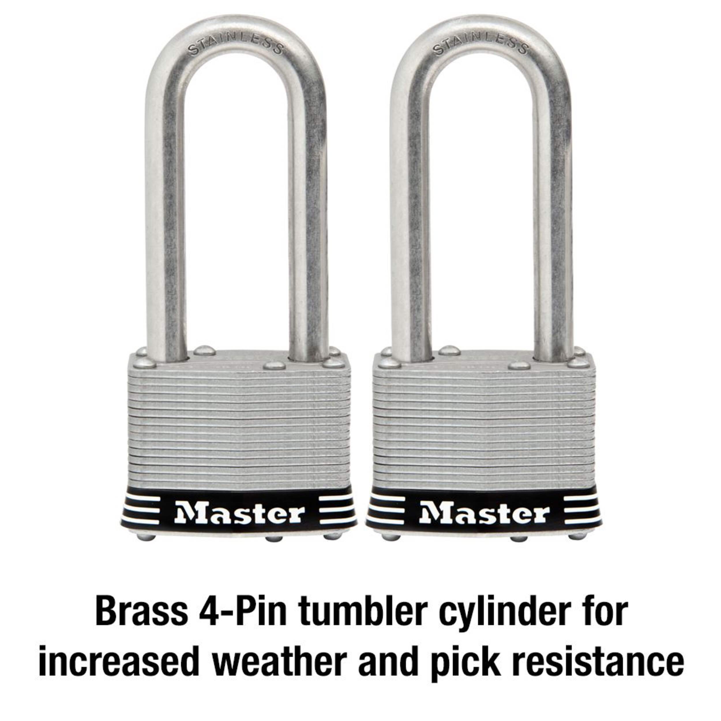 These straightforward stainless steel locks are just what you need for the job. The long shackle design will help secure larger items like bicycles, gates and sheds, while still featuring Master Lock's dependable locking mechanism that's stood the test of time. They are resistant to moisture, rust and corrosion, so you can count on these locks to hold up for the long haul without worry. At an affordable price for a 2-pack, these basic but brilliant locks are a no-nonsense solution for all your medium security locking needs.