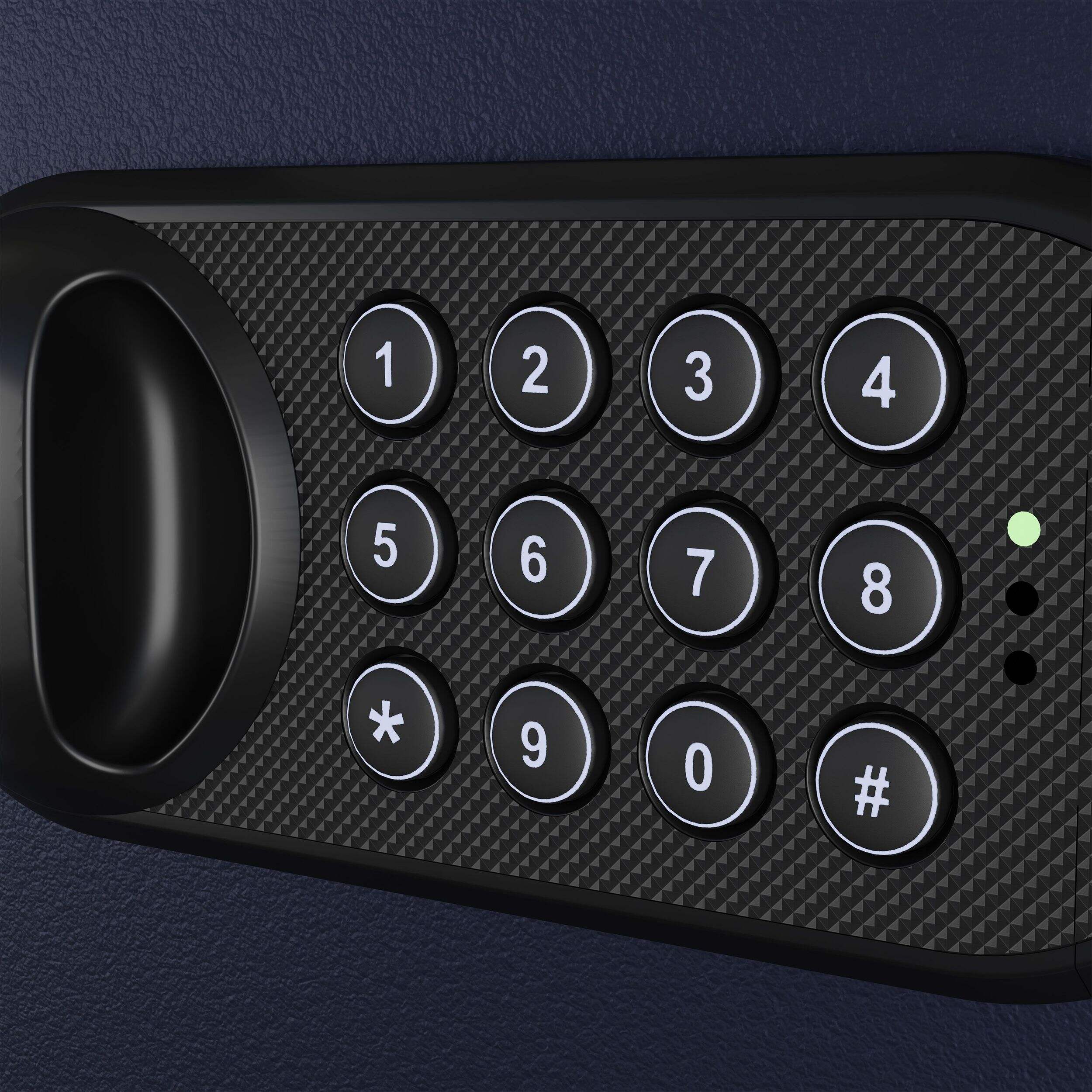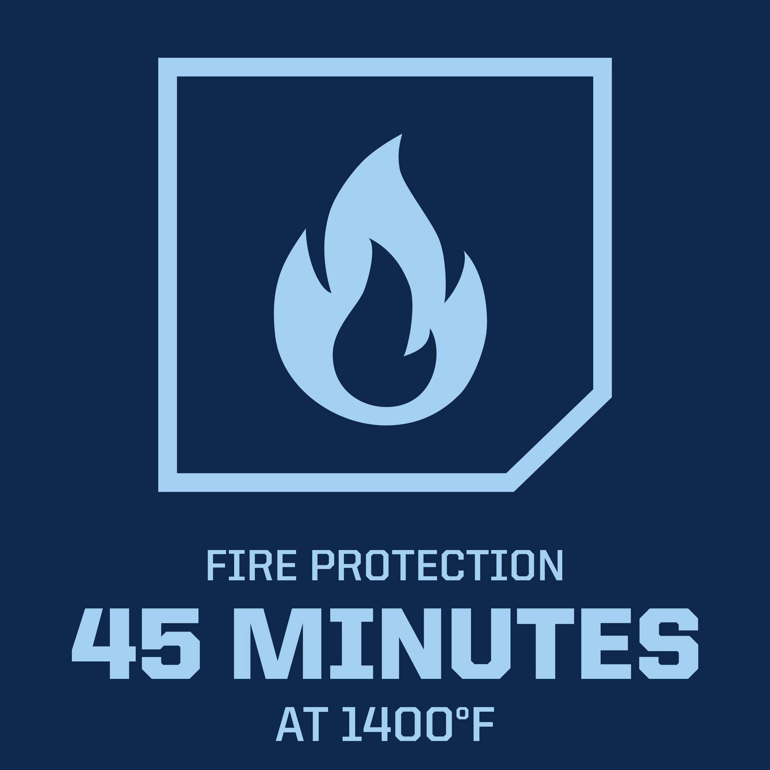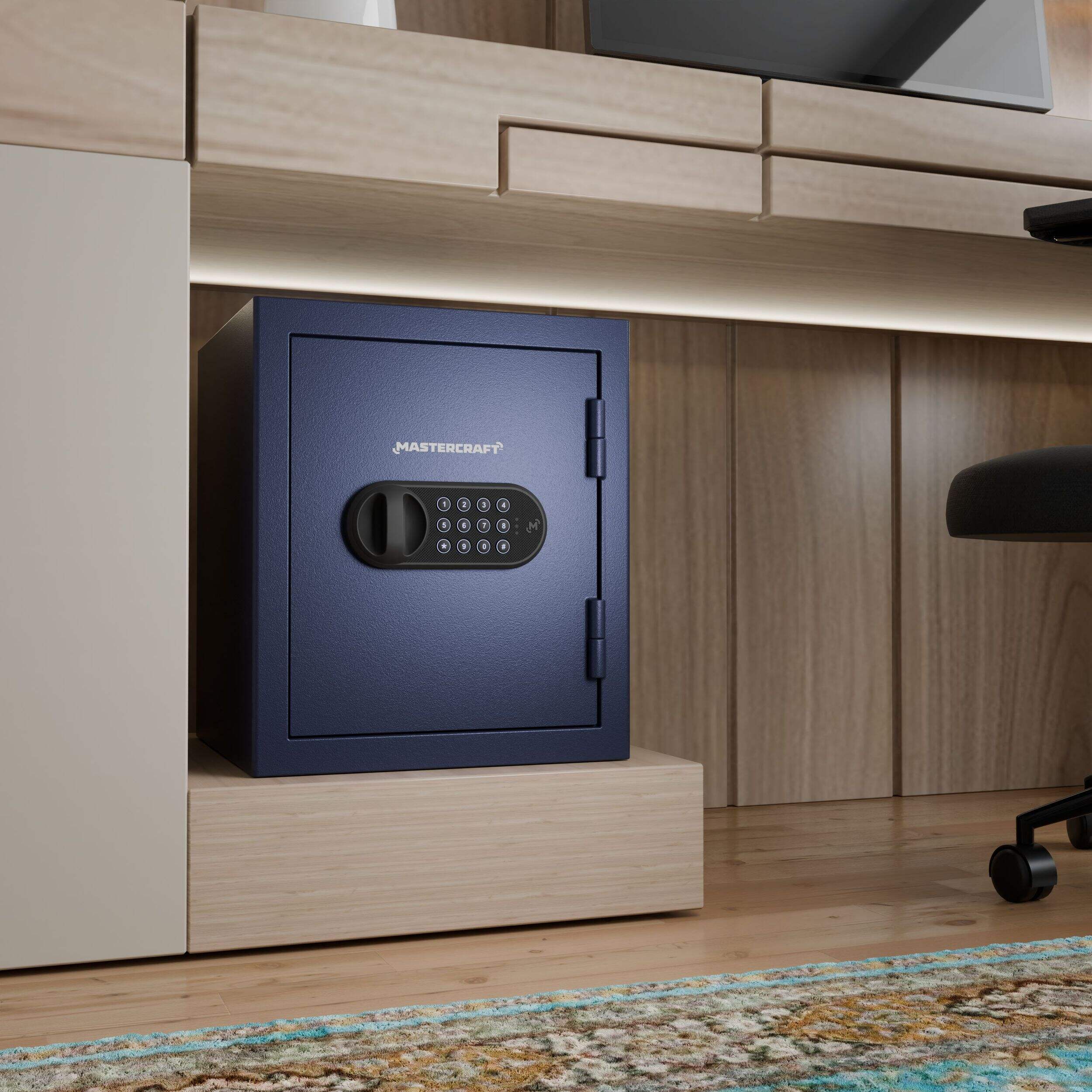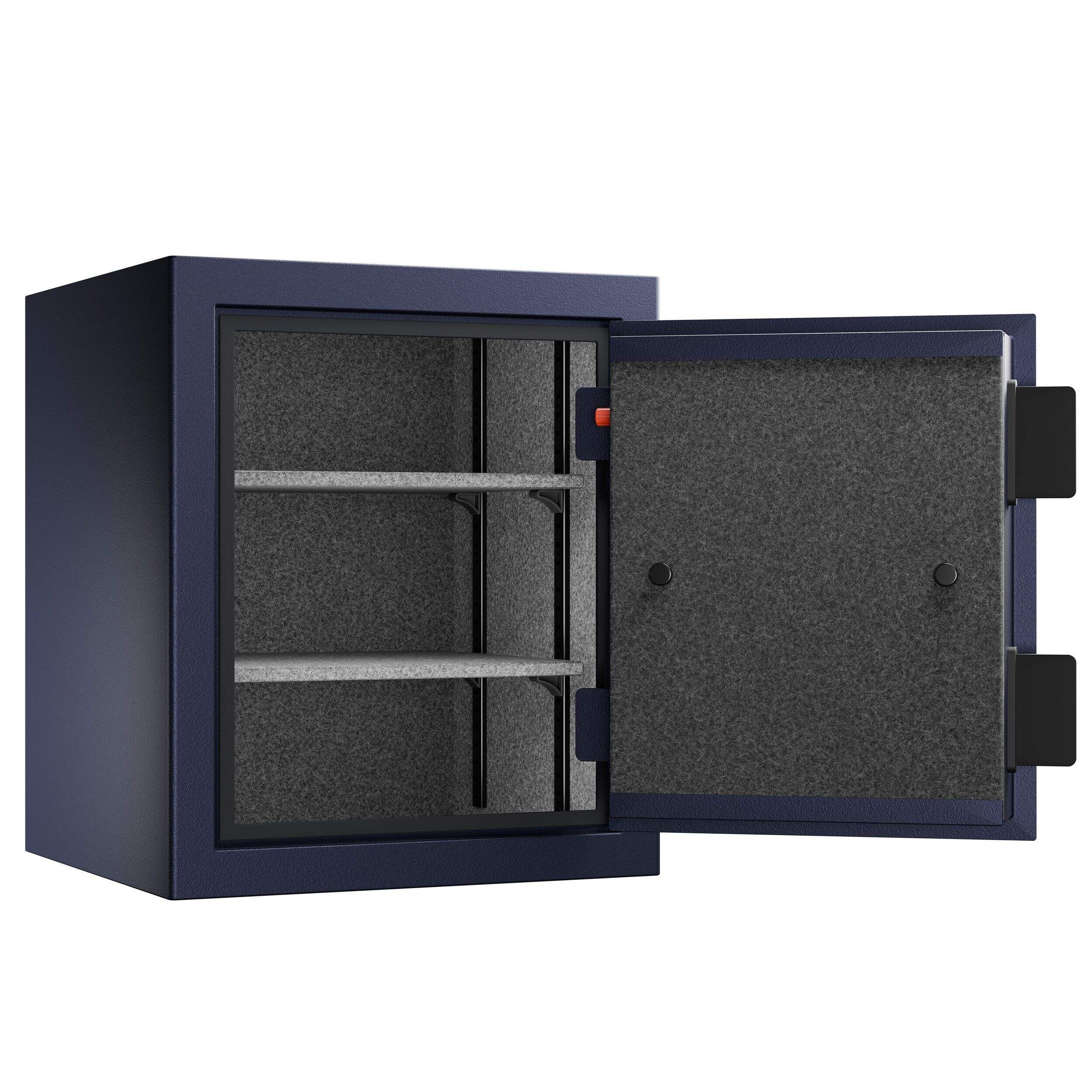 Secure storage for valuables and documents; Fire safe rated to withstand 45 minutes up to 1400°F (760°C); Steel locking plates provide wide surface area of protection against pry attacks; Illuminated electronic lock and two manual override keys; Fully carpeted interior with height-adjustable shelving; Sleek and durable Navy Blue powder coat finish; Bolt-down kit included; Lifetime Warranty covers entire safe against theft, fire, natural flood, and defective locks, parts, and paint;