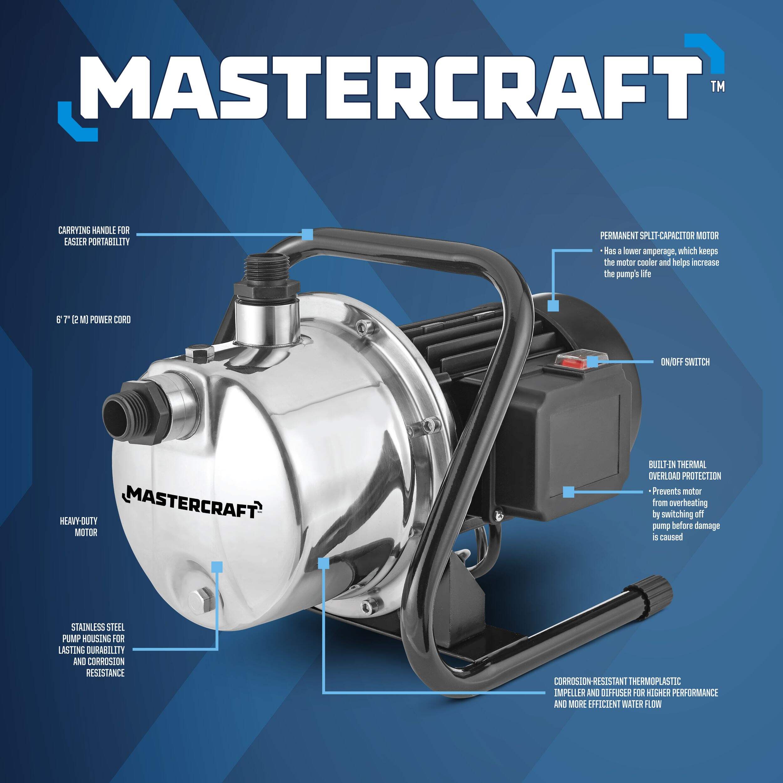 Easily irrigate many areas with the Mastercraft 1-1/2-HP Irrigation & Lawn Sprinkler Pump. This lawn sprinkler pump is ideal for pumping water from a lake, pond or stream to above-ground sprinklers. Powered by a heavy-duty 1 ½ HP motor, this irrigation water pump is designed for permanent installation. With a maximum flow of 1200 U.S. GPH (4542 L/h), this sprinkler pump runs on a permanent split-capacitator motor which offers lower amperage, keeping the motor cool while also increasing the longevity of the irrigation pump. The corrosion-resistant thermoplastic impeller and diffuser boost performance while also improving the efficiency of the water flow. This irrigation booster pump has a carrying handle for easy portability and an on/off switch for quick operation. The stainless-steel pump housing provides lasting durability and corrosion resistance. Built-in thermal overload protection prevents the motor from overheating by switching off the pump before damage occurs. This product includes a 6’7” (2m) power cord. To operate, you may need a hose, PVC pipes and PVC elbows (sold separately).