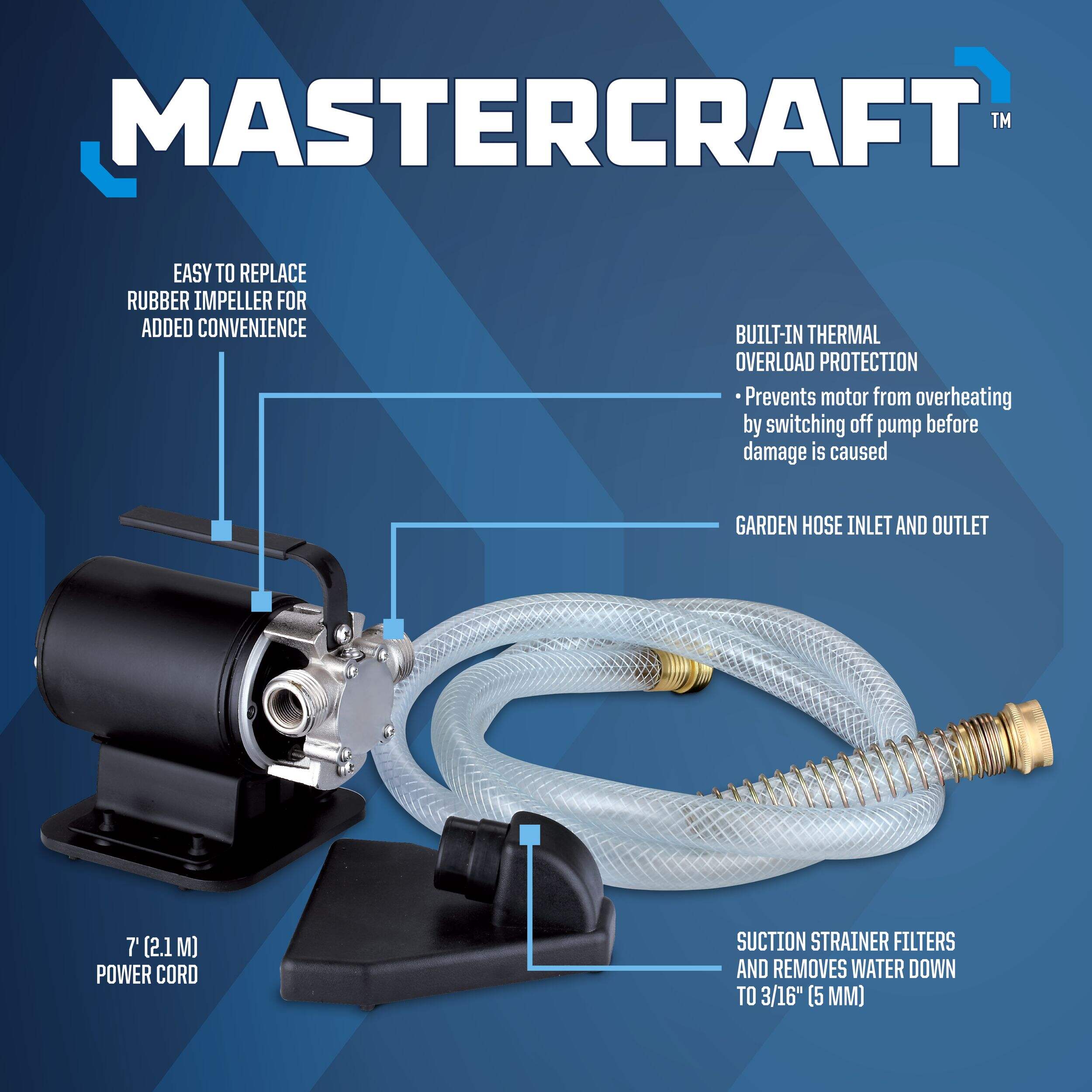 The Mastercraft 1/10-HP Non-Submersible Electric Utility Pump offers a reliable and versatile solution for small-scale water transfer tasks. Compact yet powerful, it excels at temporary water removal in a variety of settings. Built for durability, its sturdy construction ensures lasting performance, while its user-friendly design makes handling and operation effortless. Perfect for draining water beds, aquariums, water heaters, and puddles, this pump is an indispensable tool for everyday needs.