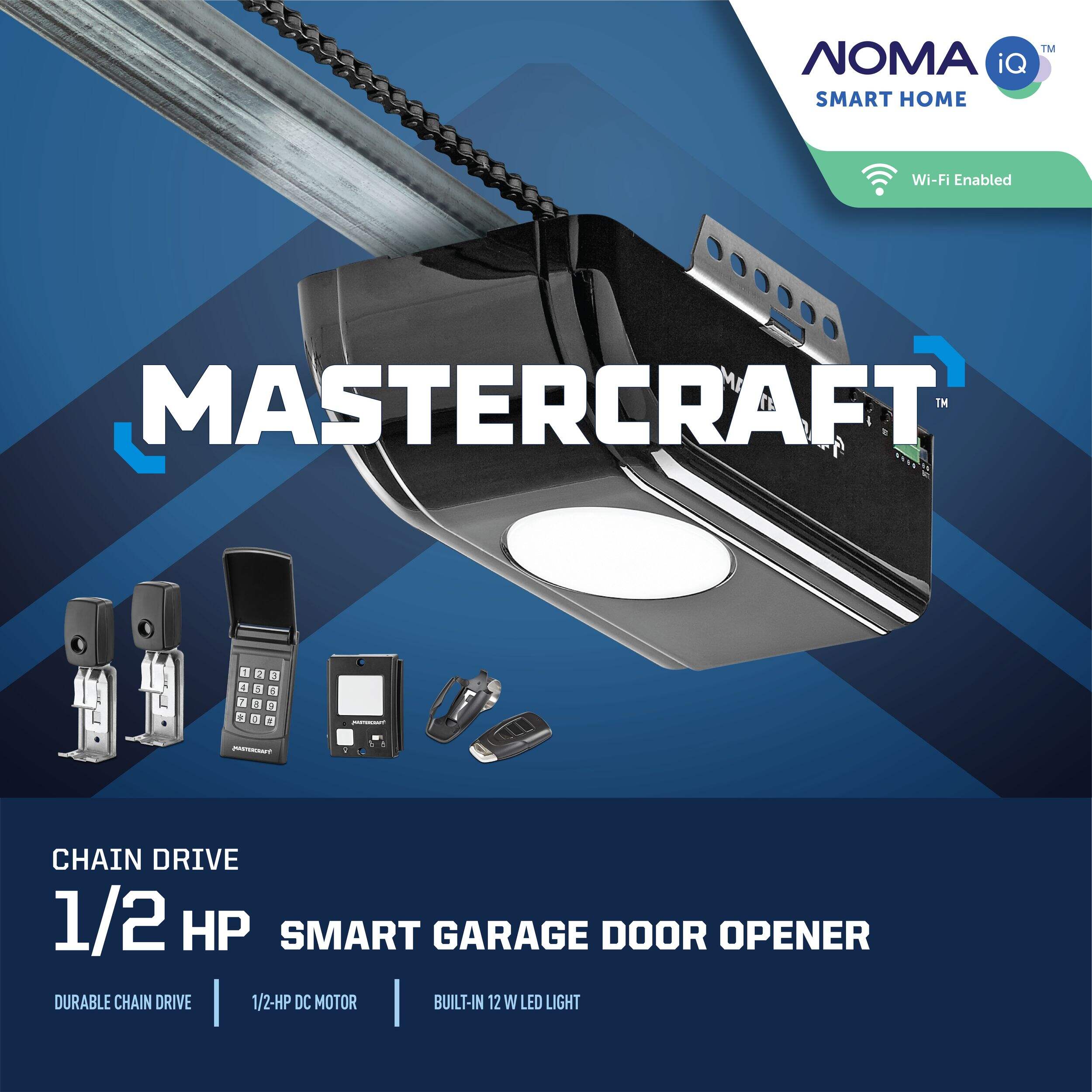 The Mastercraft Smart Garage Door Opener, Control and Monitor from NOMA iQ App, lets you control your garage from anywhere. The powerful 1/2 HP motor quietly and smoothly lifts even heavy doors while the built-in LED light illuminates your garage. Connect to the NOMA iQ app via WiFi to open and close your door from your phone, set schedules, and receive notifications and alerts. The chain drive system provides reliable performance for years to come.