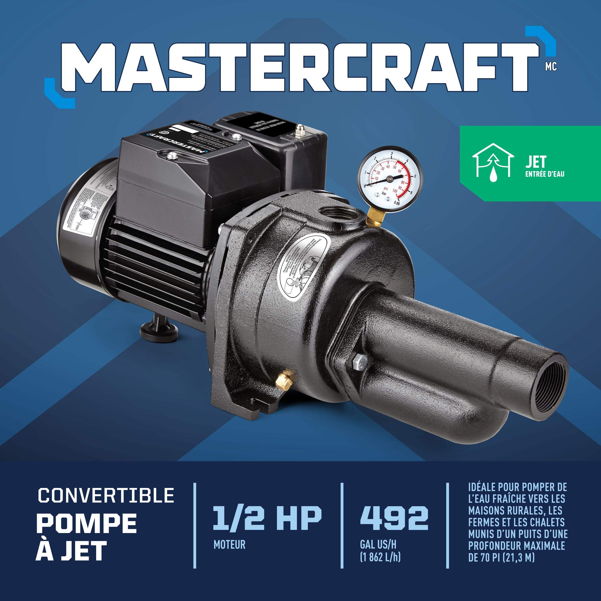 Efficiently manage well water with the Mastercraft Convertible Jet Pump, 1/2-HP, designed for permanent installation in rural homes, farms, and cottages. This pump is powered by a 1/2-HP motor, ensuring a reliable water supply. This jet pump offers superior durability, corrosion resistance, and effective heat dissipation for long-lasting performance. Tools such as an adjustable pipe wrench, screwdriver, and hacksaw may also be needed.
