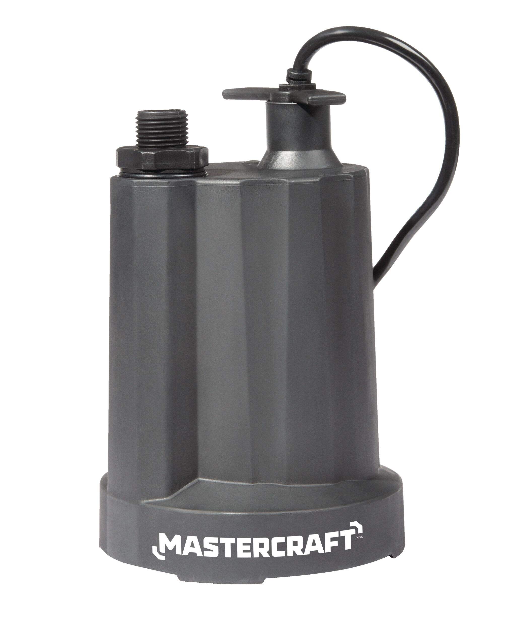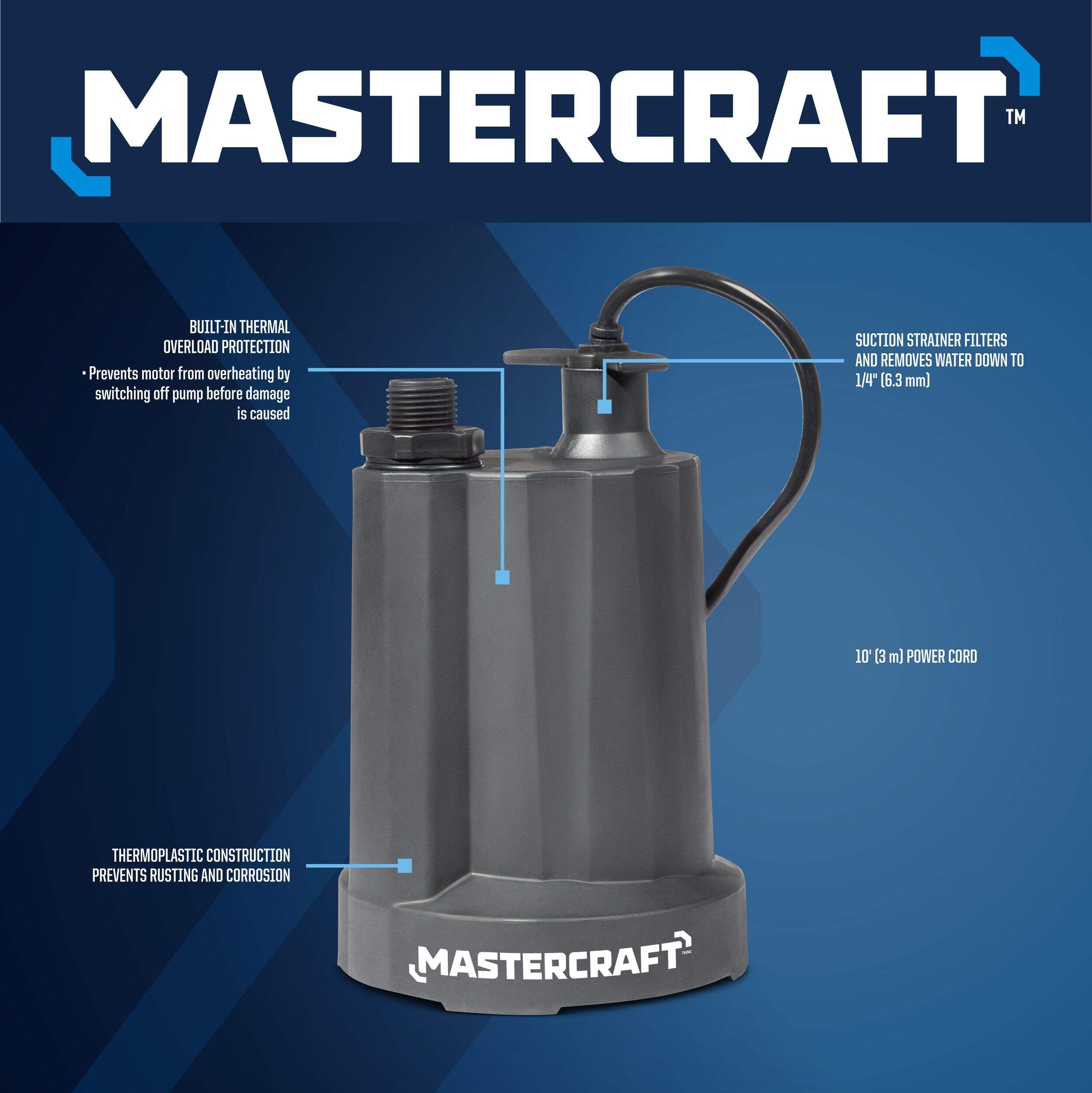 The Mastercraft 1/3-HP Submersible Utility Pump provides reliable standby support for sudden water emergencies and drainage needs. This submersible pump features a suction strainer that removes water from pools, boats, flooded basements and large flooded areas down to ¼” (6.3mm). Designed for temporary installation, this utility water pump has built-in thermal overload protection and rust resistant thermoplastic construction.