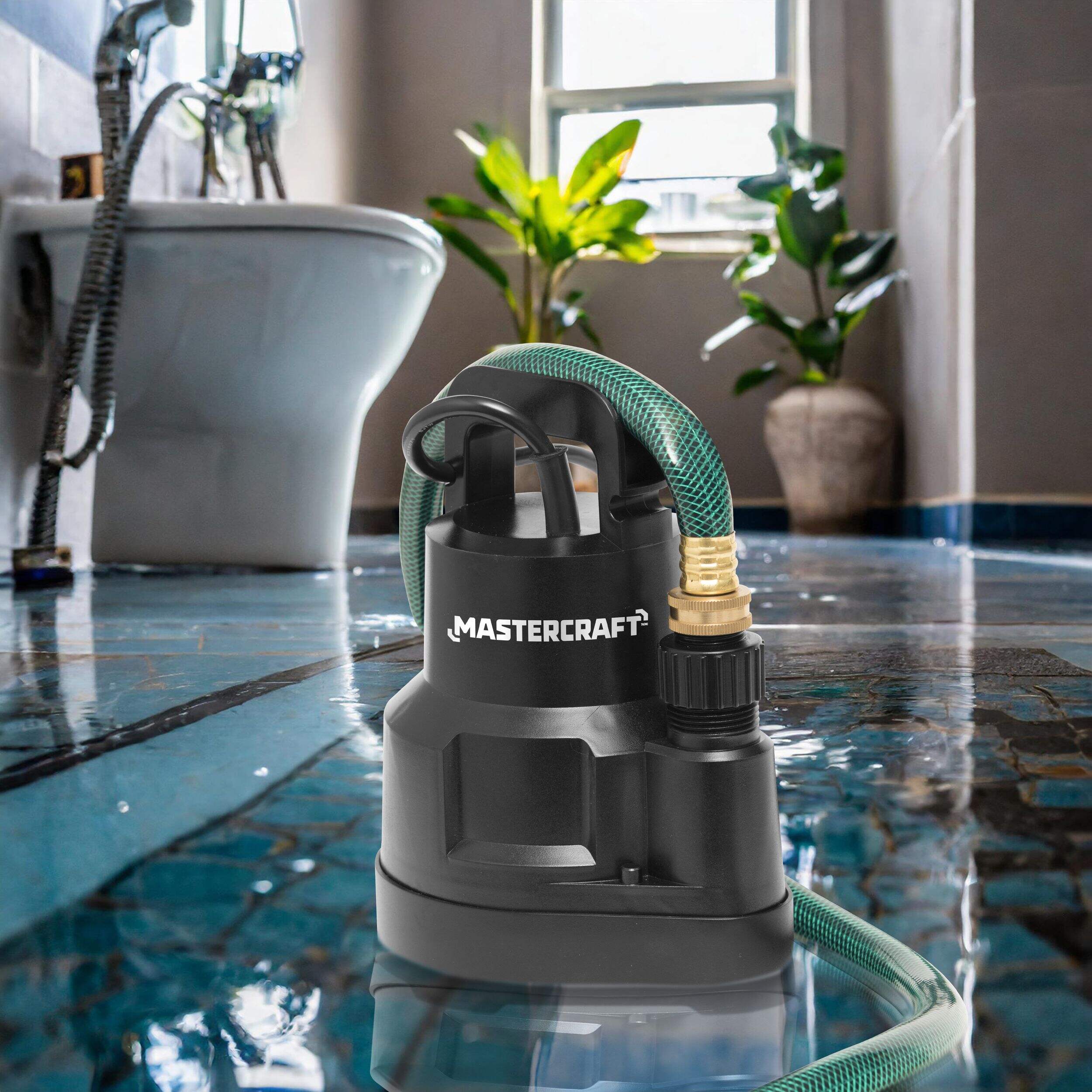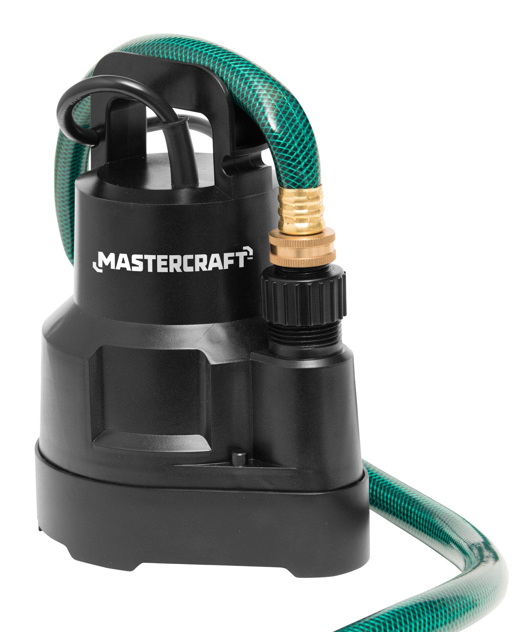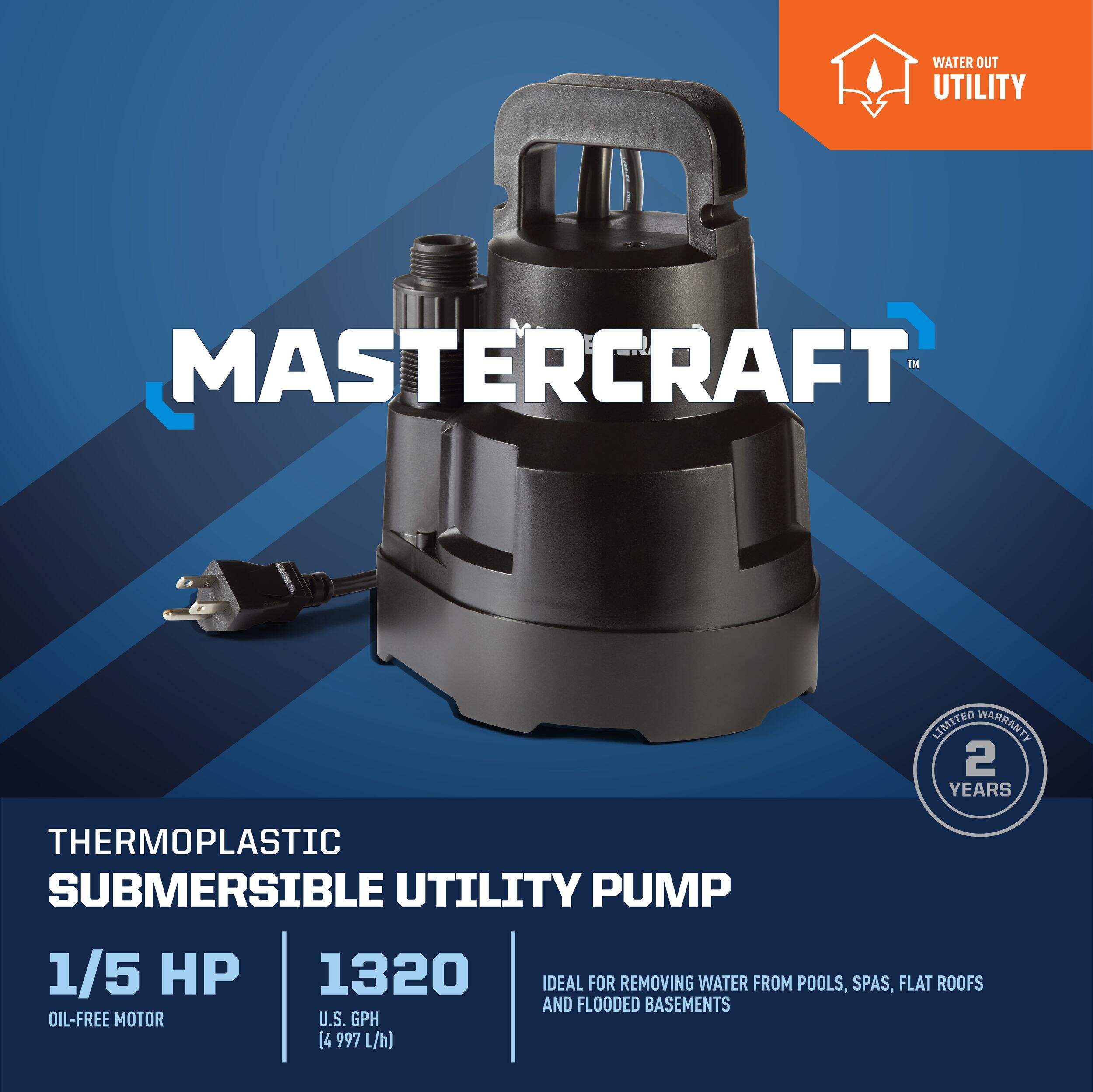 Efficiently manage water in many areas with the Mastercraft 1/5-HP Submersible Utility Pump. Designed for temporary installation, this electric utility pump is ideal for removing water fast. Powered by a long-lasting, oil-free 1/5 HP motor, this submersible utility pump has a maximum flow rate of 1320 GPH (4997 L/h). This utility sink pump has a special intake screen that reduces the risk of clogging and pump damage by filtering out grit and other debris.