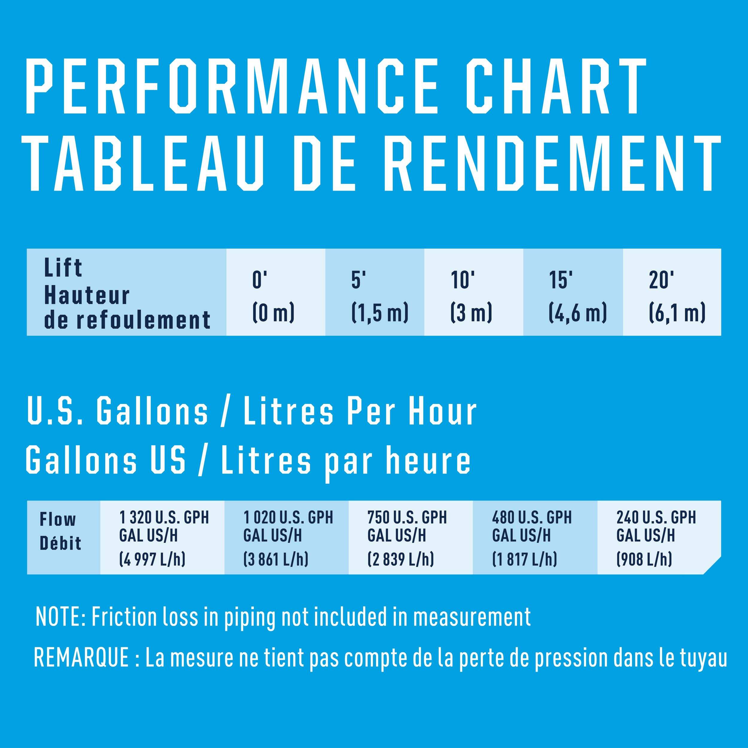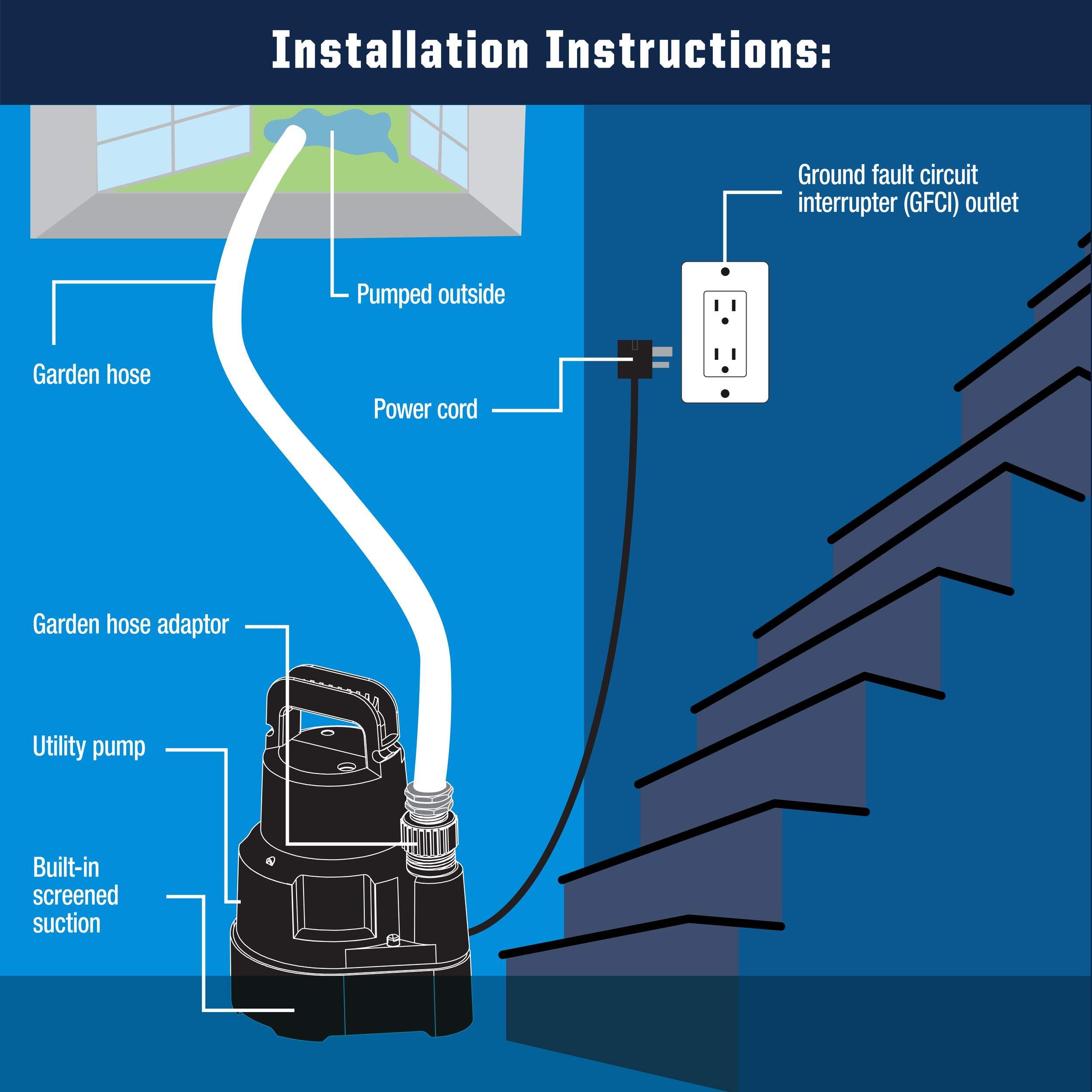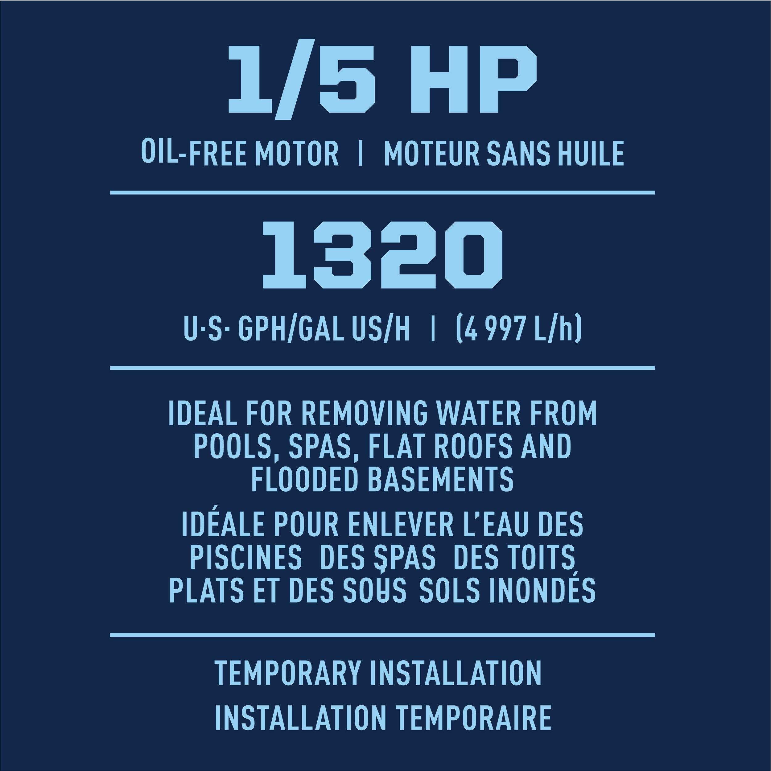 Efficiently manage water in many areas with the Mastercraft 1/5-HP Submersible Utility Pump. Designed for temporary installation, this electric utility pump is ideal for removing water fast. Powered by a long-lasting, oil-free 1/5 HP motor, this submersible utility pump has a maximum flow rate of 1320 GPH (4997 L/h). This utility sink pump has a special intake screen that reduces the risk of clogging and pump damage by filtering out grit and other debris.