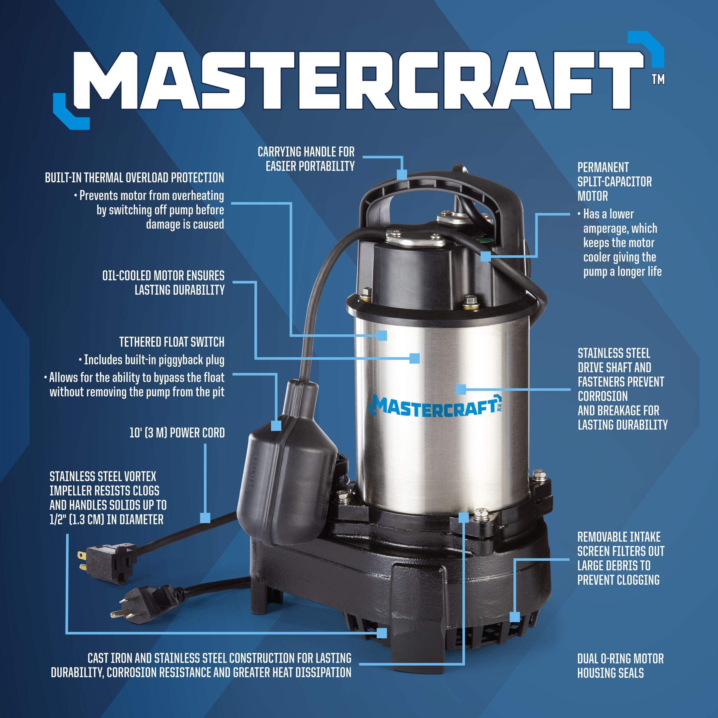 The Mastercraft 1-HP Submersible Electric Sump Pump is designed to offer powerful performance for your high-capacity pumping needs. This pump is perfect for draining water from basements and sump pits. Portable and easy to handle, this sump pump includes a 10-ft (3m) power cord. Installation may require additional accessories such as a check valve, rigid pipe, and basic tools (sold separately).
