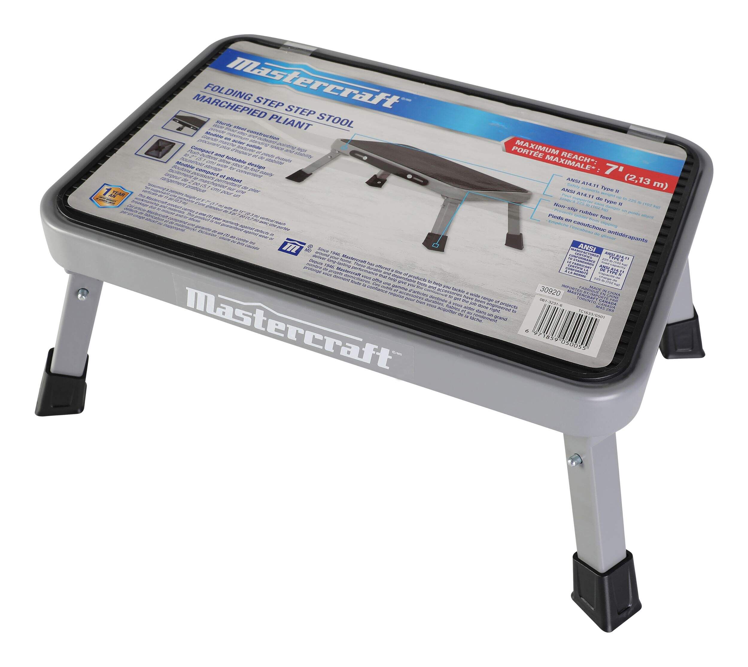 The Mastercraft Folding Step Stool is a seriously compact and convenient addition to your existing home, garage, or warehouse storage setup. This folding step stool provides a 7’ (2.13 m) reach, enough to reach the highest shelves of most cabinets and similar storage units. The stool has a durable solid steel frame, and features a set of non-slip feet to prevent any sliding while the stool is being used for work. The small platform features spring button locks, permitting you to fold and unfold the entire setup quickly.