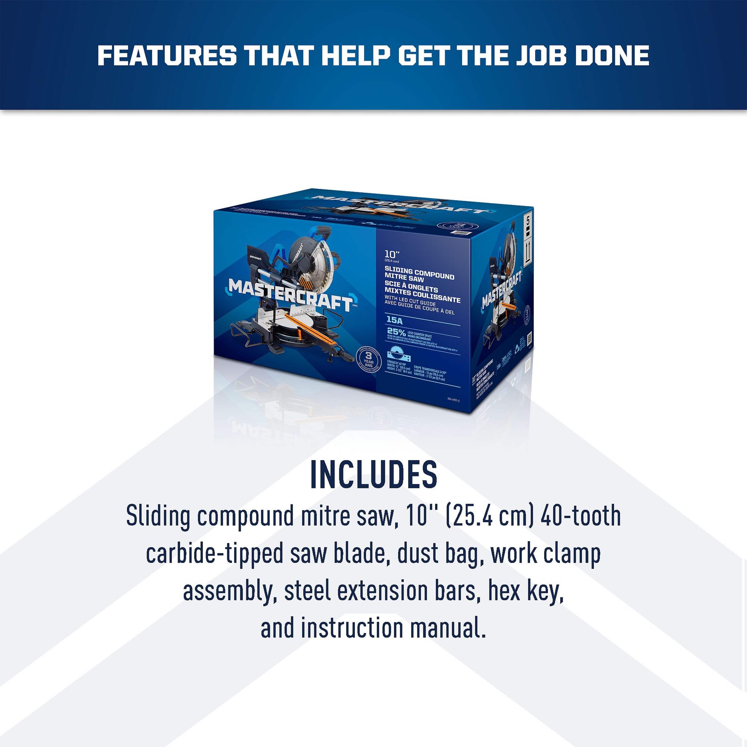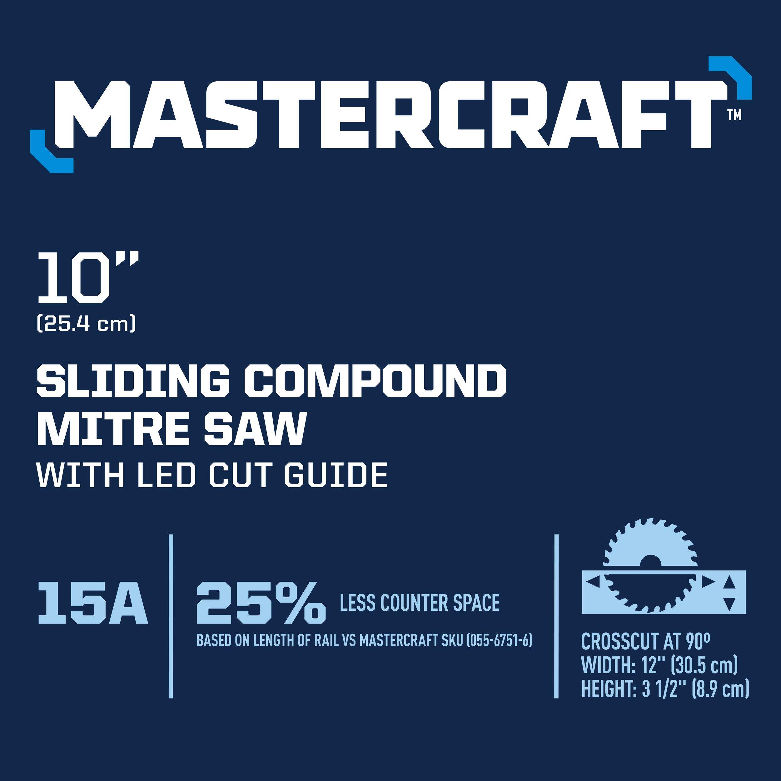 The Mastercraft Sliding Compound Mitre Saw delivers power and precision, making it perfect for a range of cutting tasks. Its easy-to-read bevel scale allows for accurate adjustments, while the 15-amp motor provides the strength for smooth, efficient cuts. With a depth of cut at 90° and a crosscut capacity at 90°, this saw is designed to handle larger materials effortlessly, offering versatility and reliability for both professional projects and DIY needs.