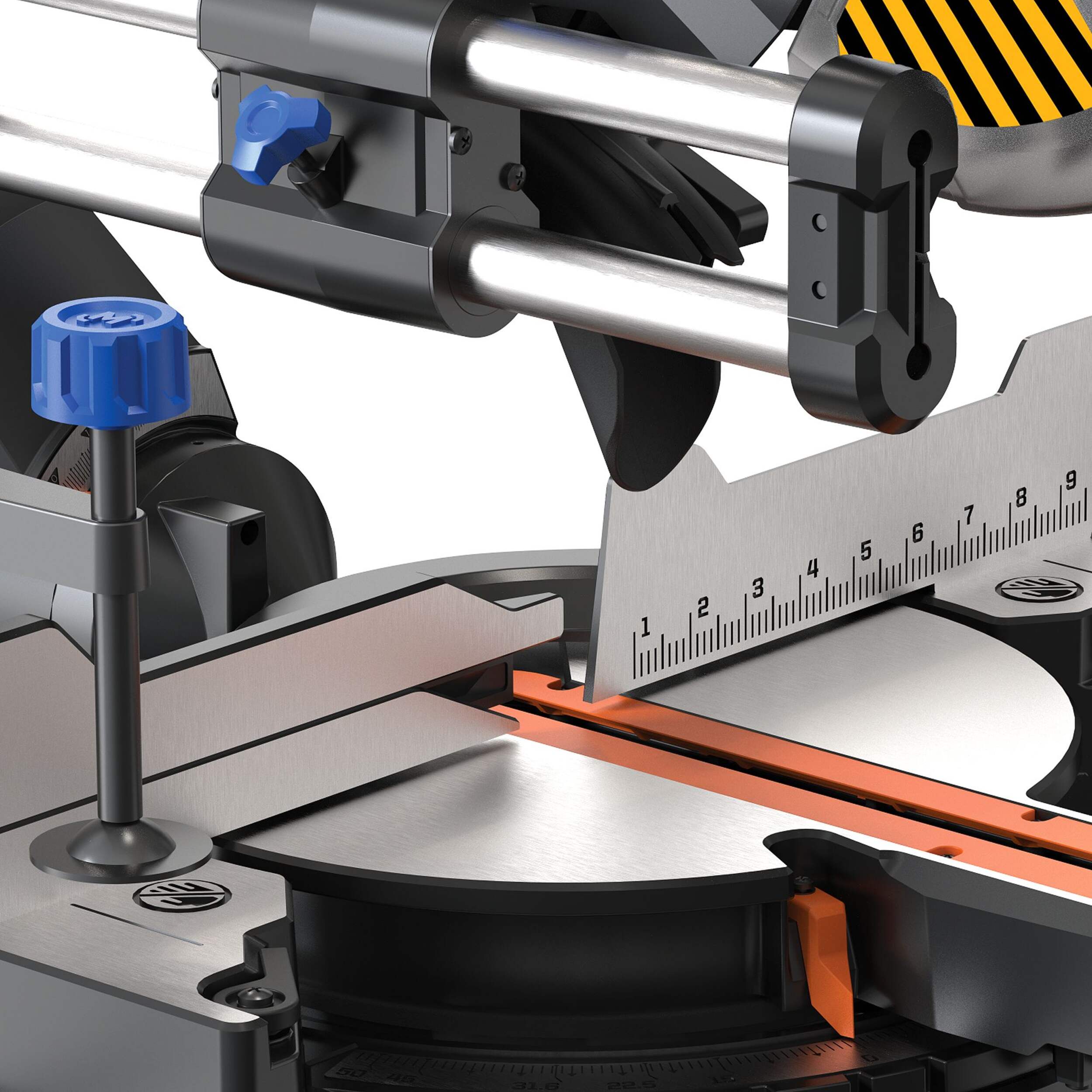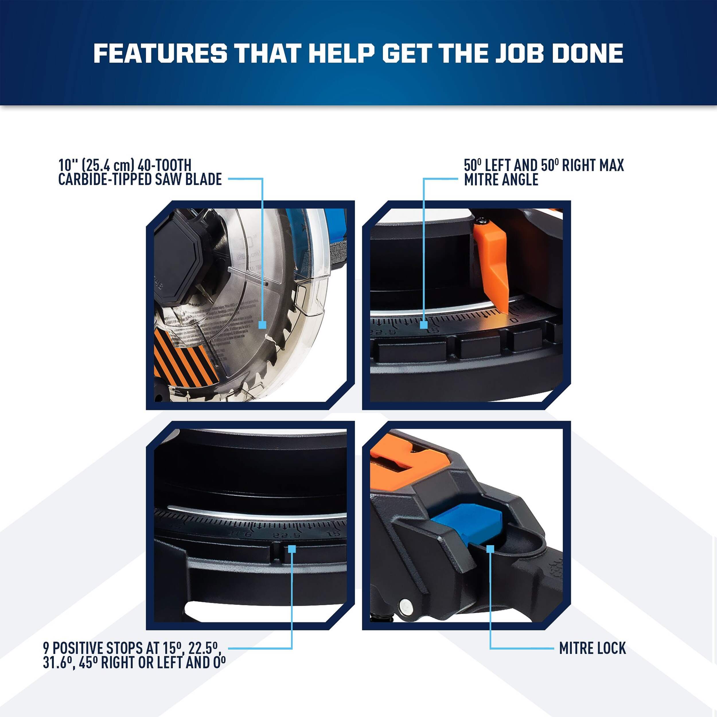 9 positive stops at 15°, 22.5°,31.6°, and 45° right or left and 0° for quick and easy angle adjustments