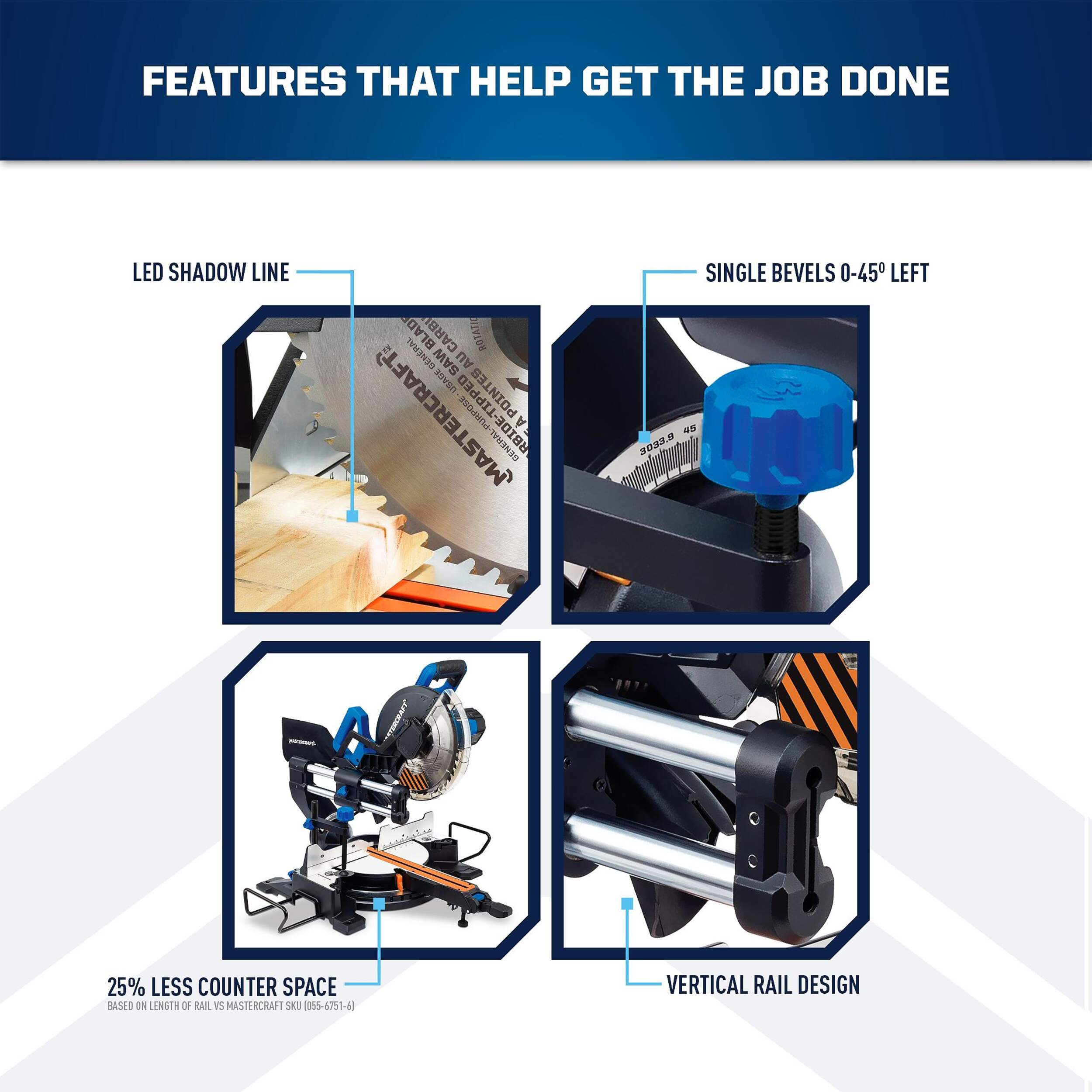 Vertical rail design allows saw to work while flush against a wall and take up 25% less counter space based on length of rail vs Mastercraft SKU (055-6751-6)