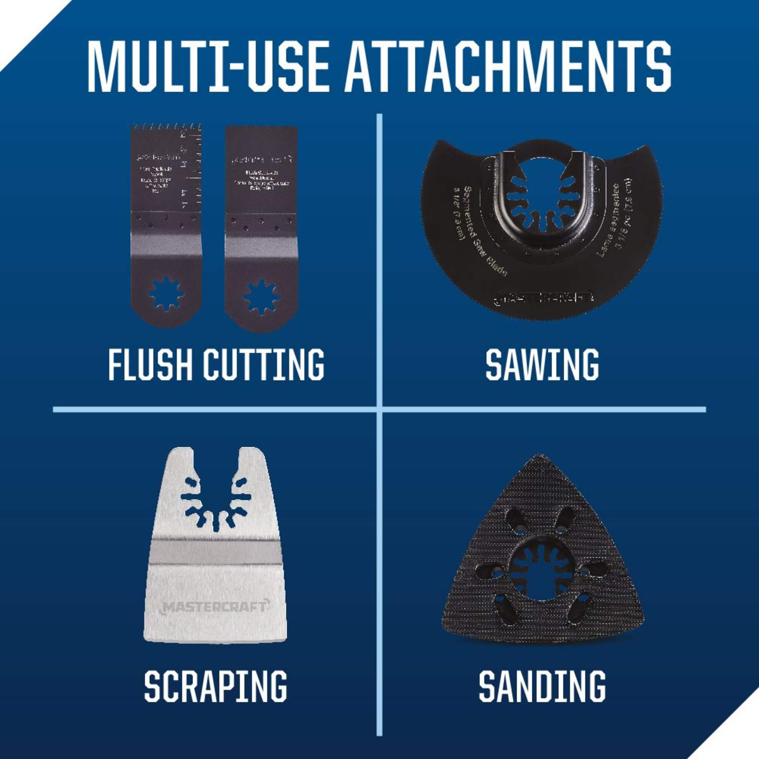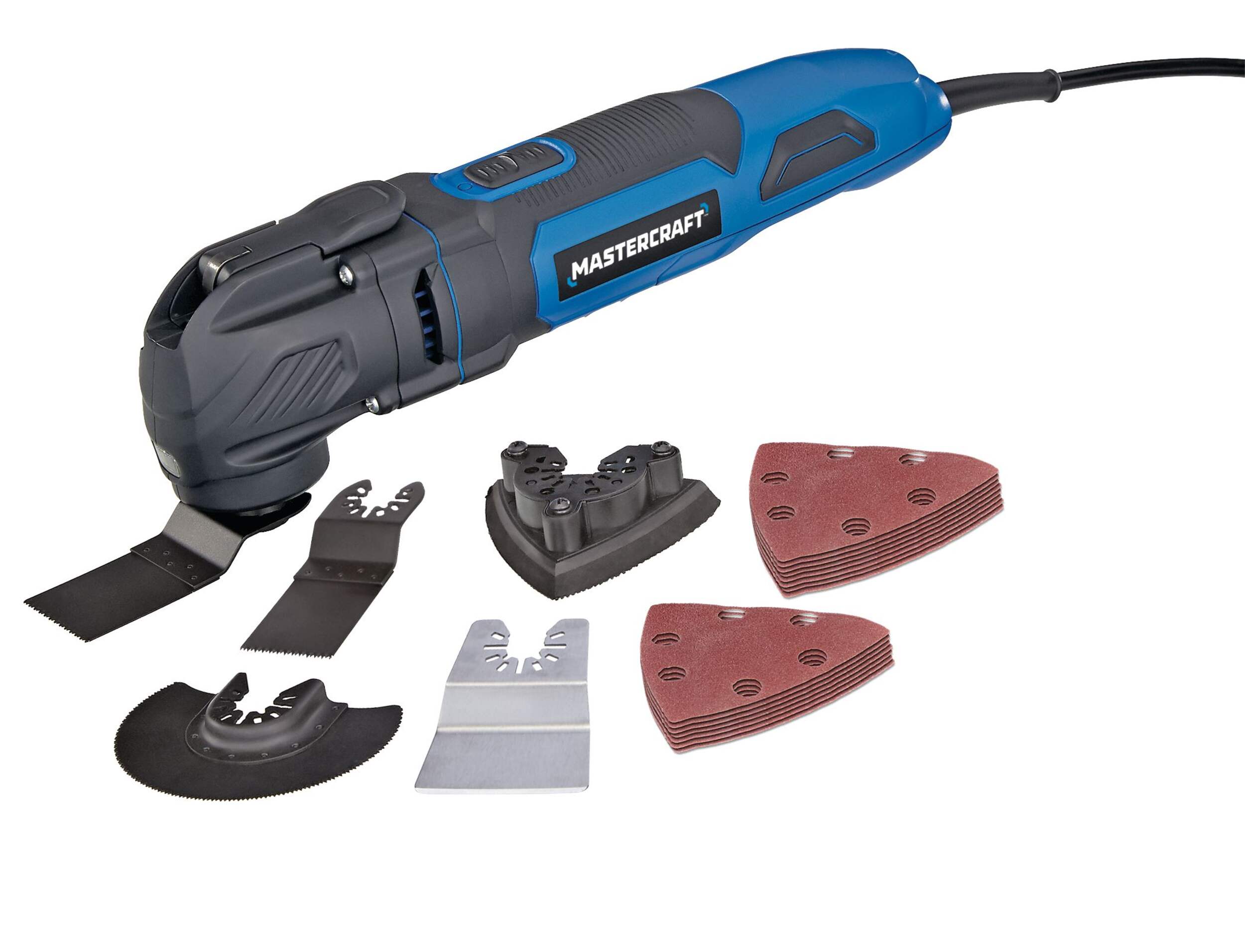 Tackle multiple jobs with the Mastercraft 2.5A Variable Speed Oscillating Multi-Tool with Accessory Blade & Sanding Kit. This extensive 20-piece set is an essential power tool for contractors, offering unlimited versatility for cutting, sanding, scraping, and more. The multi-tool kit includes essential accessories like a built-in LED light, and provides unmatched versatility, power, and convenience to handle multiple project types.