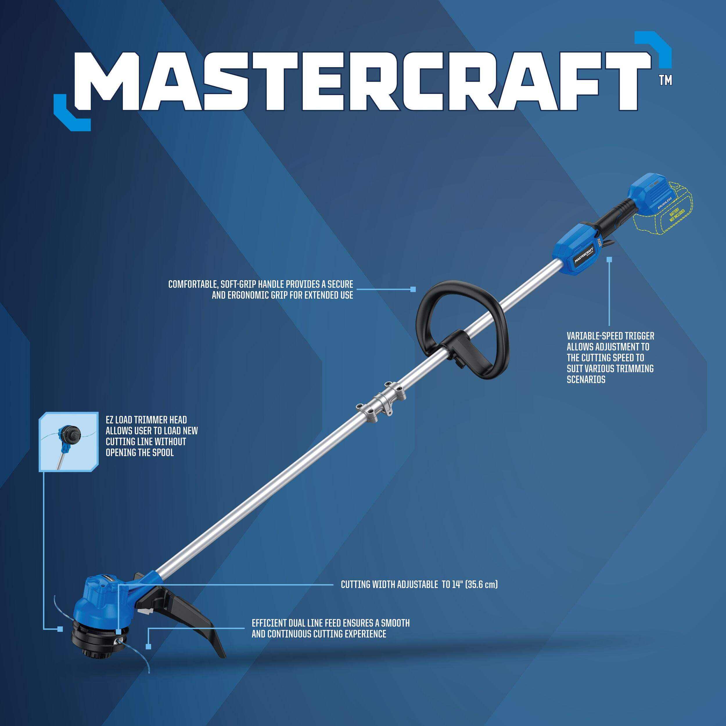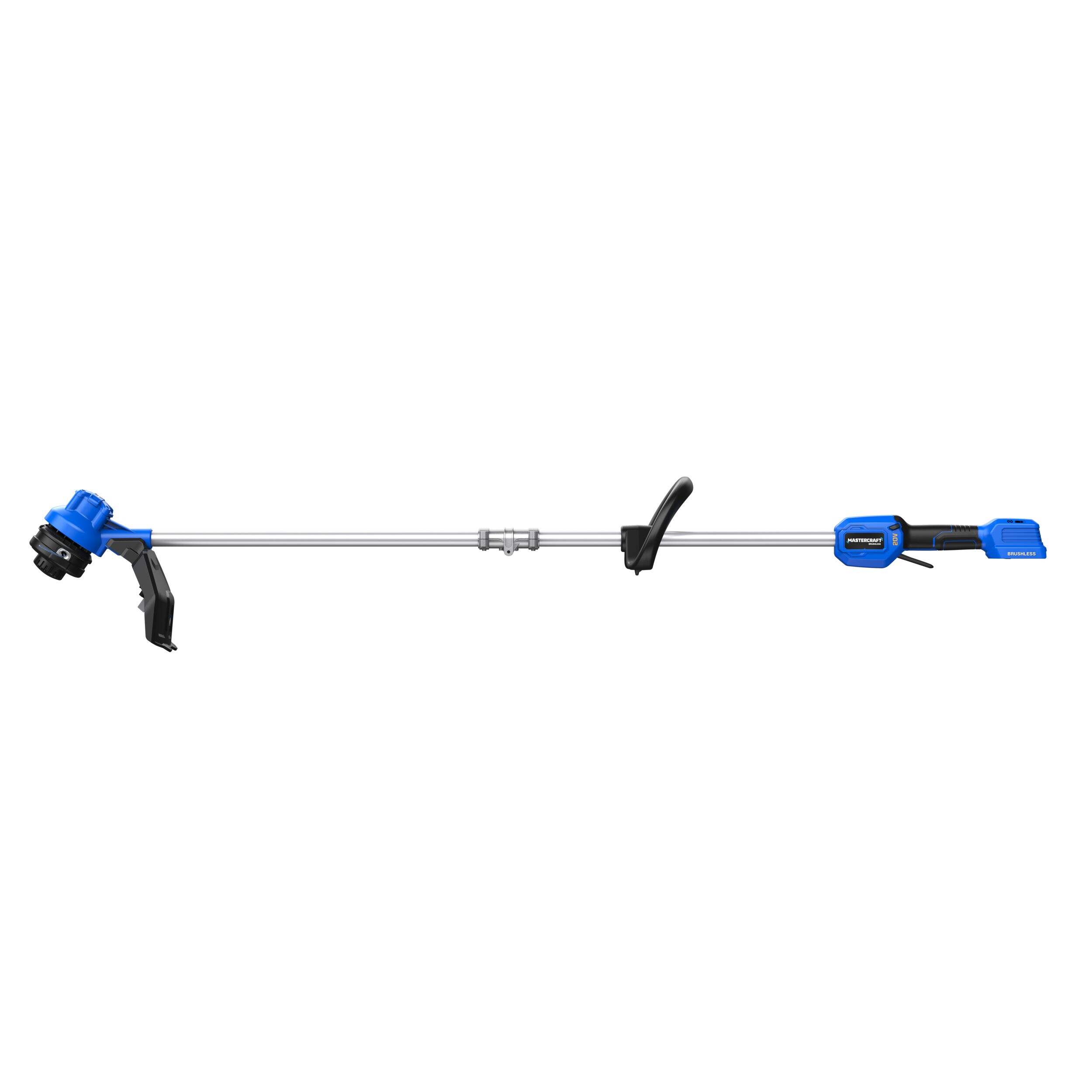 The Mastercraft 20V Brushless Cordless Grass String Trimmer is designed to tackle your gardening needs. This trimmer offers adjustable cutting widths, ideal for various landscaping requirements. Its rapid reload head makes line replacement quick and easy while the variable-speed trigger enhances control, adapting the speed for different trimming needs. With a comfortable, soft-grip handle, this durable trimmer provides a secure hold during extended use.