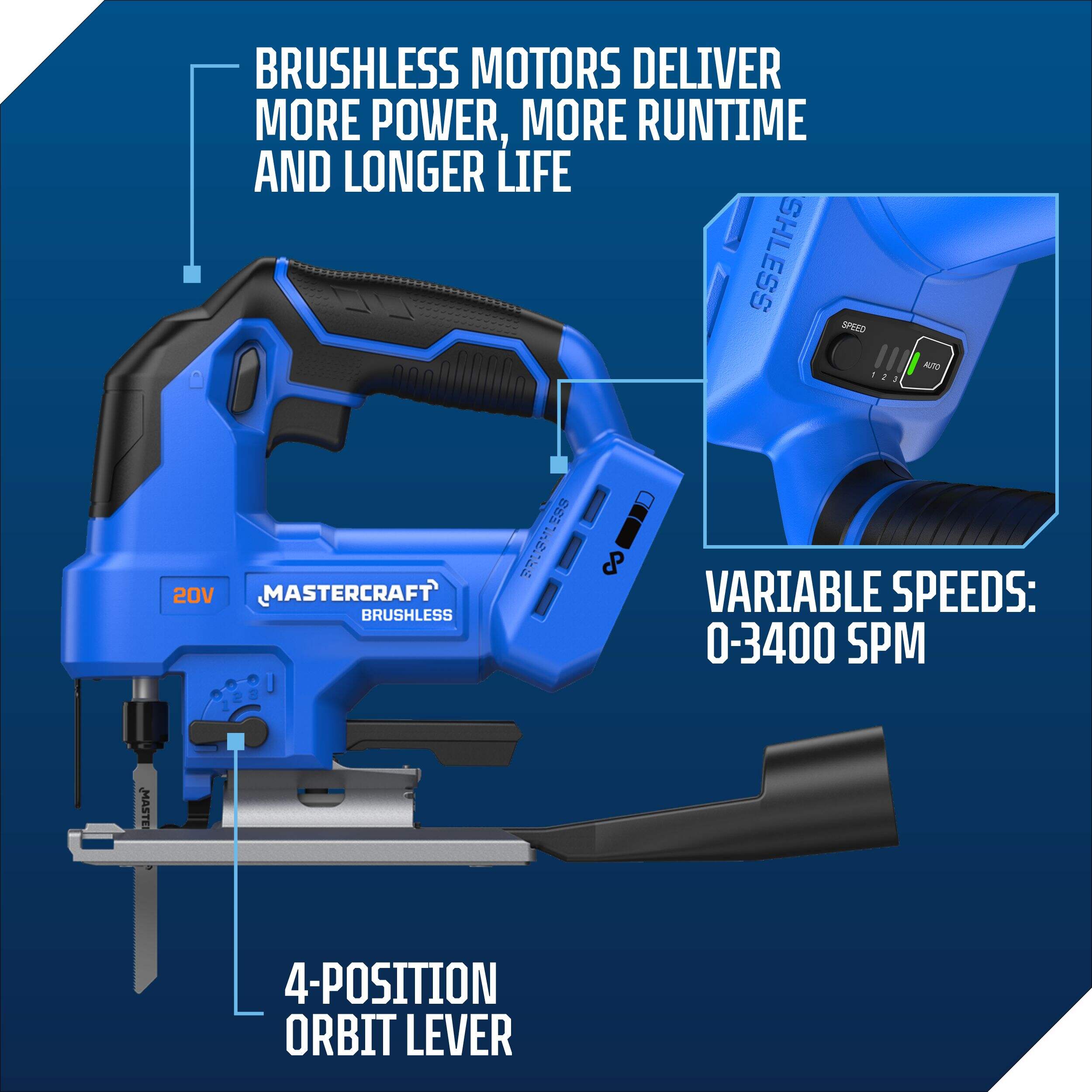 The Mastercraft 20V Brushless Jigsaw provides efficient and precise cutting for various projects. Its brushless motor offers smooth operation, while features like quick blade changes and adjustable speeds enhance control. The built-in LED light improves visibility, and safety is prioritized with a trigger lock-off button, making it suitable for intricate or large-scale tasks.