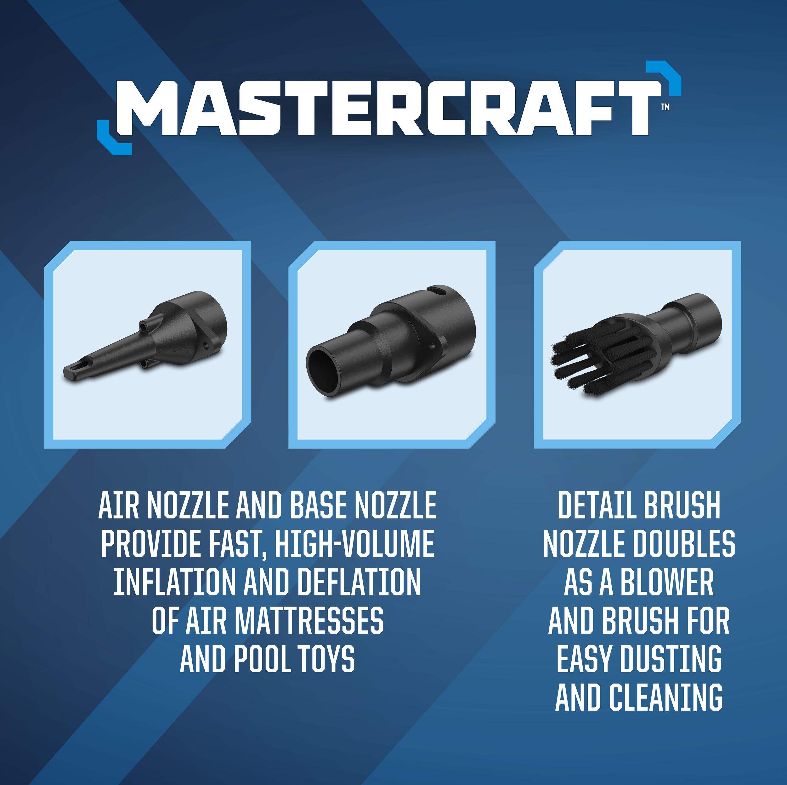 The Mastercraft 20V High Volume Inflator/Blower is perfect for handling household inflating and blowing tasks efficiently. Its compatibility with multiple battery types ensures convenience, while the included nozzles make it adaptable for different needs.