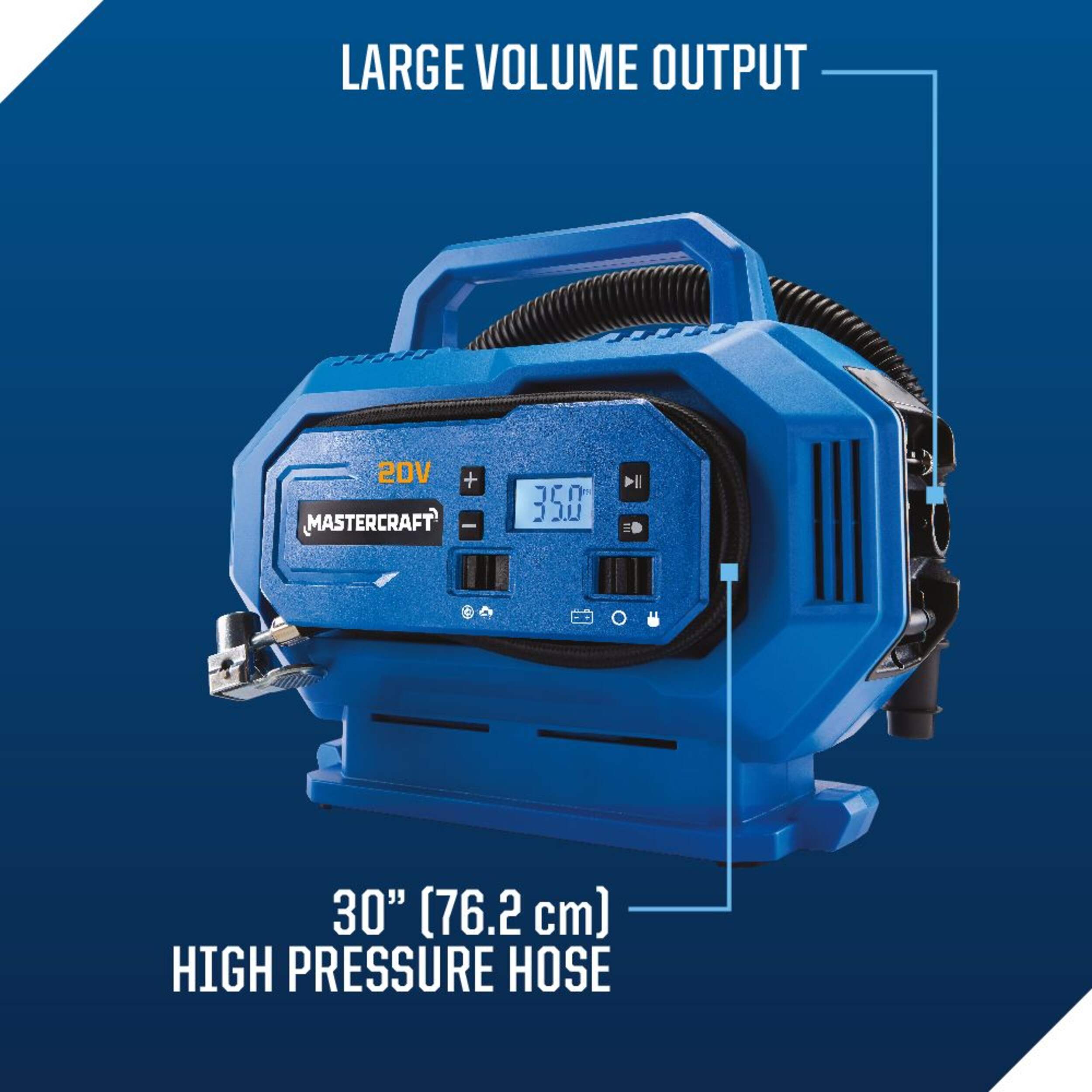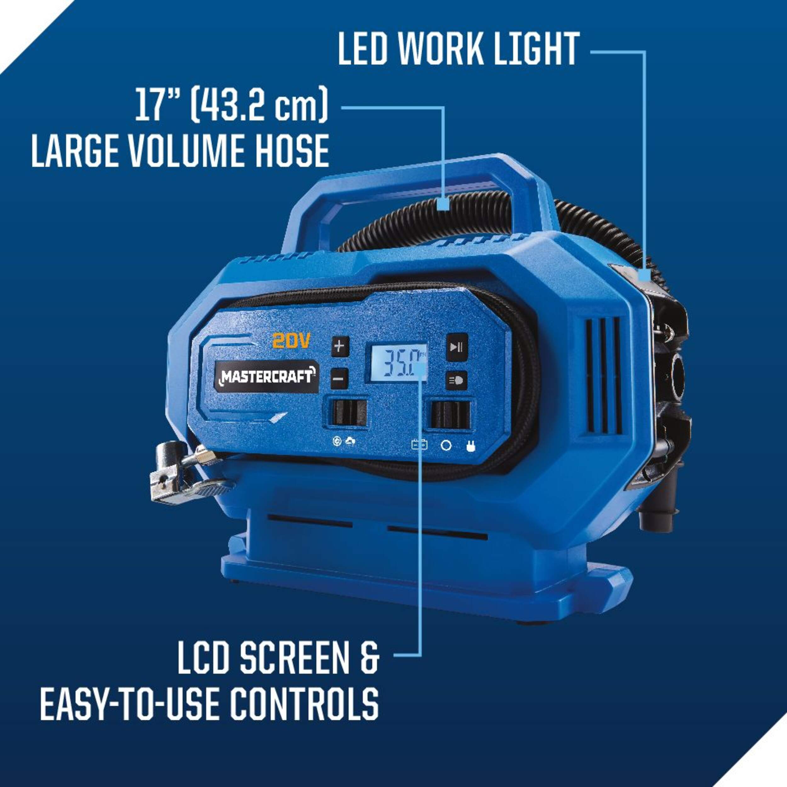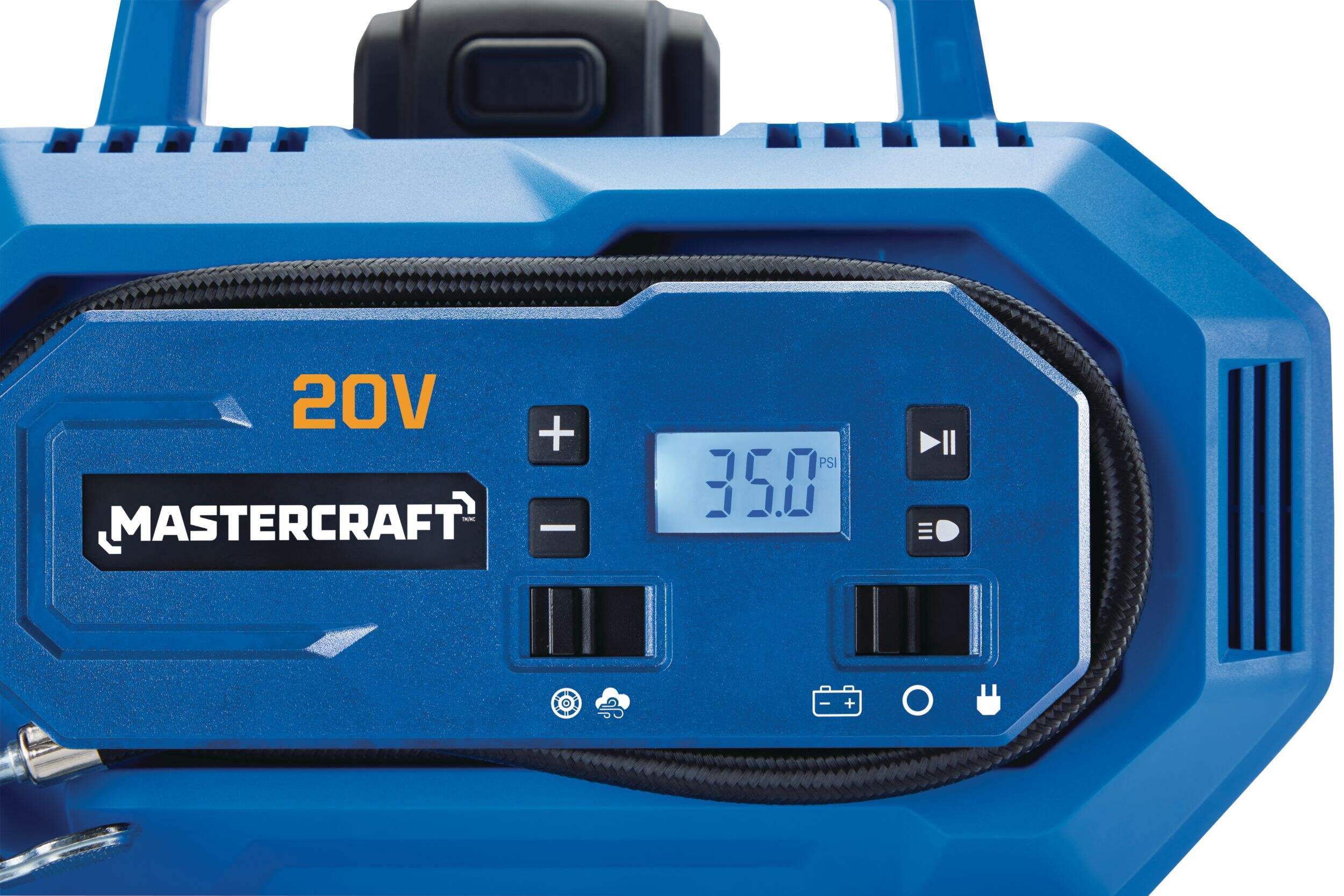 Introducing the Mastercraft 20V Max Lithium-Ion Cordless Dual Function Air Inflator with Gauge. This versatile tool is perfect for inflating tires, sports equipment, and more. With its dual function capability, it can handle both high-pressure and high-volume inflation tasks. The built-in gauge ensures accurate pressure readings, while the cordless design offers convenience and portability. Compatible with PWR POD batteries, this inflator is a must-have for any toolkit.