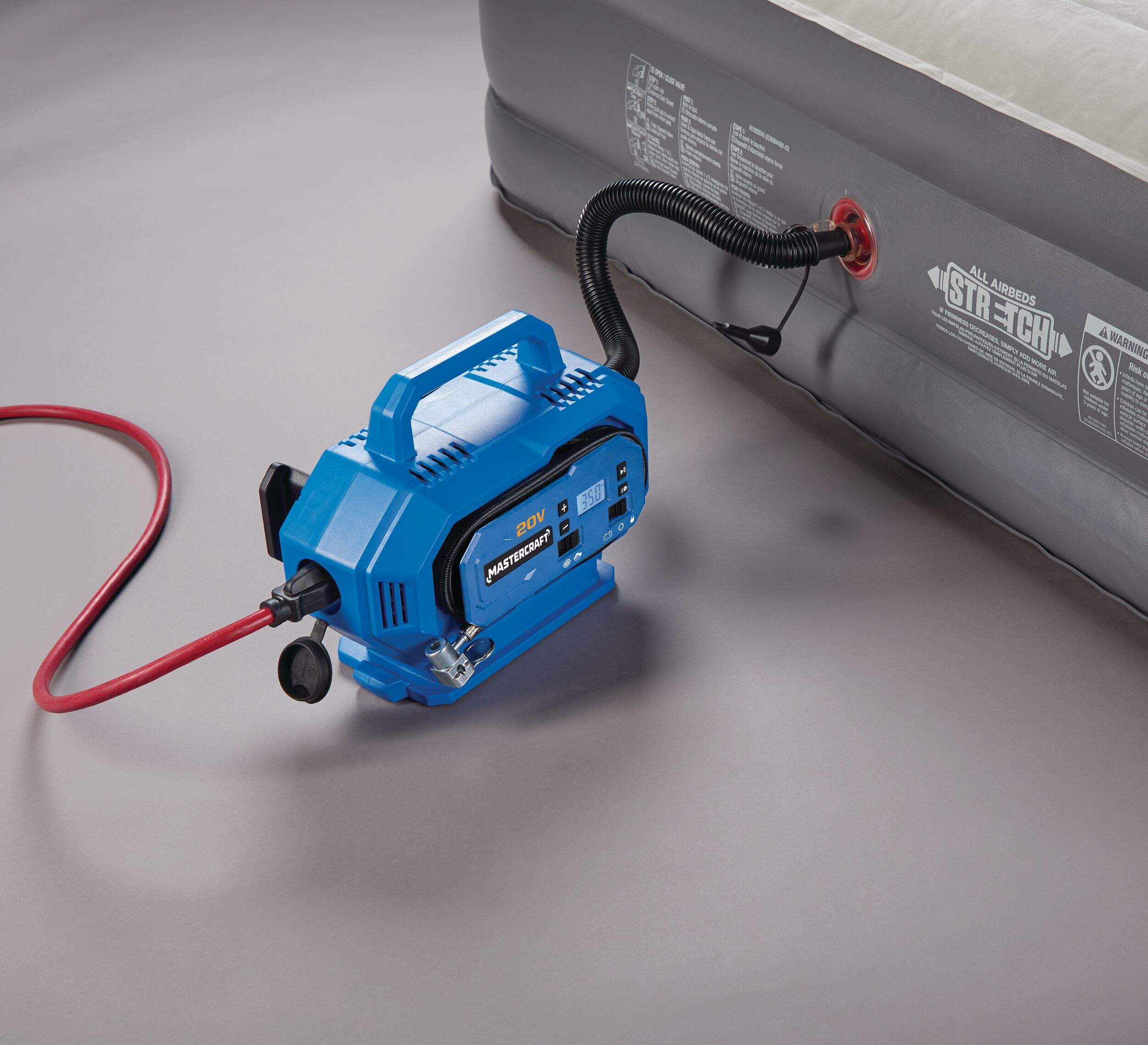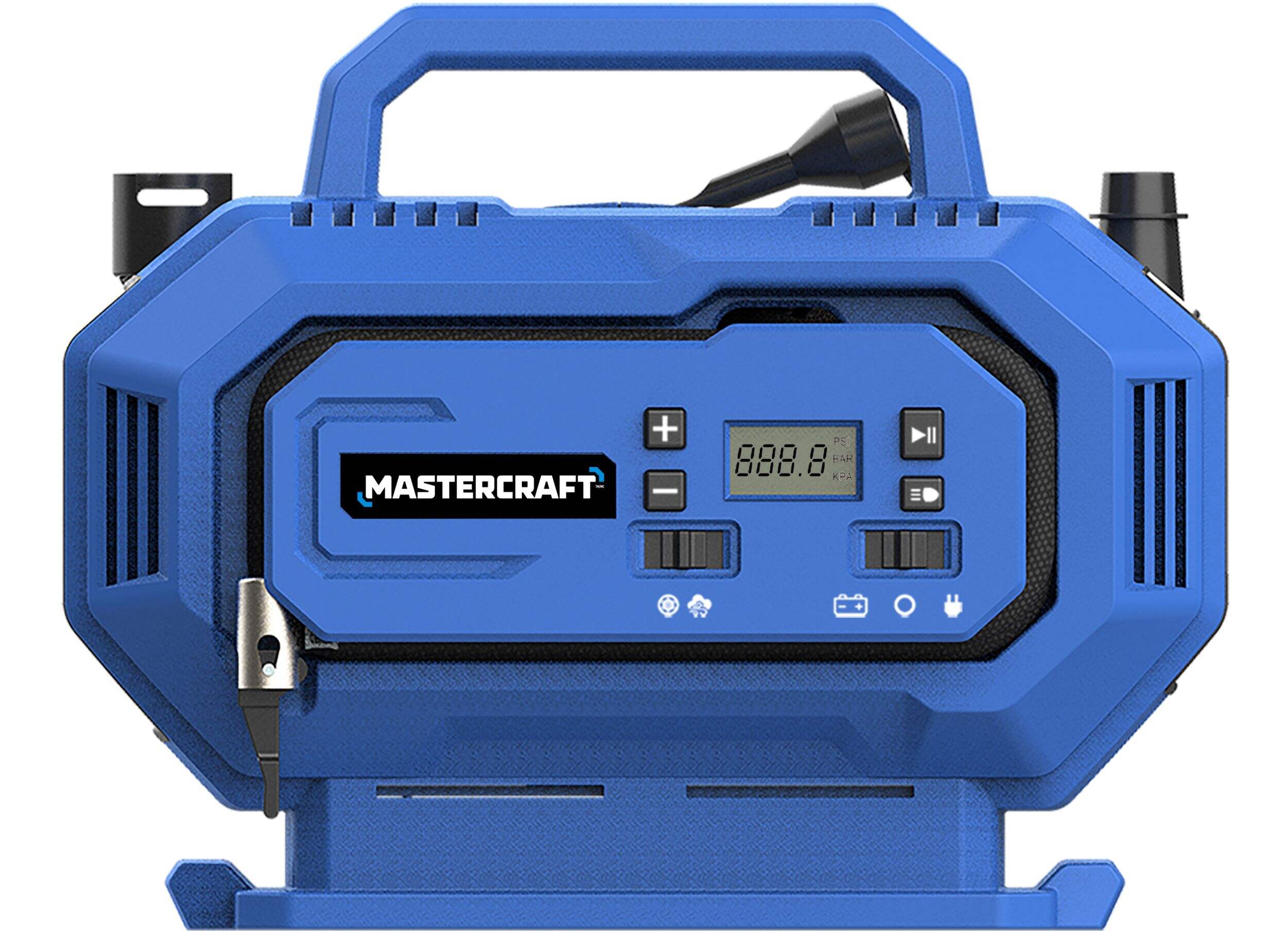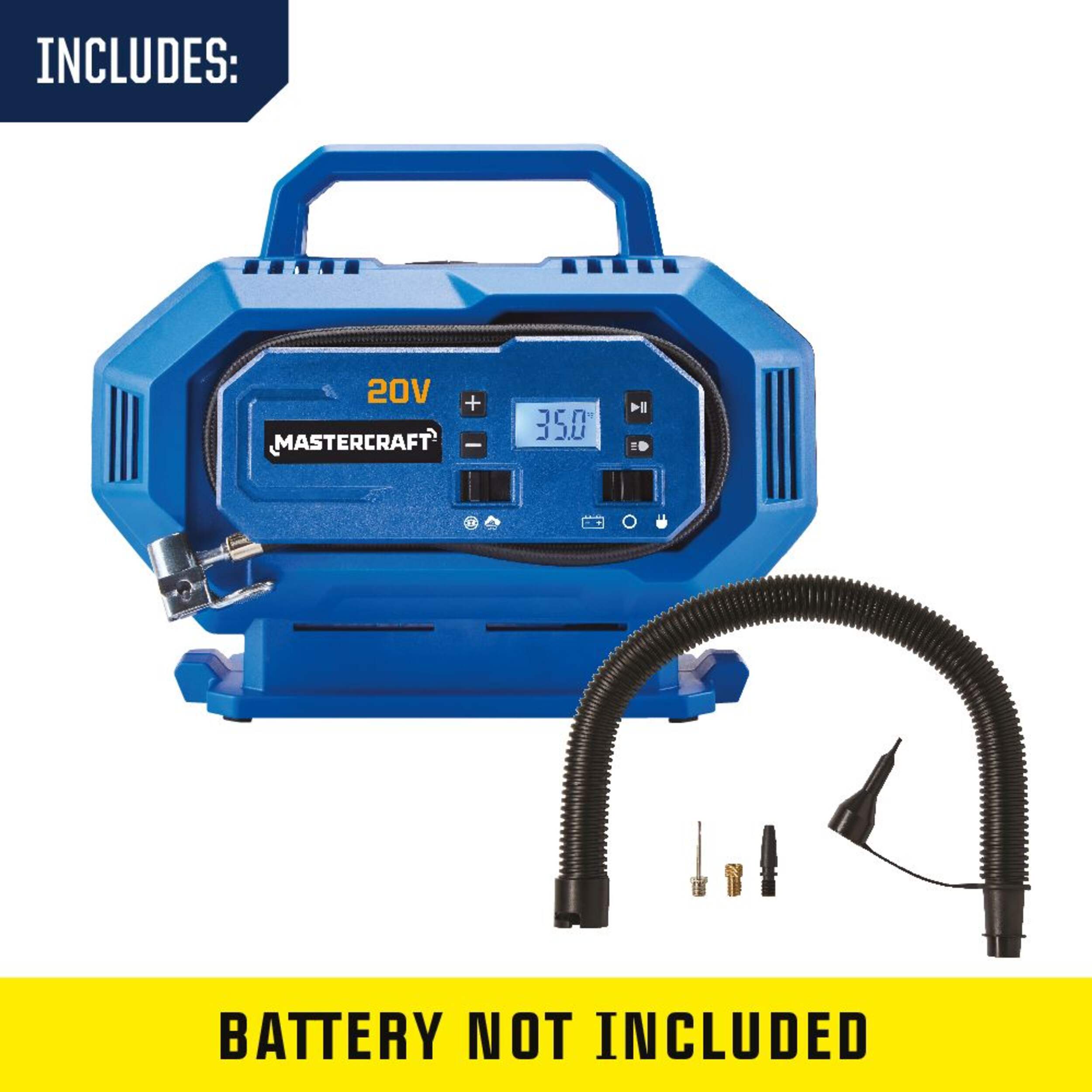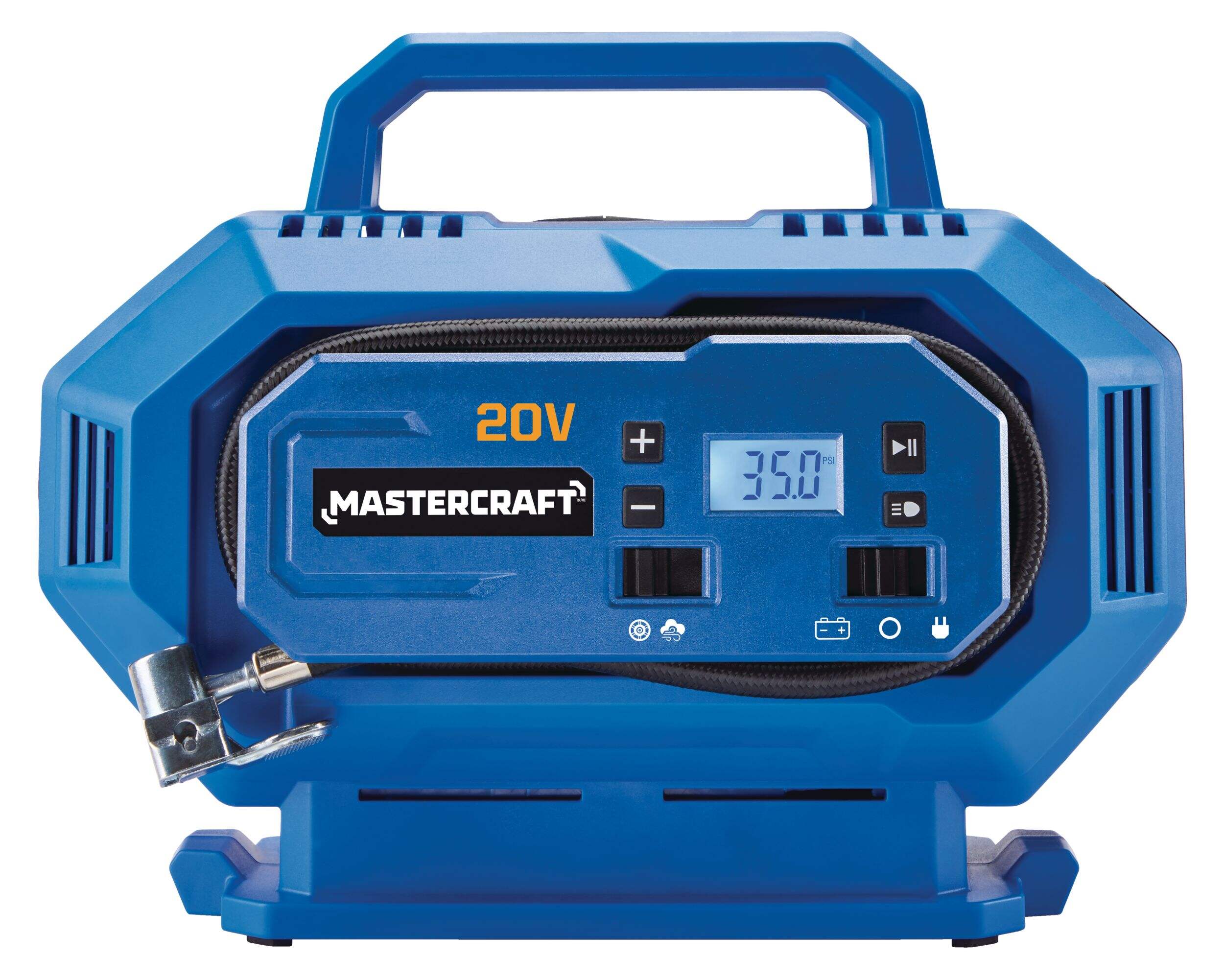 Introducing the Mastercraft 20V Max Lithium-Ion Cordless Dual Function Air Inflator with Gauge. This versatile tool is perfect for inflating tires, sports equipment, and more. With its dual function capability, it can handle both high-pressure and high-volume inflation tasks. The built-in gauge ensures accurate pressure readings, while the cordless design offers convenience and portability. Compatible with PWR POD batteries, this inflator is a must-have for any toolkit.
