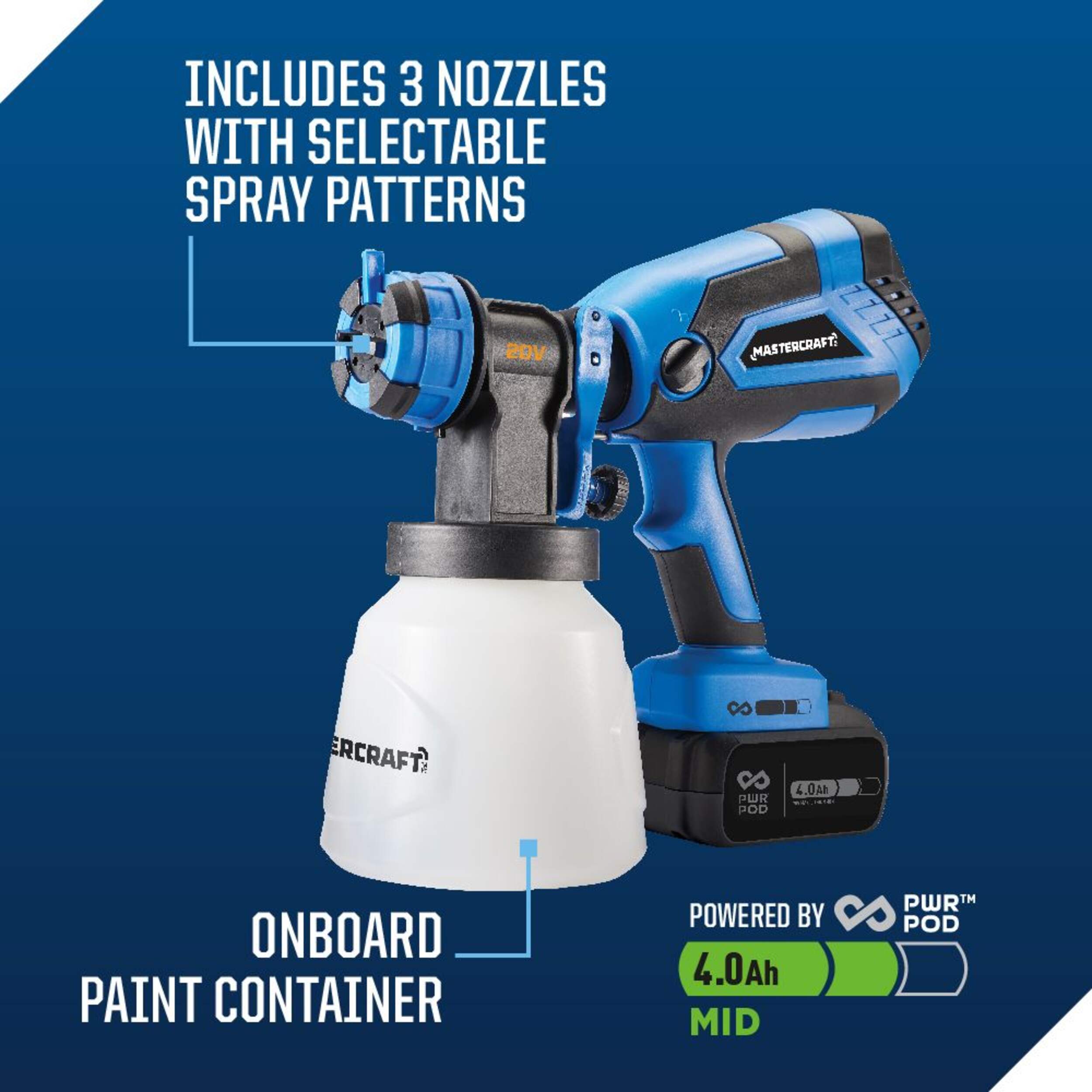 Apply paint quickly and efficiently with the help of the Mastercraft 20V Paint Sprayer. This paint gun features high-volume, low-pressure technology (HVLP) which helps evenly disperse the flow of paint with less risk of over-spraying or wasting paint. Controllable material flow allows the spray gun to atomize paint with a max flow of up to 12.1 L (3.2 gal) of paint per charge. Easy to set up and clean up, this paint sprayer comes with 3 paint nozzles which control the spray width opening, producing professional-grade results. You can apply the coat with a desired direction and width thanks to the 3 selectable spray patterns. An onboard paint container holds the paint, primer, stain, sealer, or varnish, while a viscosity cup helps test the ideal dilution ratio. This paint spray gun is powered by PWR POD, Canada’s ultimate universal battery system. PWR POD allows you to use the same battery to seamlessly power your yard work, home renovations, automotive projects, outdoor adventures, and more across exclusive brands like Mastercraft, Simoniz, Woods, and MotoMaster. This product includes a cordless paint sprayer, 3 nozzles (2.2 mm, 1.8 mm, 1.5 mm), a viscosity cup, a cleaning needle, a cleaning brush, a PWR POD 20V max (4.0 Ah) lithium-ion battery, and a 45W charger. This item includes a 3-year warranty.