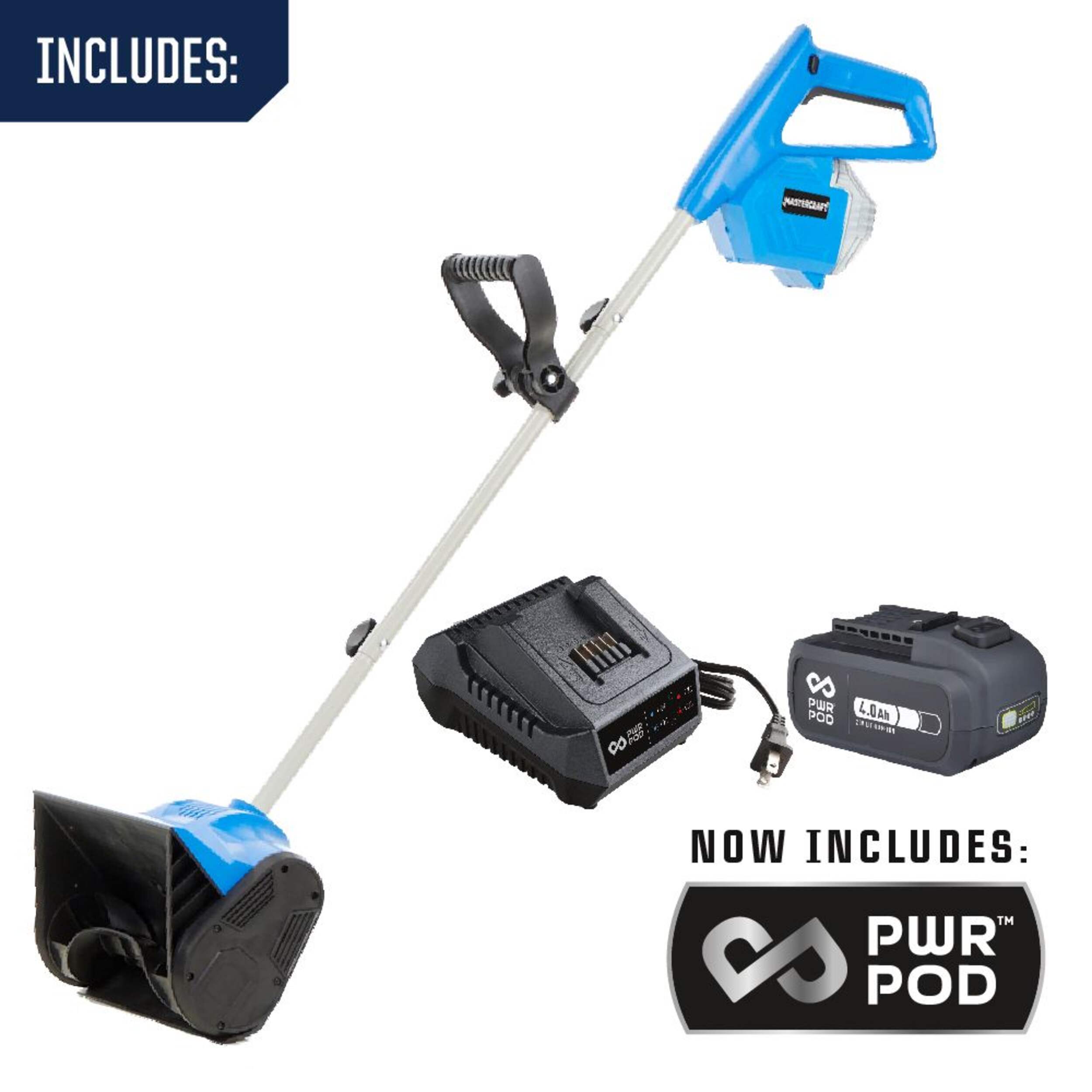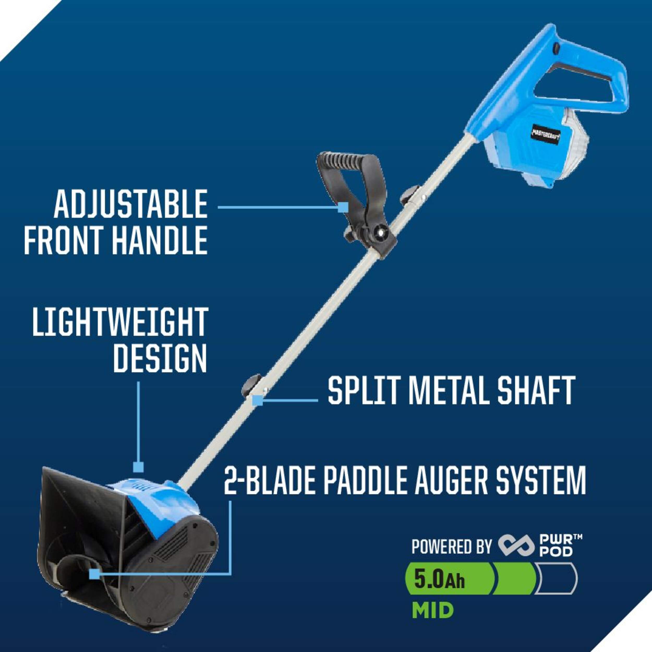 Skip the heavy lifting this winter and lean on the power and convenience of the Mastercraft 20V Electric Cordless Snow Shovel. The compact design and PWR POD 5.0Ah battery make it easier to clear your entrances, pathways and narrow, hard-to-access areas. At 11.5 lb (5.2 kg), this rechargeable snow shovel features a poly/plastic blade and is easy to maneuver and store when not in use. The same battery can be used in other Mastercraft cordless tools.