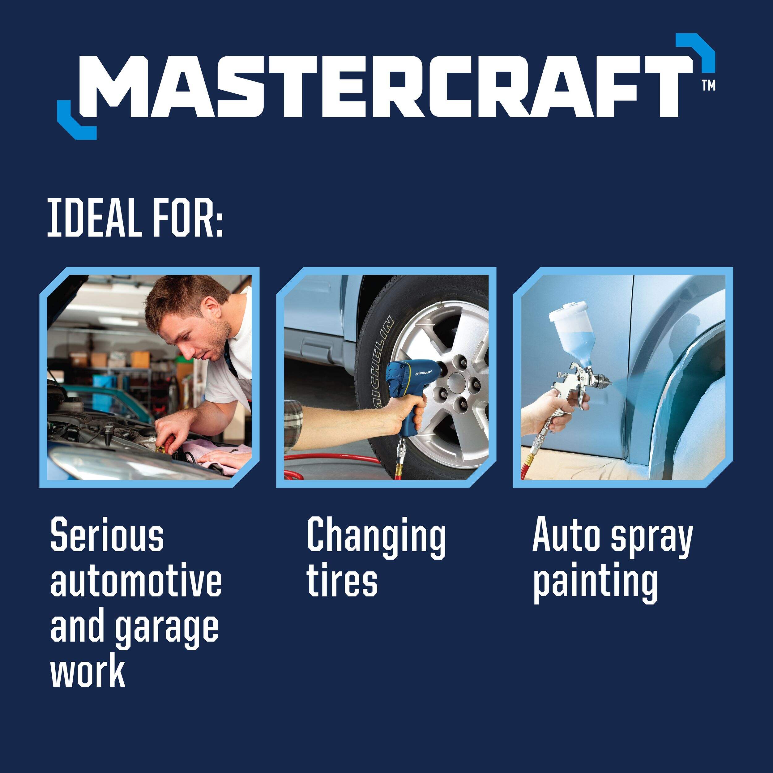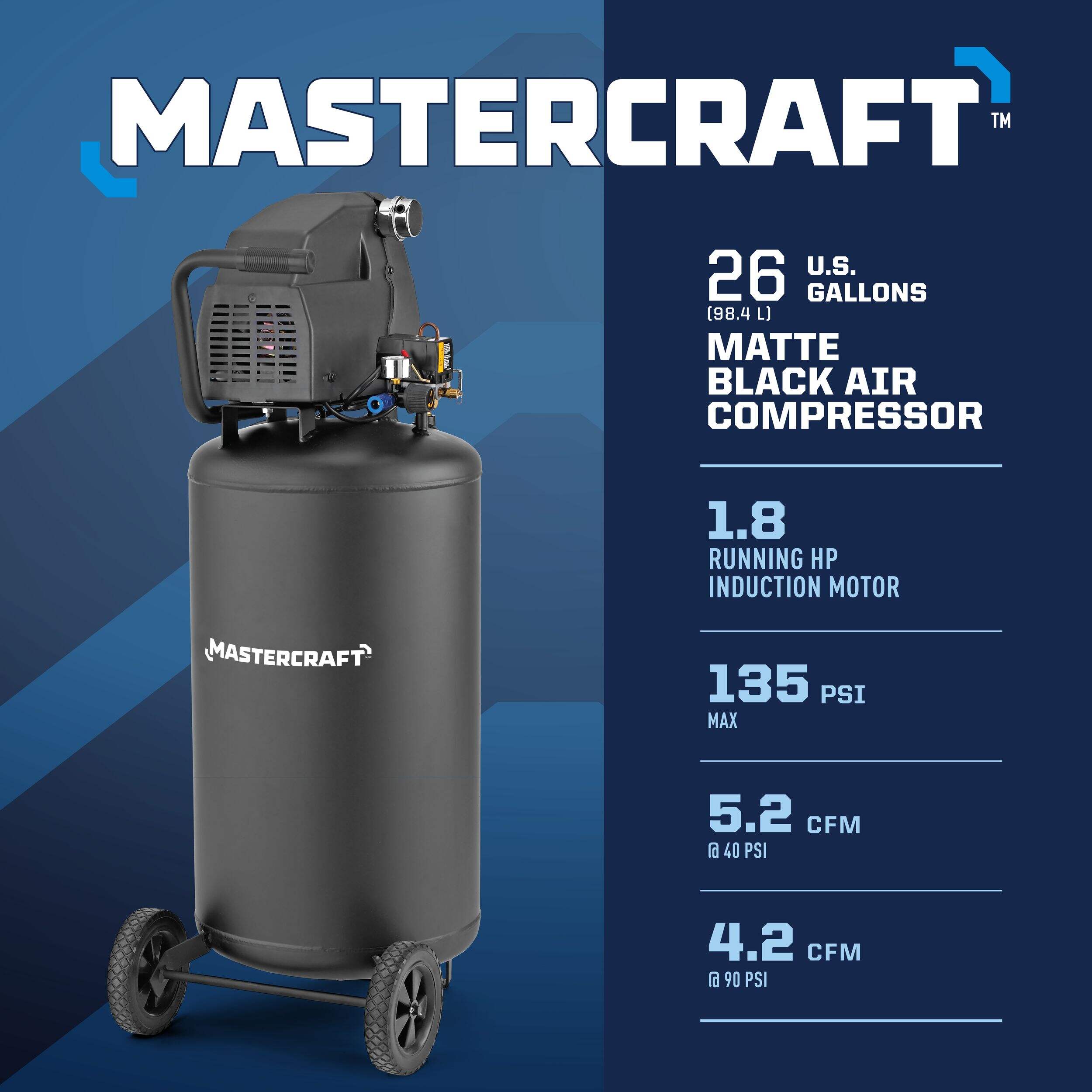 Tackle DIY jobs around the house or knock out work tasks with ease using the Mastercraft Oil-Free Air Compressor. Its oil-free pump and durable metal air filter reduce upkeep, while the 1.8 HP induction motor packs enough punch to run your nailers, wrenches, and other air-hungry tools. Built with quality touches, this 26-gallon air compressor is ready for years of reliable service in your garage, workshop, or job site.