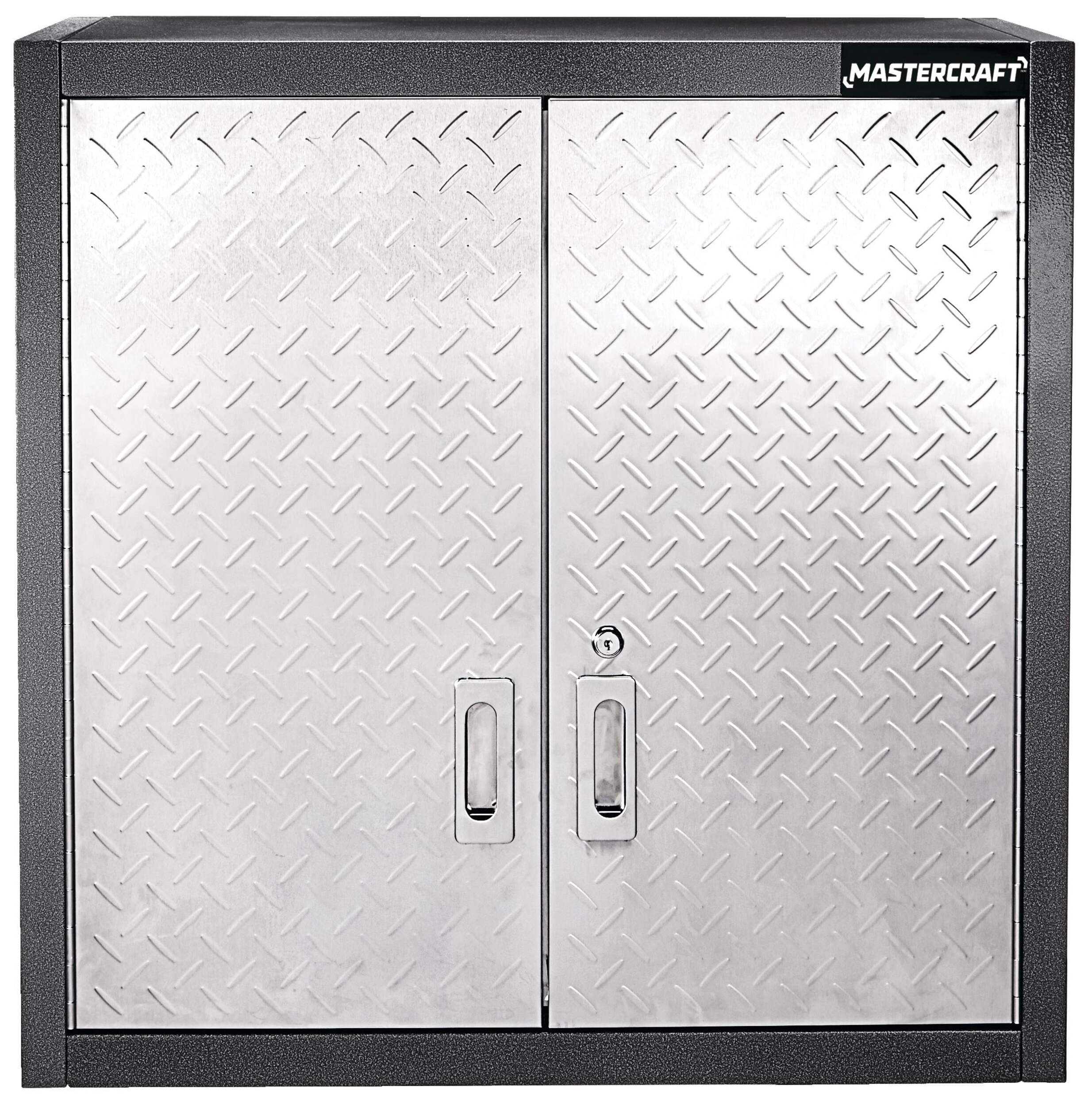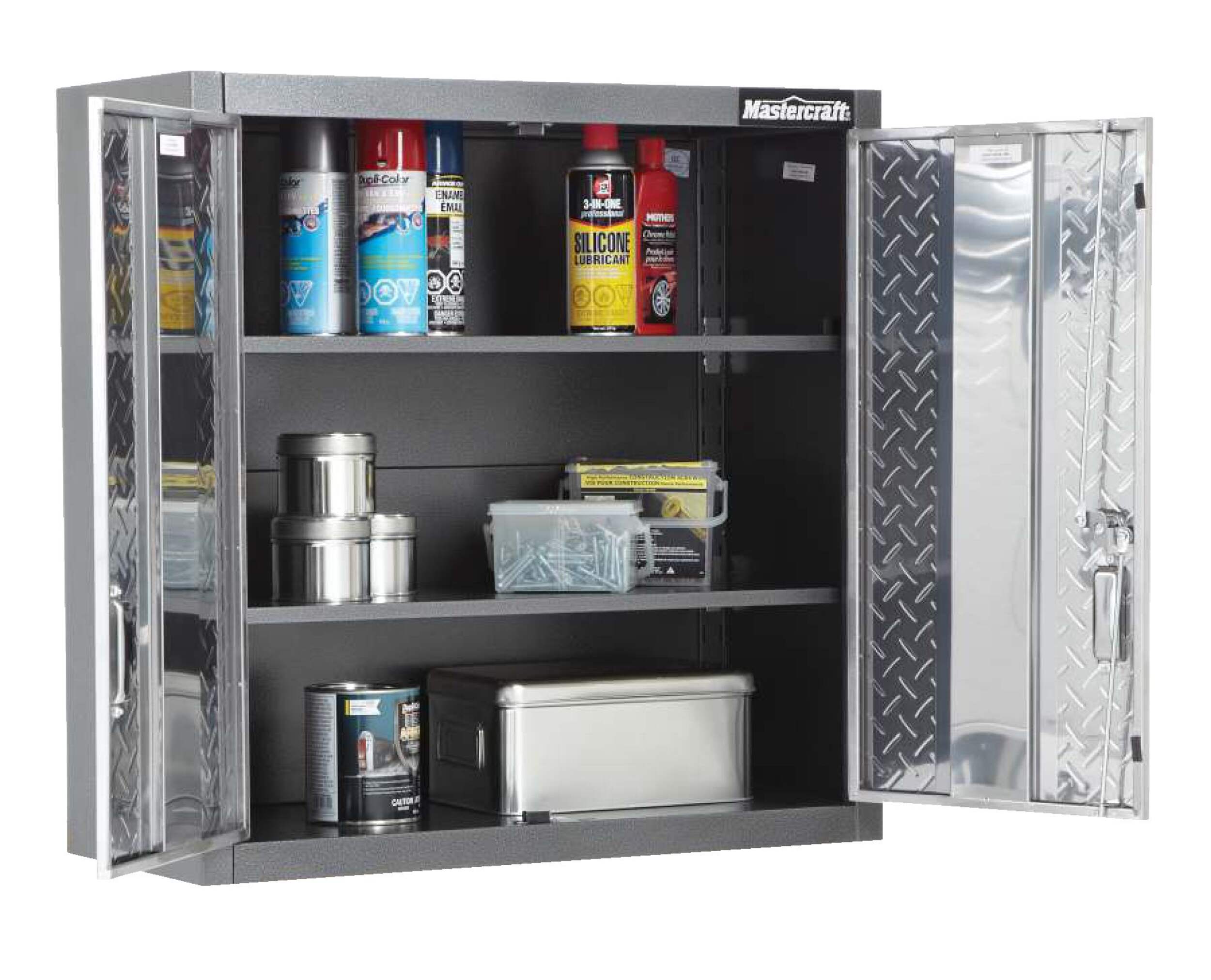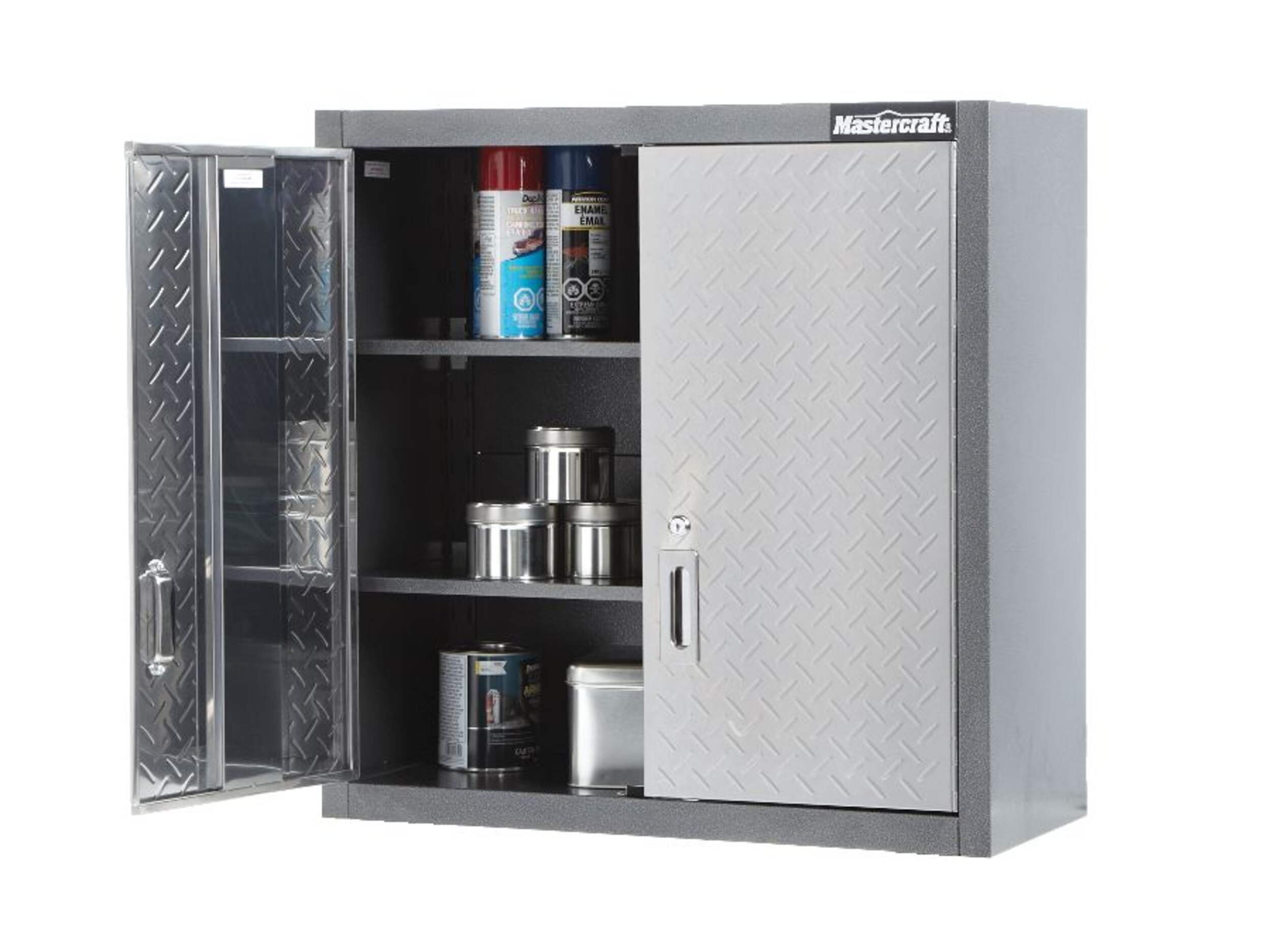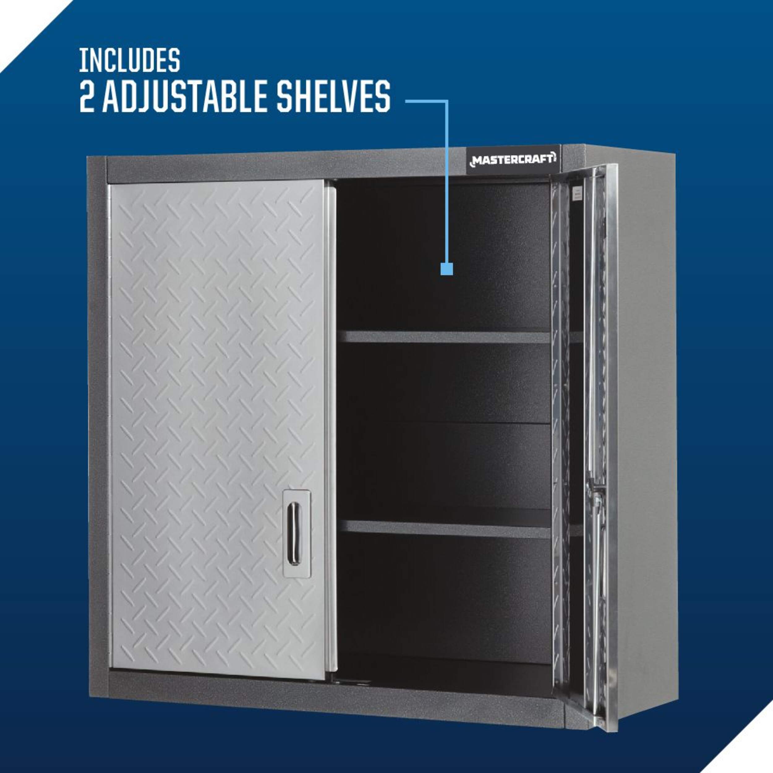 Store workshop essentials behind closed doors with the Mastercraft 2-Door Wall Cabinet. Ideal for garages, basements and storage rooms, this durable all-metal wall unit features two adjustable shelves and locking doors. The sturdy powder-coated steel construction and stainless steel door fronts are built to last and have a sleek industrial finish. The 12-inch (30.4 cm) depth and impressive weight capacity keep power tools, solvents and other valuable or hazardous items safe and secure.