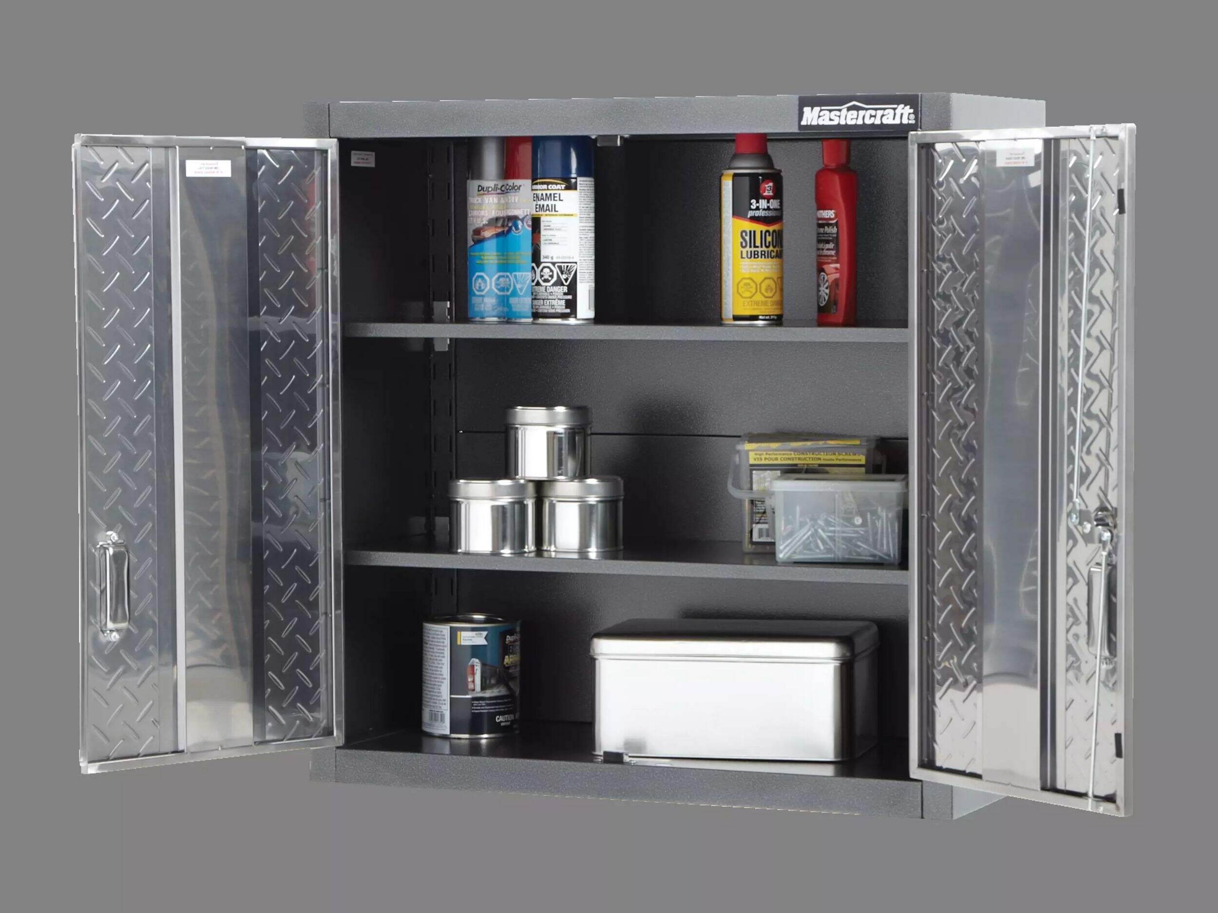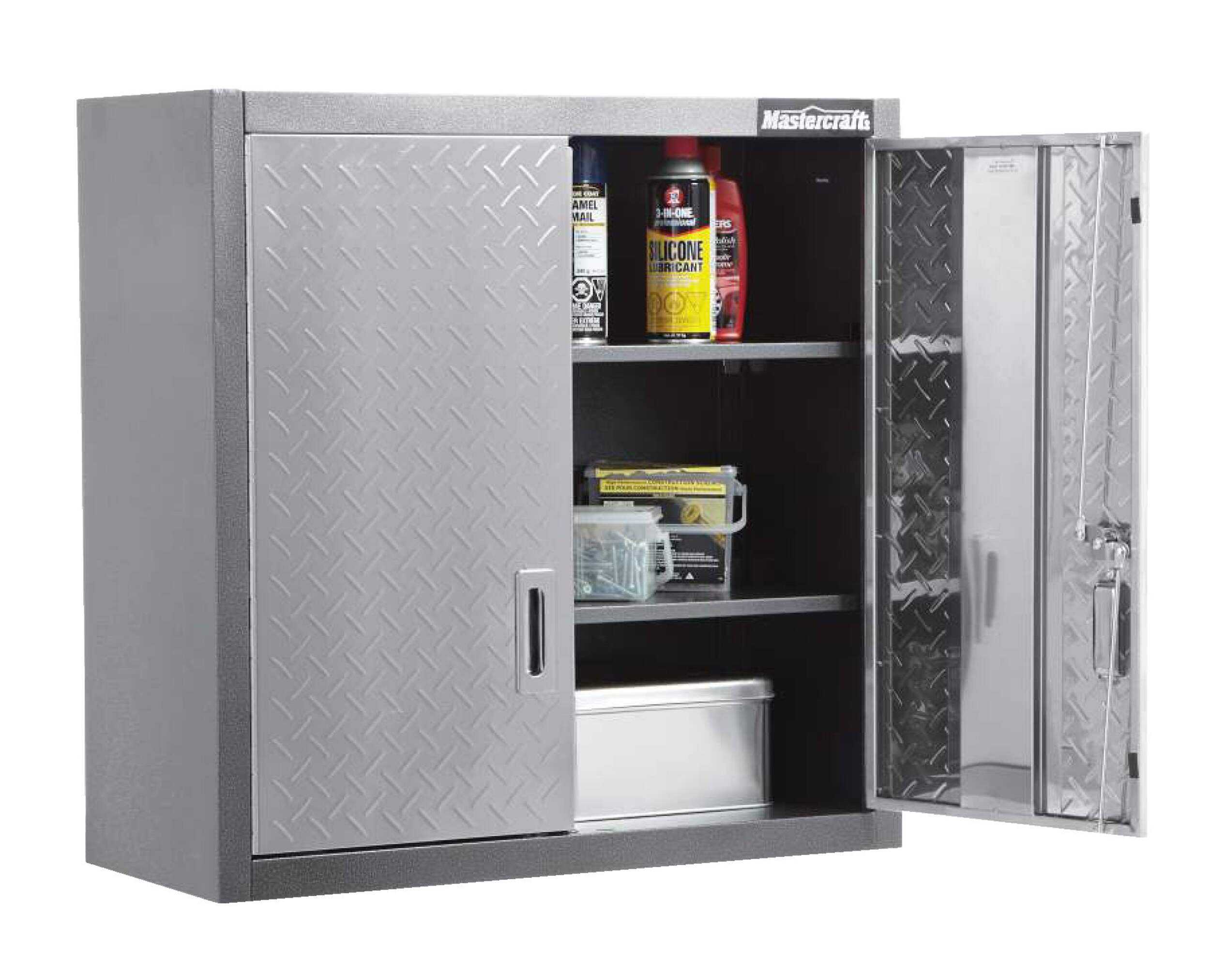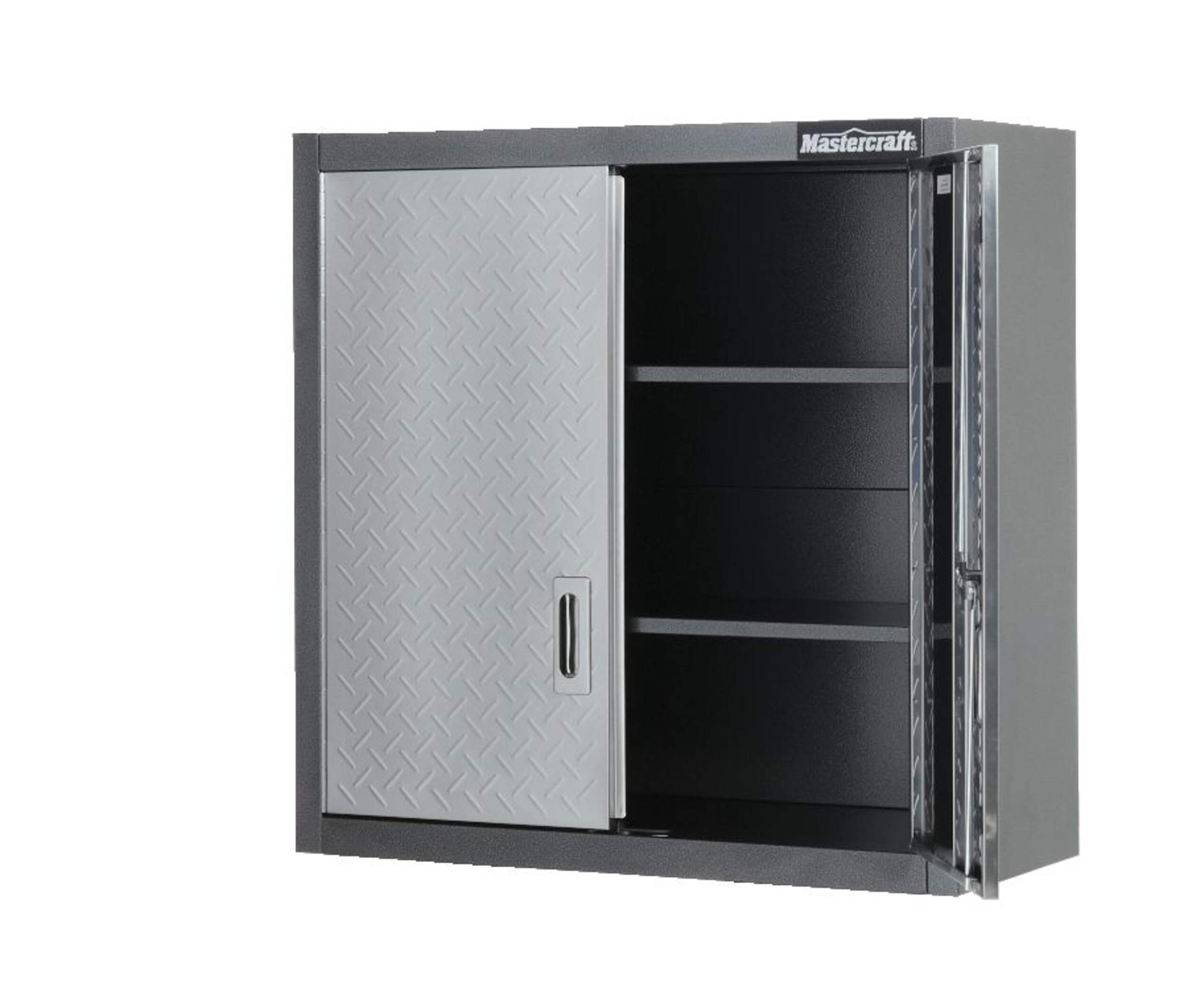 Store workshop essentials behind closed doors with the Mastercraft 2-Door Wall Cabinet. Ideal for garages, basements and storage rooms, this durable all-metal wall unit features two adjustable shelves and locking doors. The sturdy powder-coated steel construction and stainless steel door fronts are built to last and have a sleek industrial finish. The 12-inch (30.4 cm) depth and impressive weight capacity keep power tools, solvents and other valuable or hazardous items safe and secure.