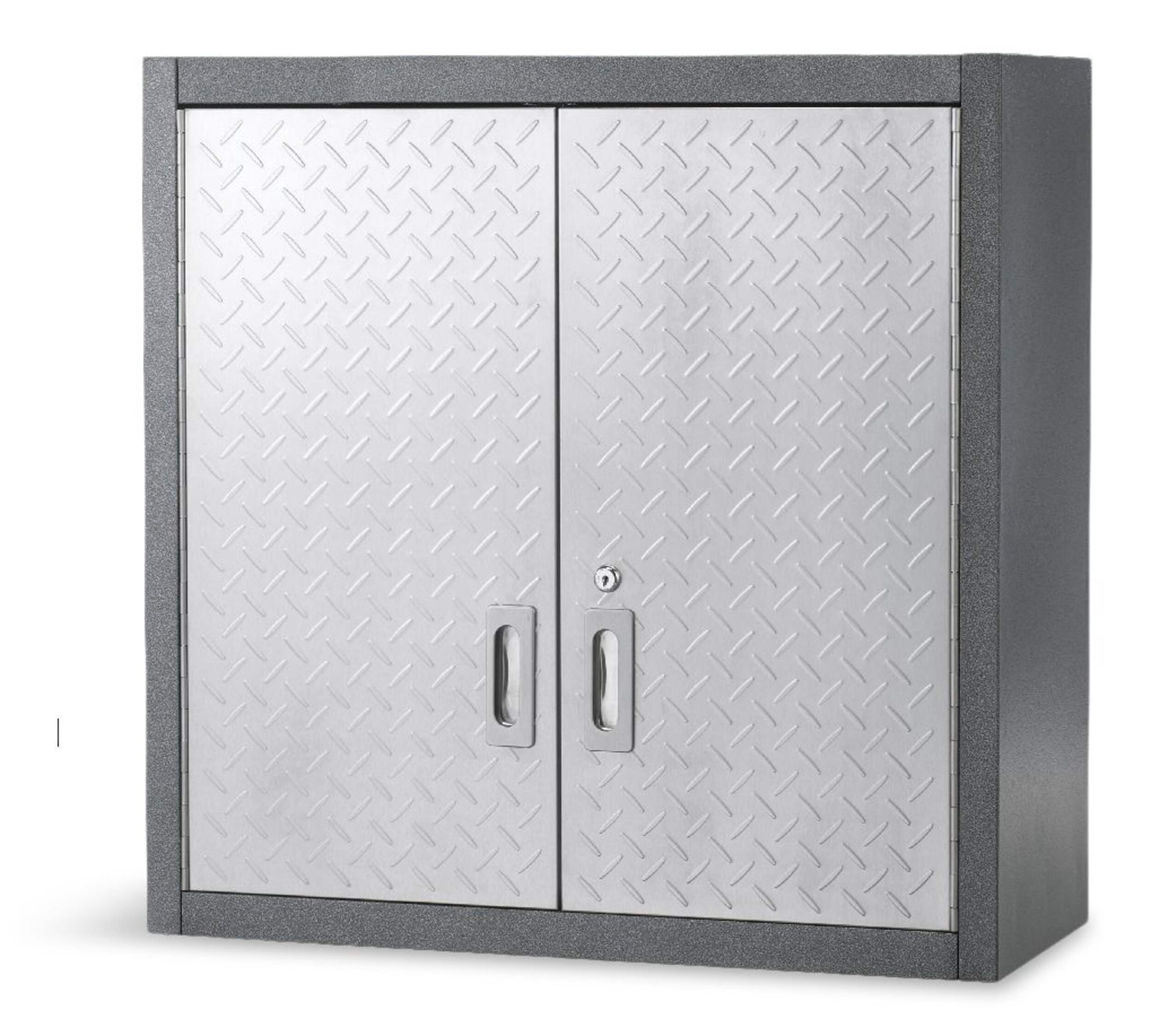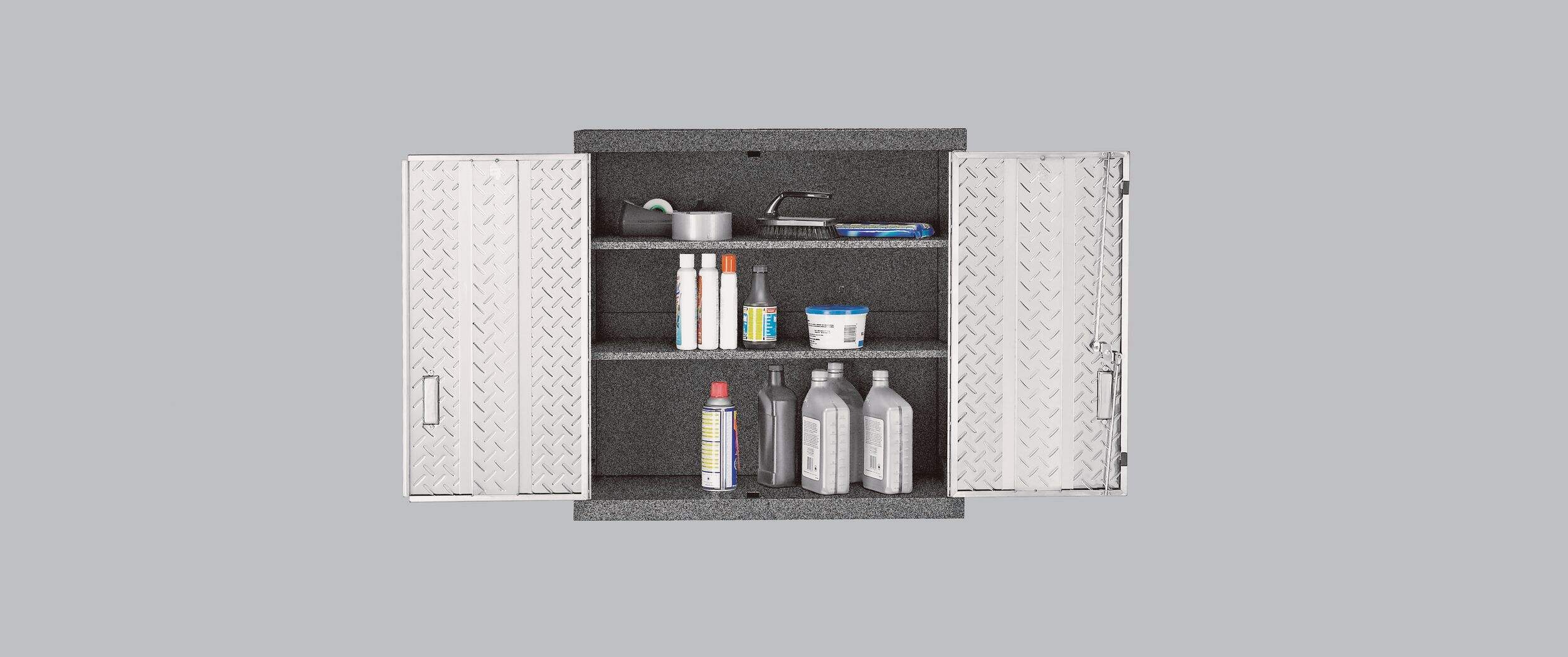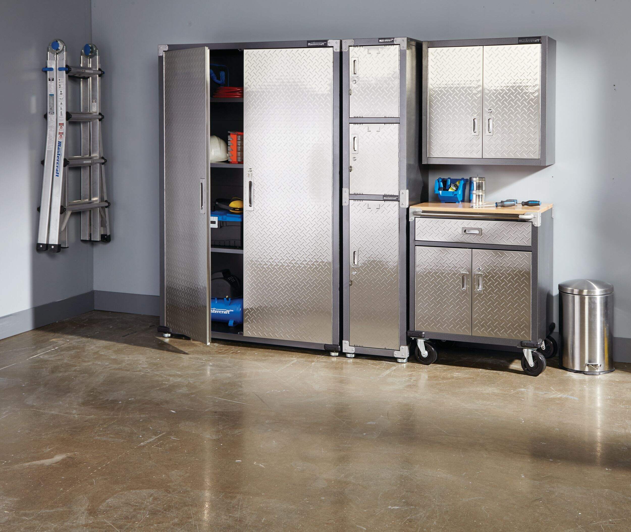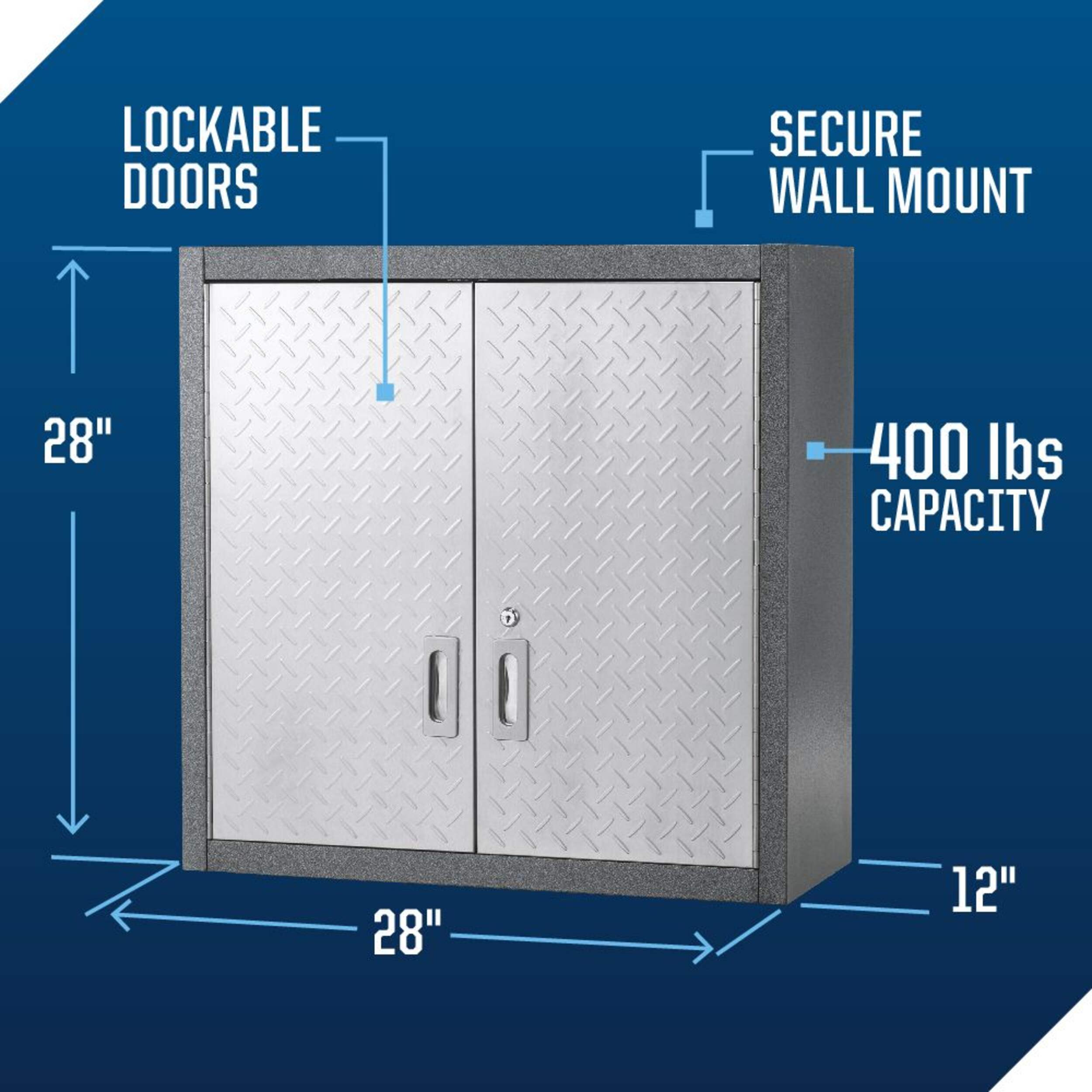 Store workshop essentials behind closed doors with the Mastercraft 2-Door Wall Cabinet. Ideal for garages, basements and storage rooms, this durable all-metal wall unit features two adjustable shelves and locking doors. The sturdy powder-coated steel construction and stainless steel door fronts are built to last and have a sleek industrial finish. The 12-inch (30.4 cm) depth and impressive weight capacity keep power tools, solvents and other valuable or hazardous items safe and secure.
