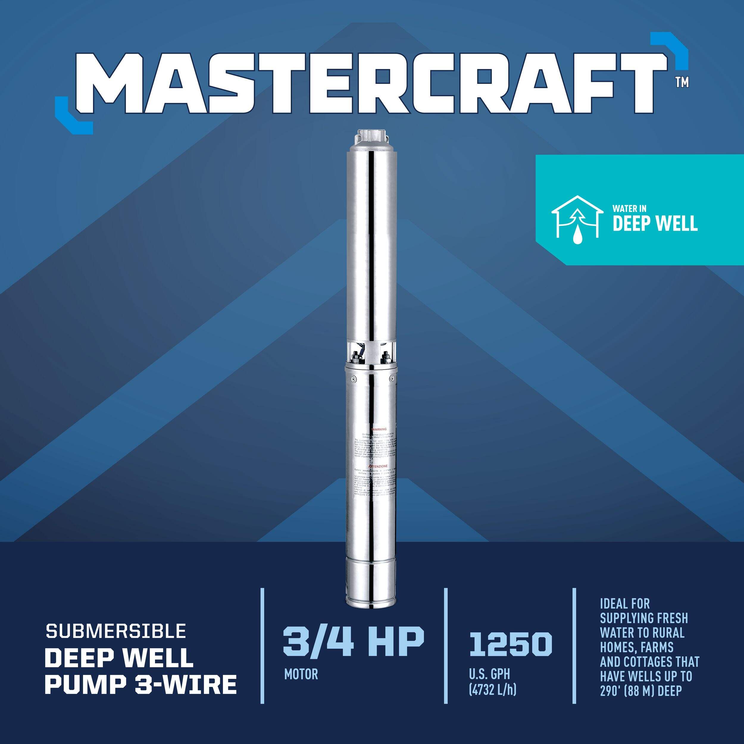 The Mastercraft 3/4 HP Submersible 3-Wire Motor Deep Well Water Pump with Box is ideal for supplying fresh water to rural homes, farms and cottages that have wells up to 290’ (88m) deep