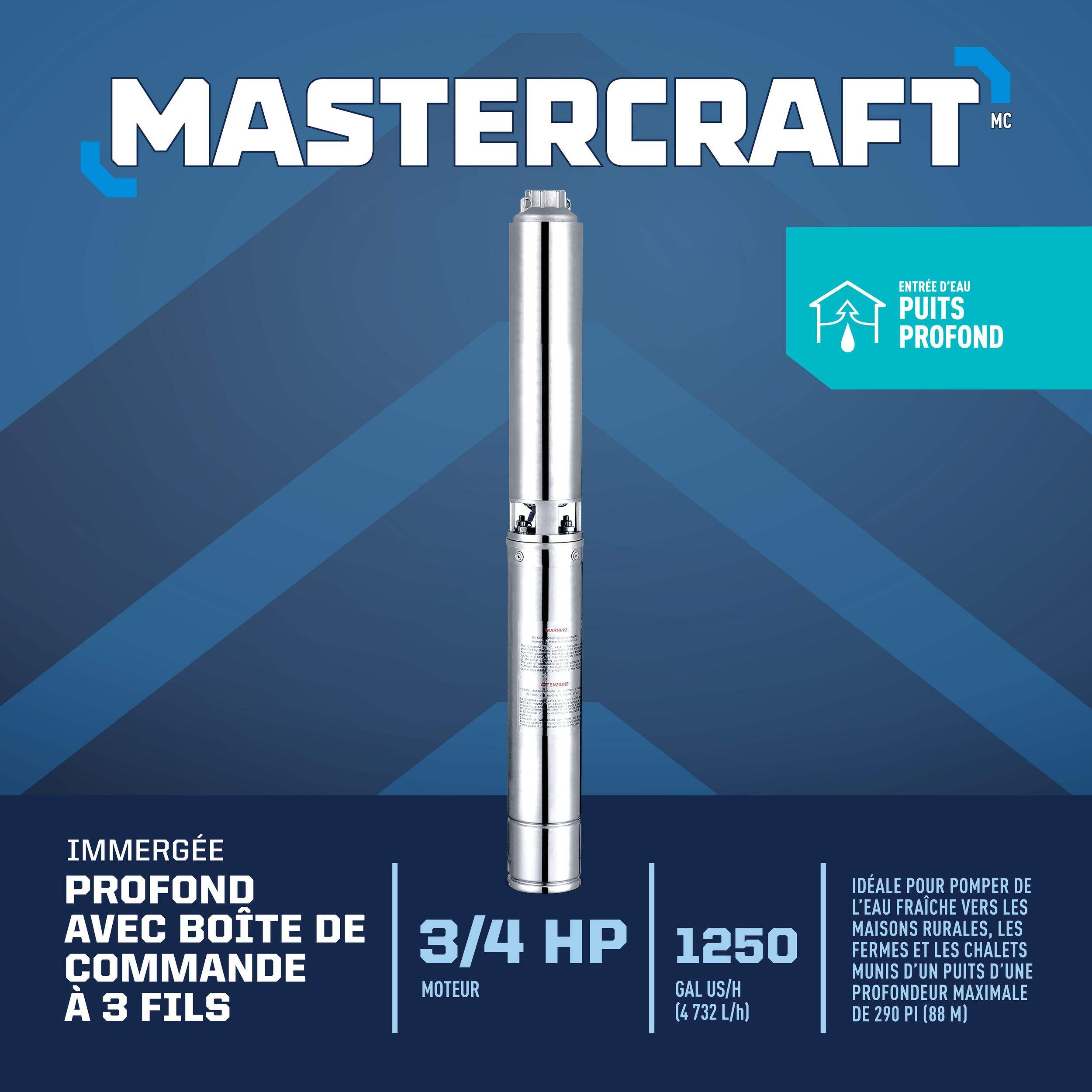 The Mastercraft 3/4 HP Submersible 3-Wire Motor Deep Well Water Pump with Box helps lift potable water from deep wells. Designed for permanent installation, this submersible well water pump is ideal for supplying fresh water to rural homes, farms and cottages that have wells up to 290’ (88m) deep. Powered by a 3/4 HP motor, this well water pump has a maximum flow rate of 1250 GPH (4732 L/h). Built-in thermal overload protection prevents the motor from overheating by switching off the deep well pump before damage is caused. This submersible well pump has a built-in check valve which prevents backflow and maintains system pressure. Stainless-steel construction brings lasting durability to this well pump, while a built-in suction screen and discharge head prevent clogging. A foot valve, PVC elbows, PVC pipes, male PVC adaptors, female PVC adaptors and well seals (sold separately) may be needed in order to install this pump. This product includes a 3-wire pump, a control box and a 10’ (3m) power cord.