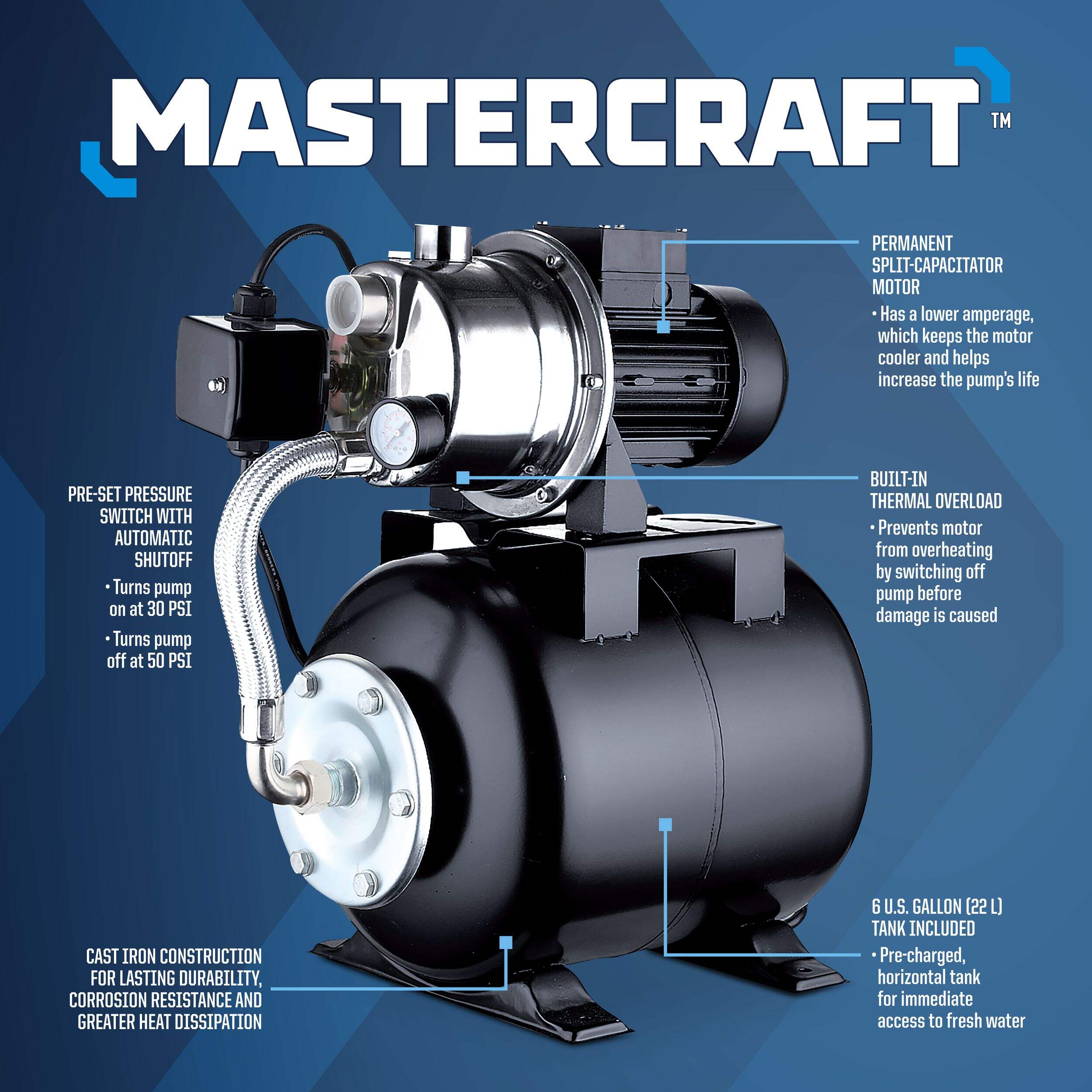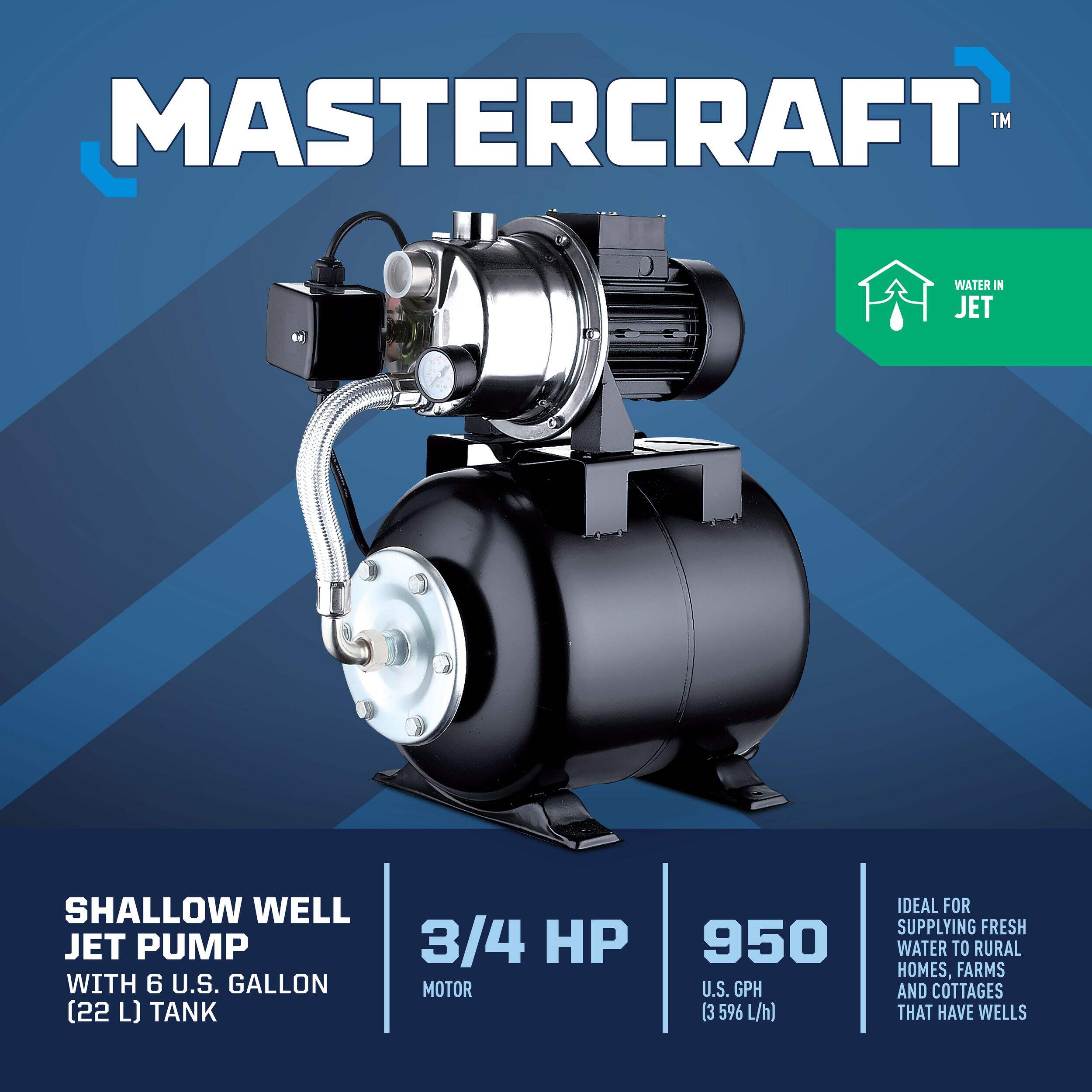 The Mastercraft 3/4 HP Stainless Steel Shallow Well Jet Pump is the perfect solution for providing fresh water to rural homes, farms, and cottages with wells. Powered by a 3/4 HP motor, this high-performance jet pump ensures reliable water supply for your needs. The pump is highly durable and corrosion-resistant, offering years of dependable use. This jet pump includes a pre-charged horizontal tank, providing immediate access to fresh water when needed.