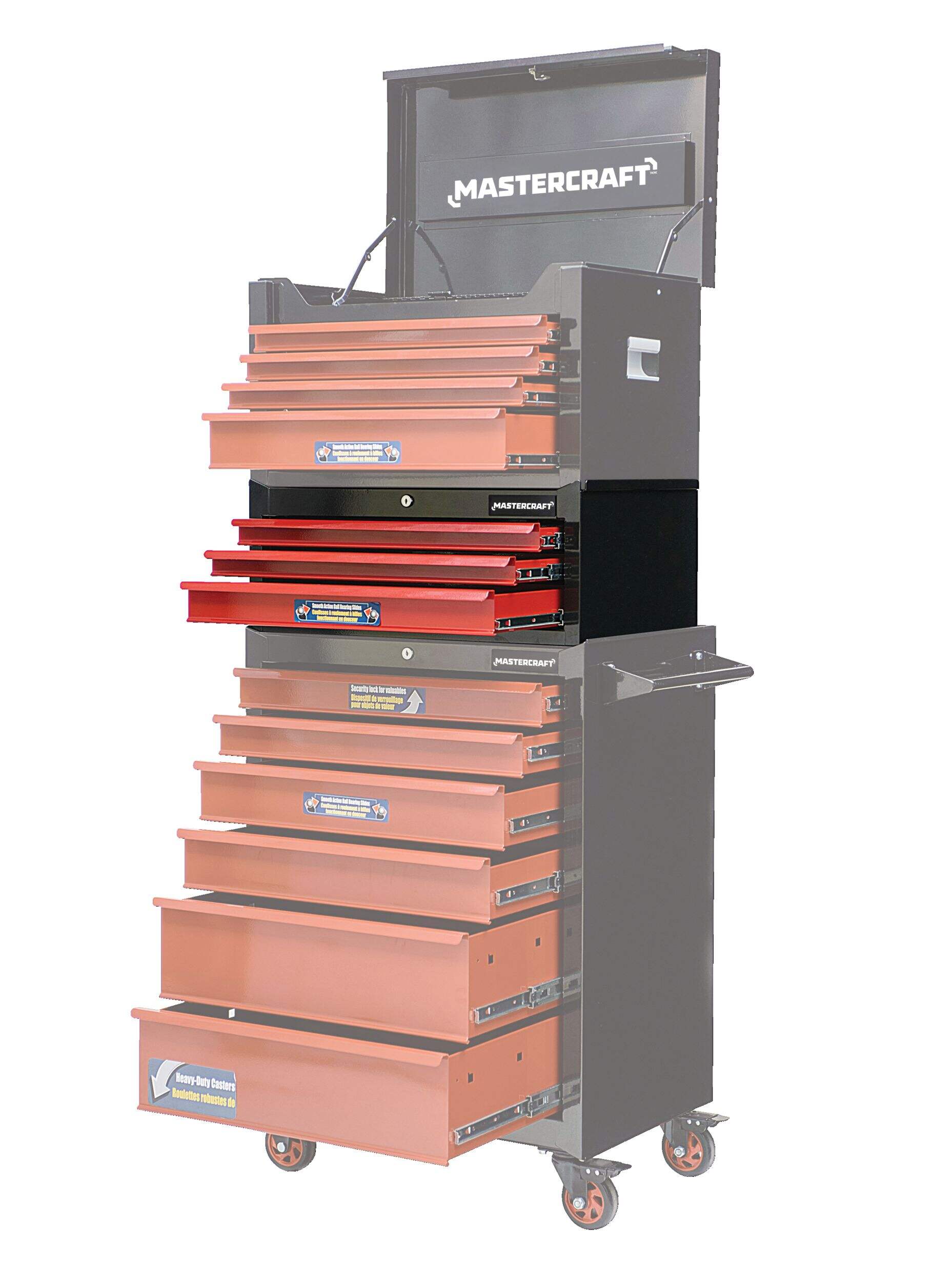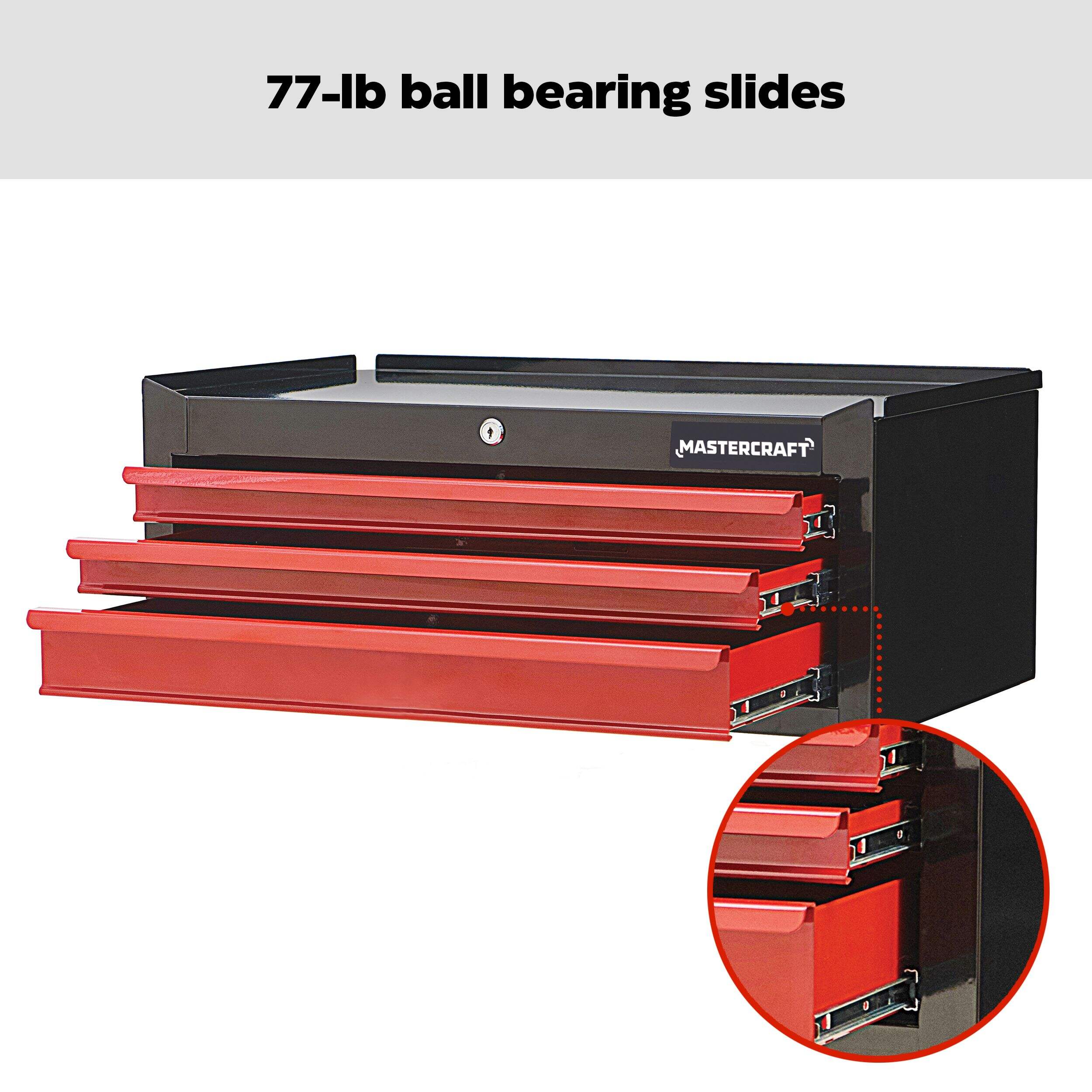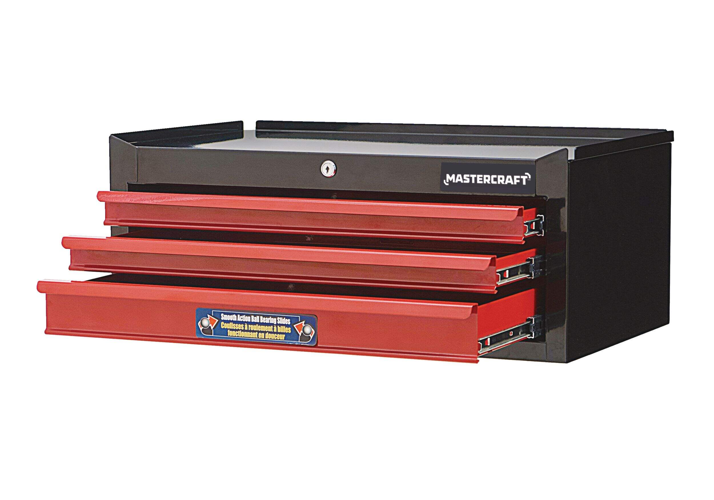 The Mastercraft 26" 3-Drawer Intermediate Tool Chest in black and red is designed to meet your workshop organization needs. The chest can support a total capacity of 400 lb. The spacious top of this tool chest can double as a workspace, and it can be easily stacked with other Mastercraft storage units for added functionality. Available in a stylish black and red colour combination, it’s a perfect blend of form and function.