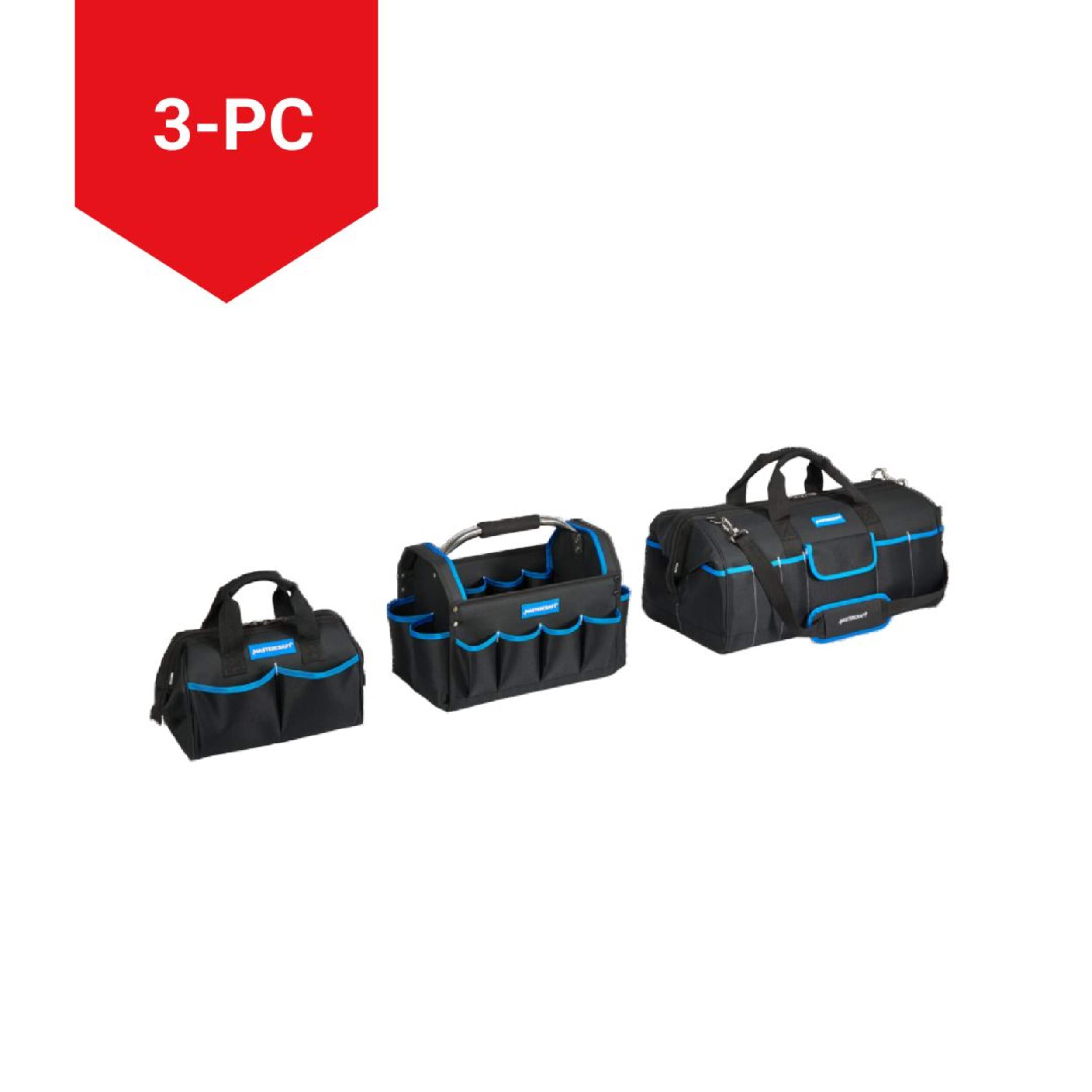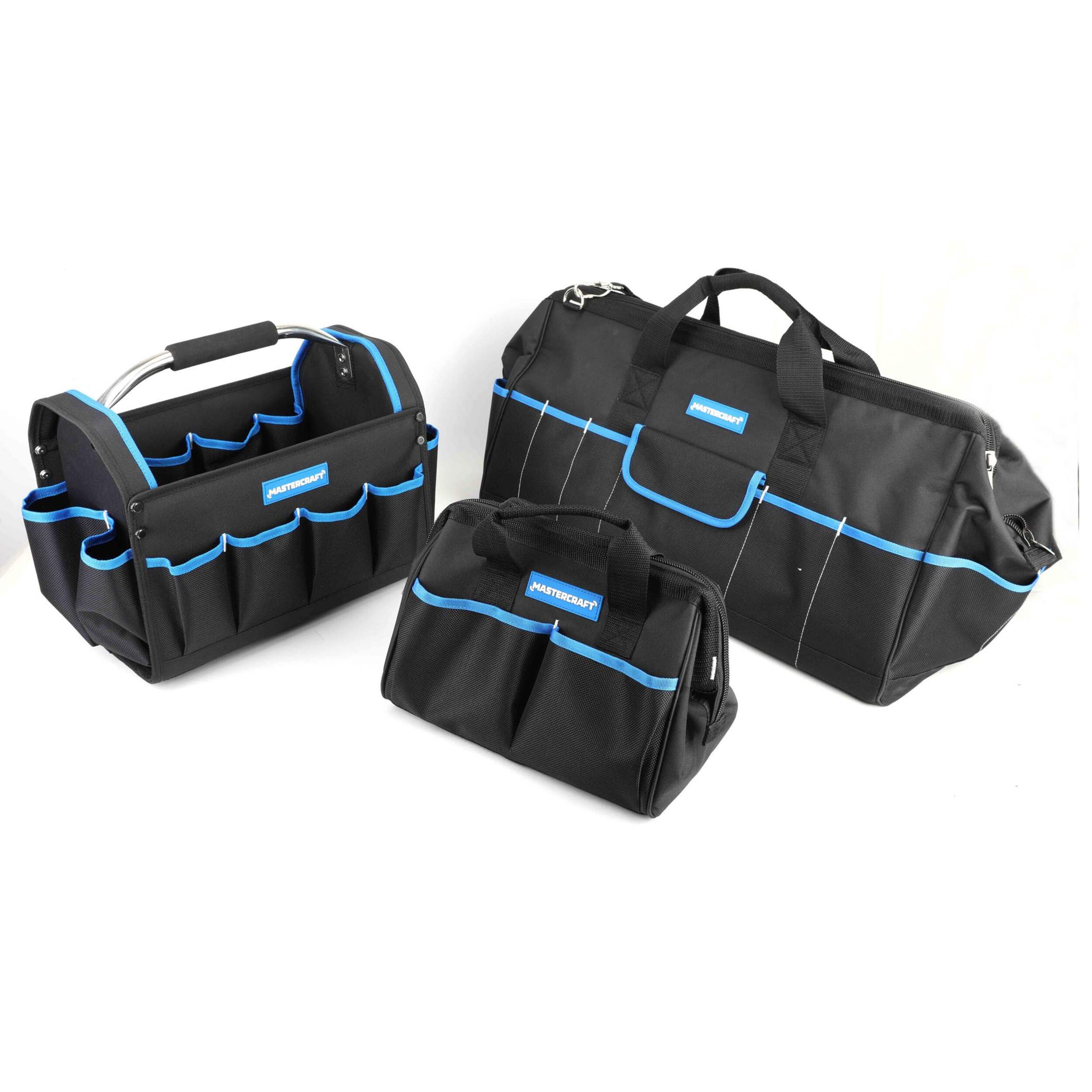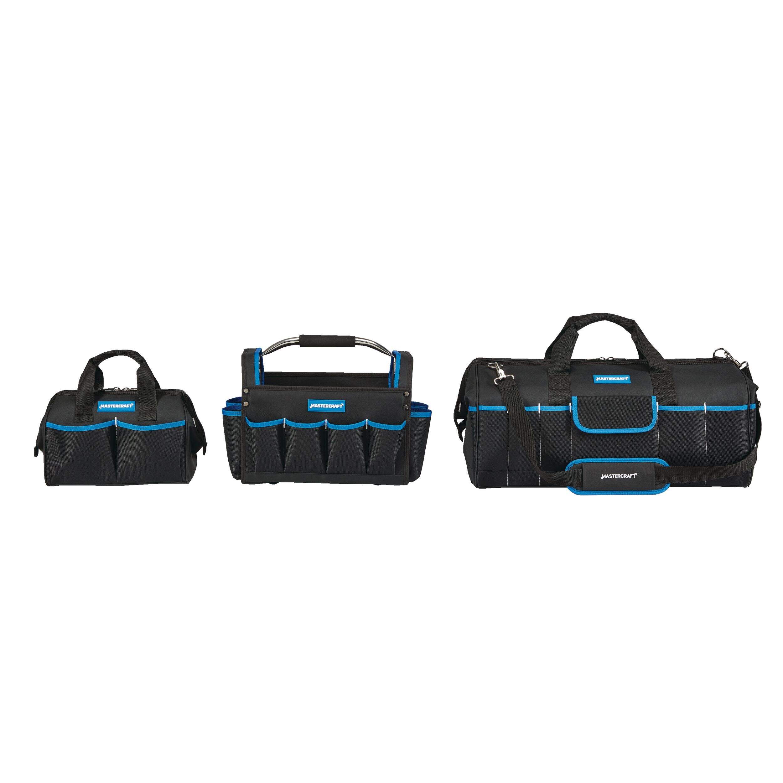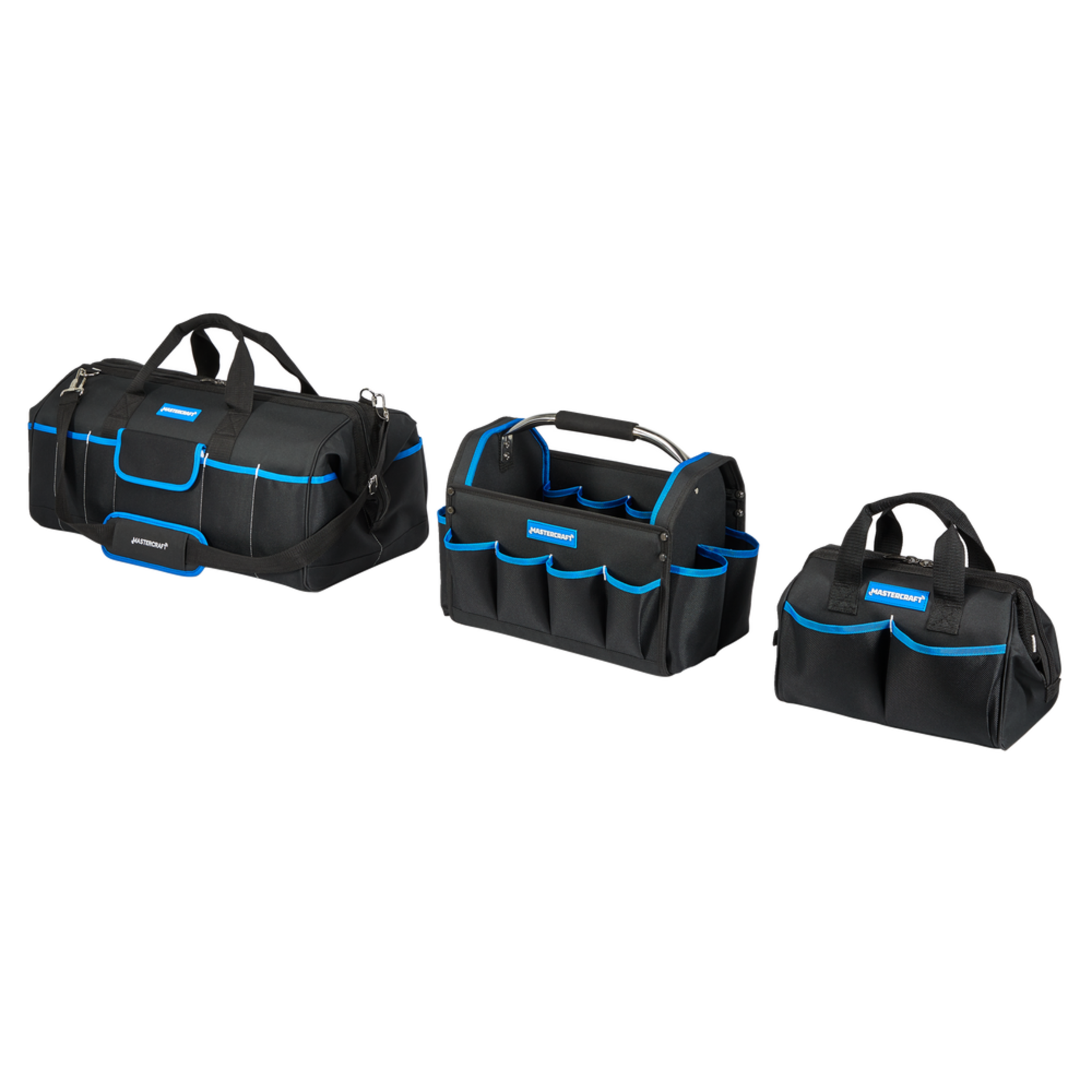 The Mastercraft 3-Piece Tool Bag Combo offers versatile storage with three tool bags of varying sizes. This set includes a small tool bag, an open-top tote, and a duffel-sized tool bag, each designed for immediate use. With a combination of internal and external pockets, these bags help keep your tools and accessories organized. The wide-mouth openings provide easy access to your gear, while the reflective pattern ensures high visibility in any workspace.