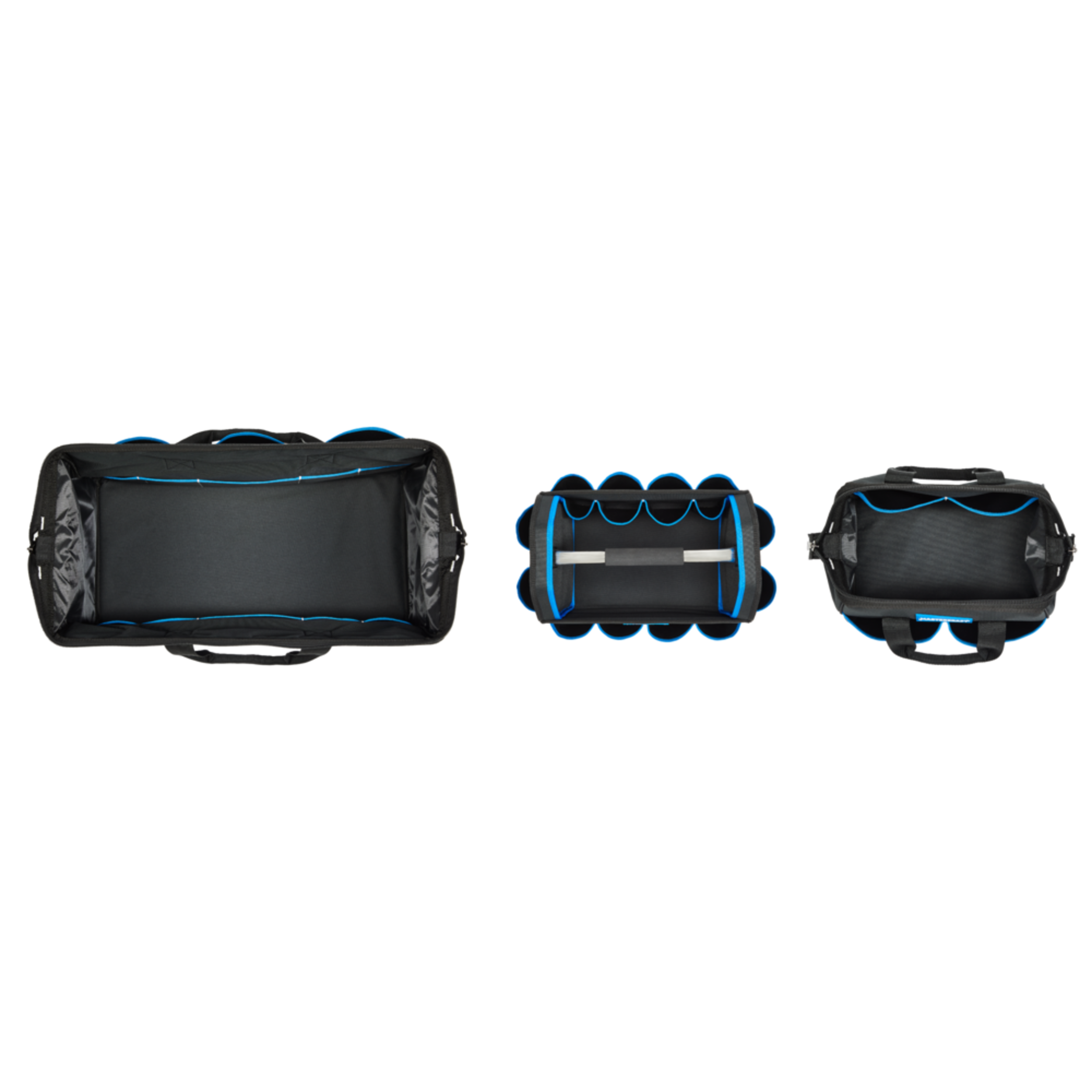 24" (60 cm) tool bag has large main compartment, 13 external pockets, 10 internal pockets, dual-zipper top, and padded shoulder strap