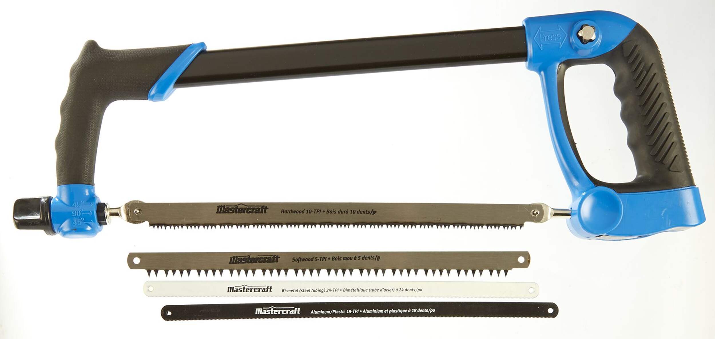 The Mastercraft 4-in-1 Hacksaw is built with an easy-to-use knob for quick adjustments to blade positions, achieving controlled tension, and moving blades from 0, 45, and 90°