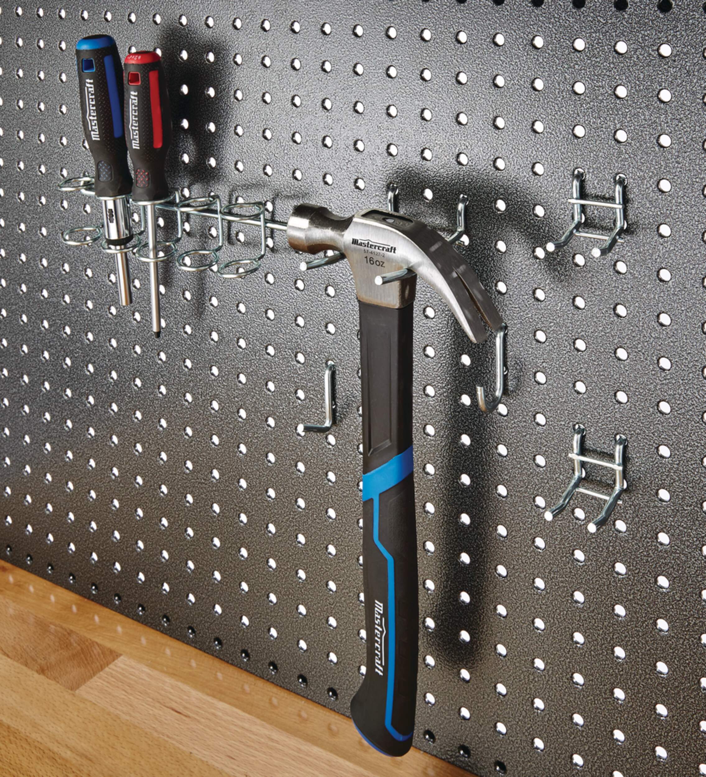 Get the ideal place to craft, build and create in comfort with the Mastercraft 4-Drawer, 1-Door Wooden Top Workstation + Cabinet with Pegboard and Wheels. The steel cabinet provides durable storage for tools and supplies, while the wooden worktop gives you ample space to spread out projects. Four sturdy drawers offer organized storage for parts and pieces, and the adjustable shelf gives you extra surfaces for laying out components. The pegboard and hooks provide places to hang specialty tools and keep small items within easy reach. Plus, the included wheels make it easy to roll the cabinet out of the way or into your workspace when needed.