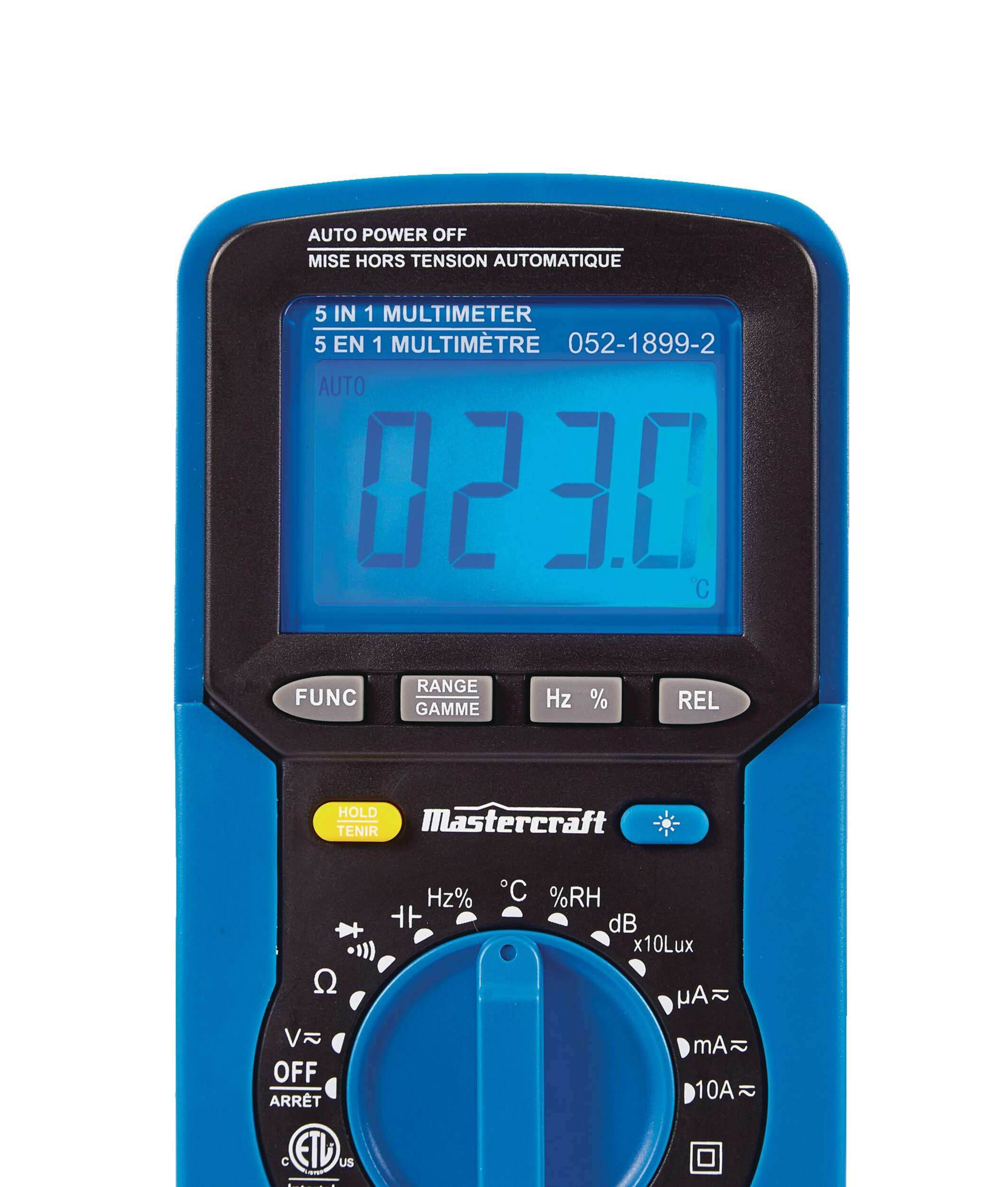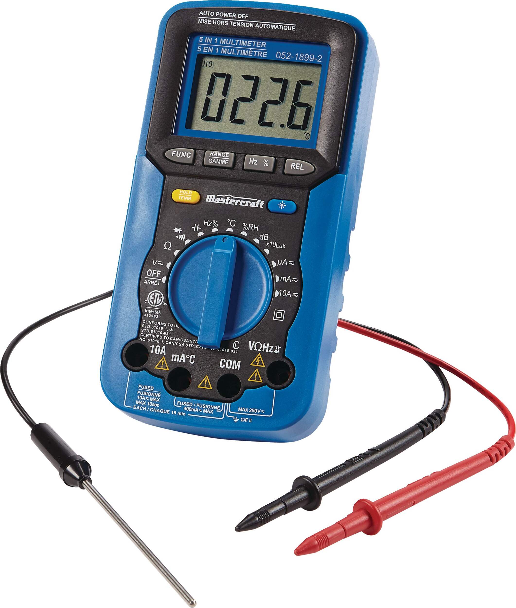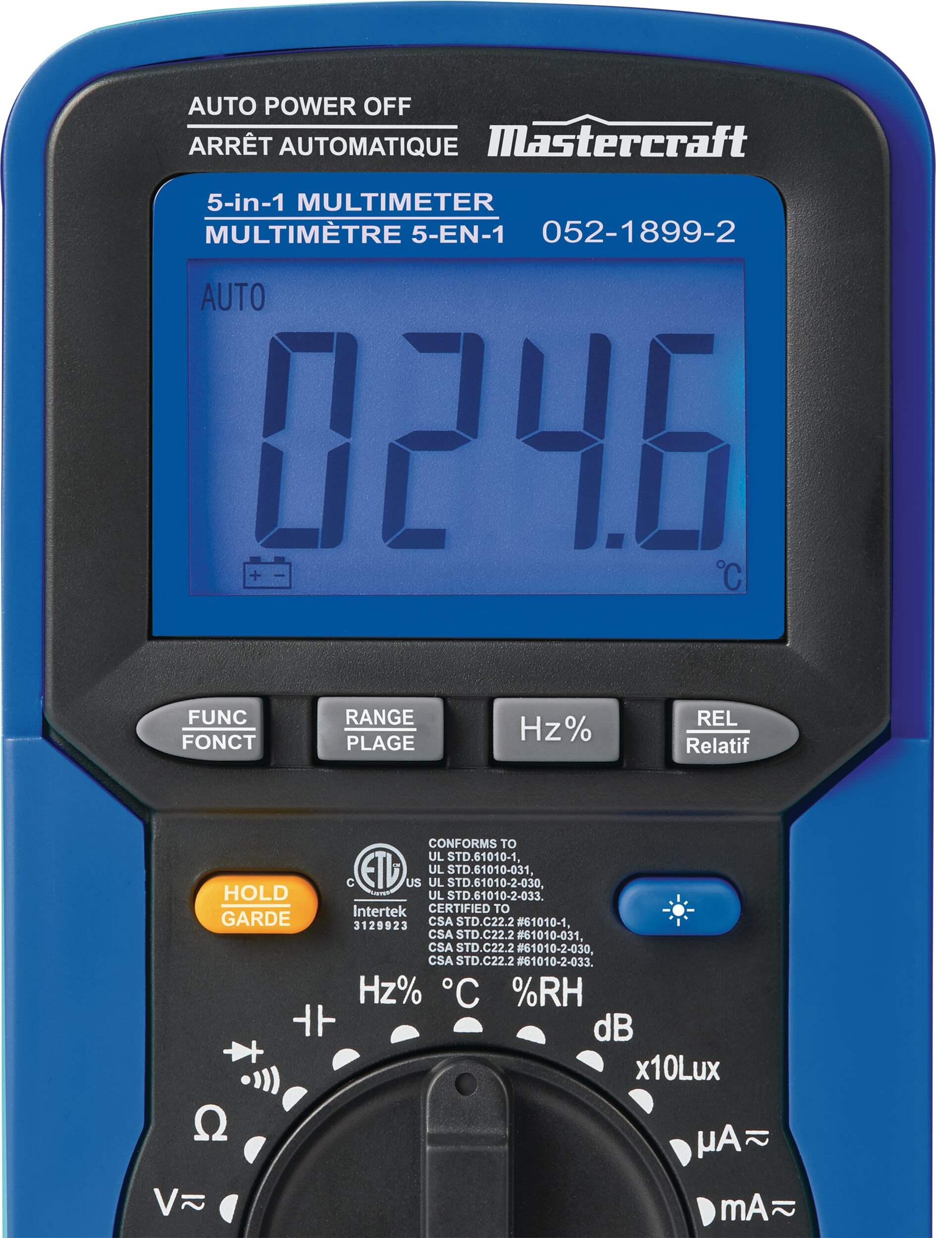 The Mastercraft 5-in-1 Digital Multimeter offers 14 functions, including measuring resistance, capacitance, frequency, diode, continuity, and more. It can also measure AC/DC voltage and current, providing versatile functionality for various tasks. It has a large backlit LCD screen for easy reading in low-light conditions and a 3999-count resolution for accurate measurements. This multimeter also features a hold button to retain data after testing for added convenience.